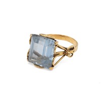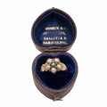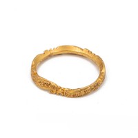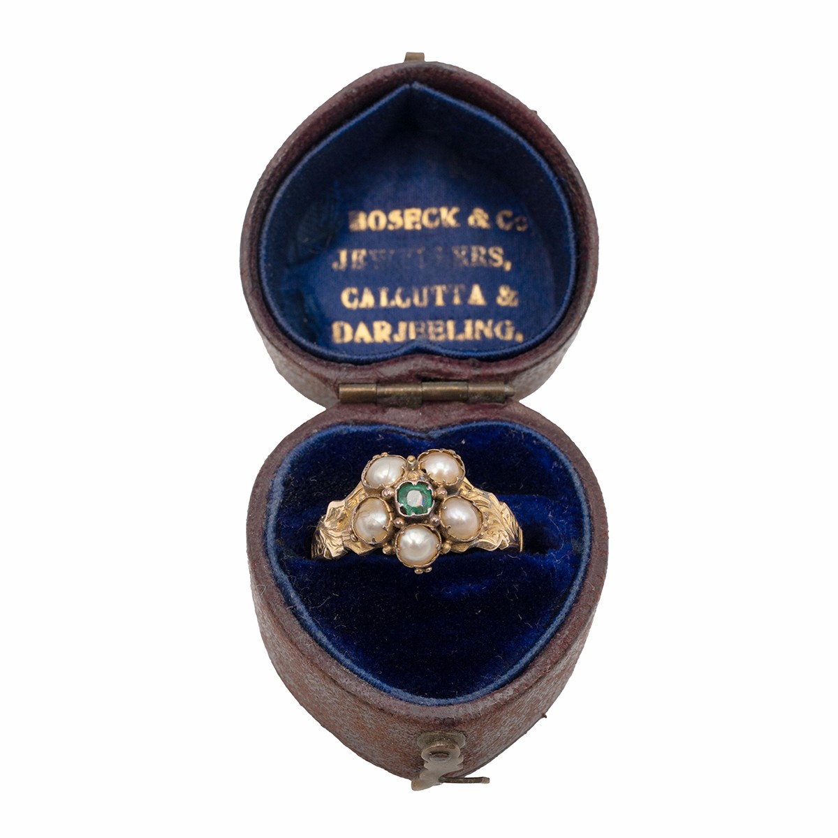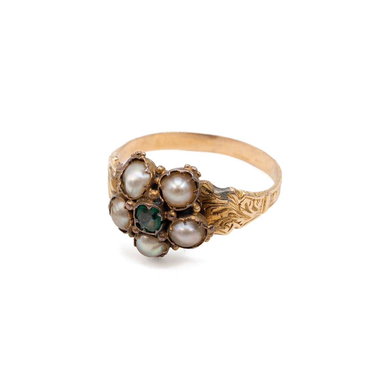 A 19th-century 15ct gold (tested) pearl and emerald set ring, the central stone flanked by five pearls with foliate decorated shoulders, size M, weight 2.1 grams.