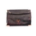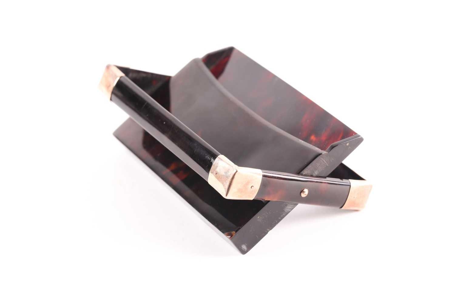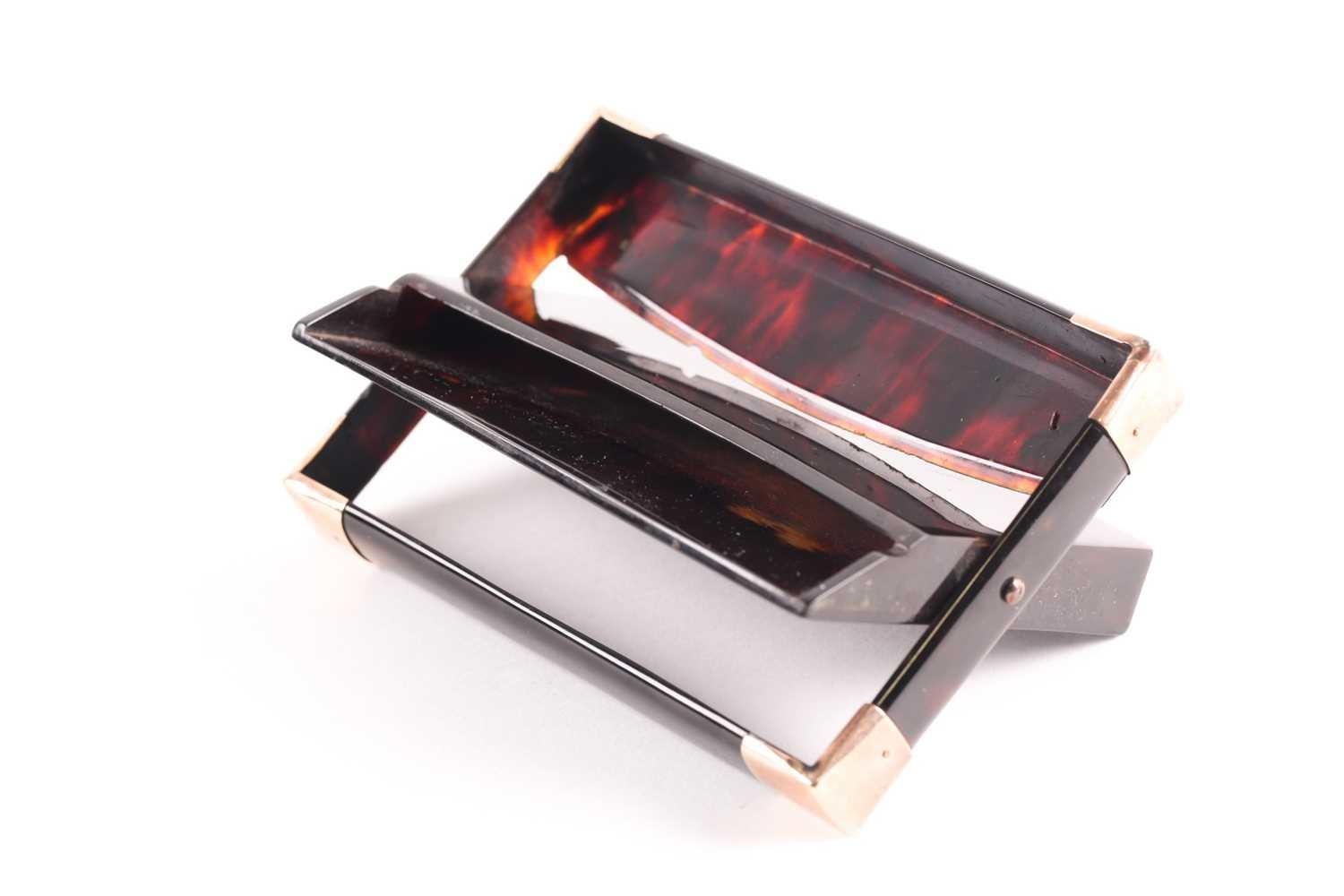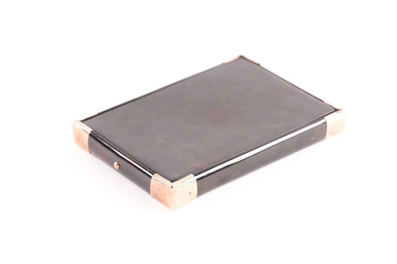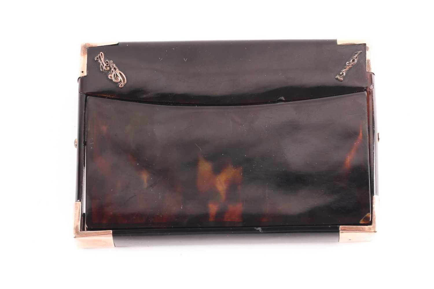 An early 20th century rose gold mounted tortoiseshell card case; rectangular envelope style with hinged opening, applied rose gold brackets to corners and applied monogram and date 12 x 8.5 cm
