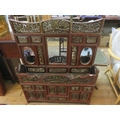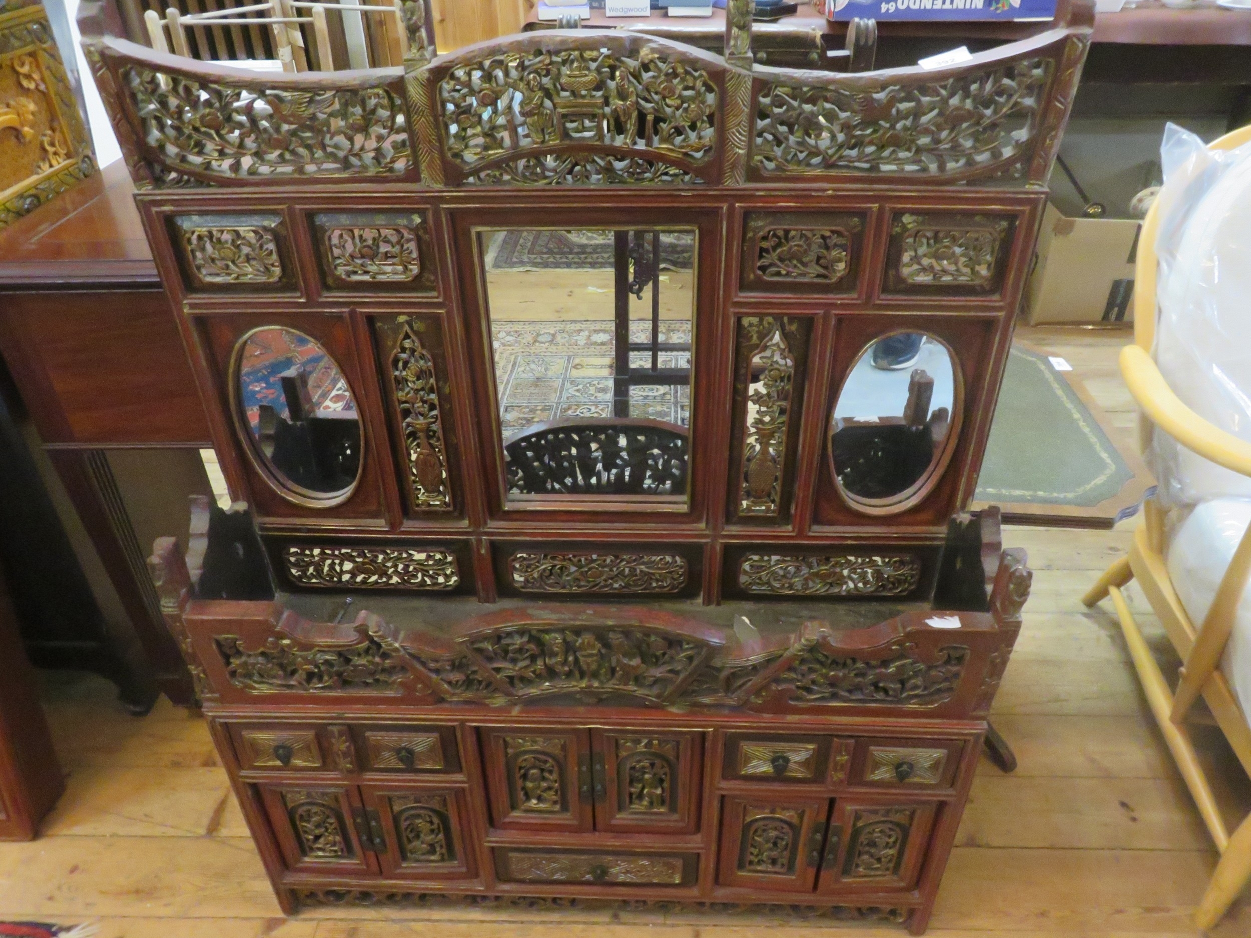 Ornately Carved Oriental Lacquered and Gilt Wood Table and Top Cabinet