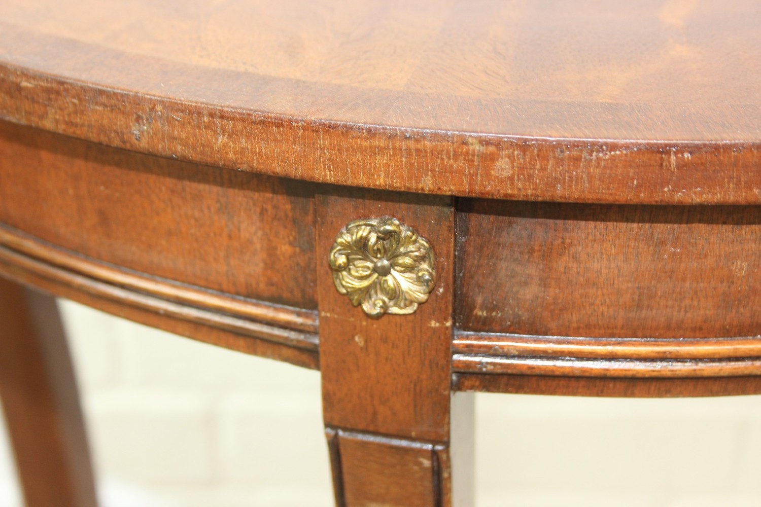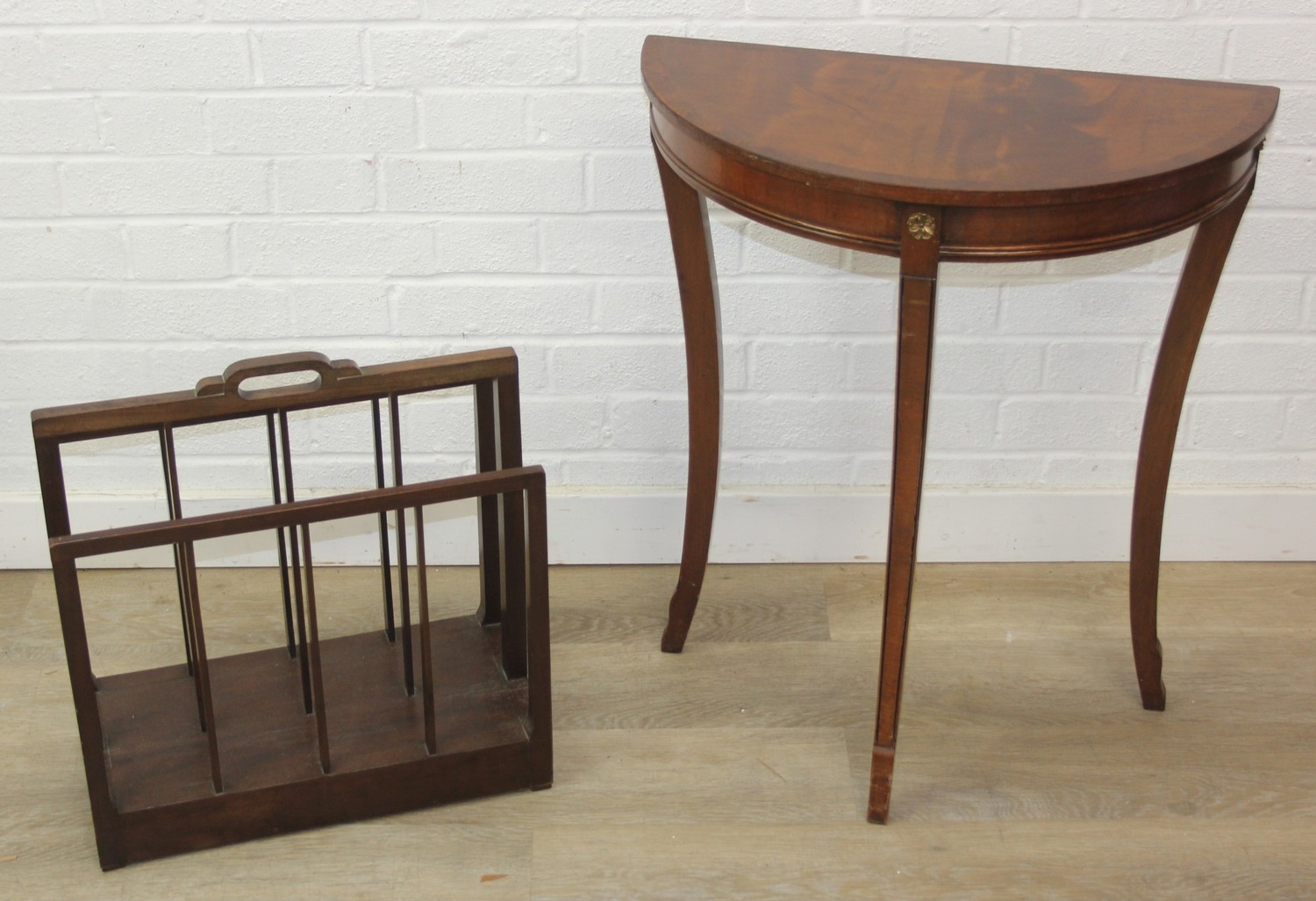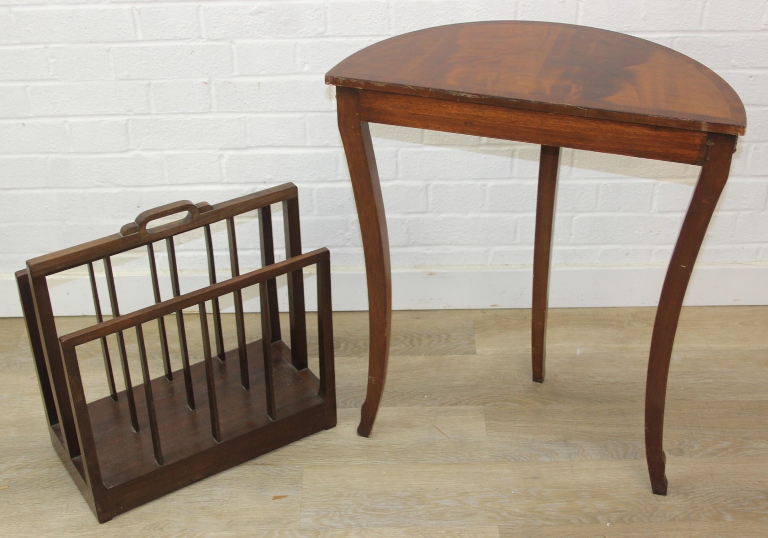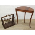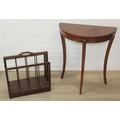 A modern demi-lune side table of Regency design and a retro style hardwood magazine rack, the table 60cm x 30cm x 70cm [2]