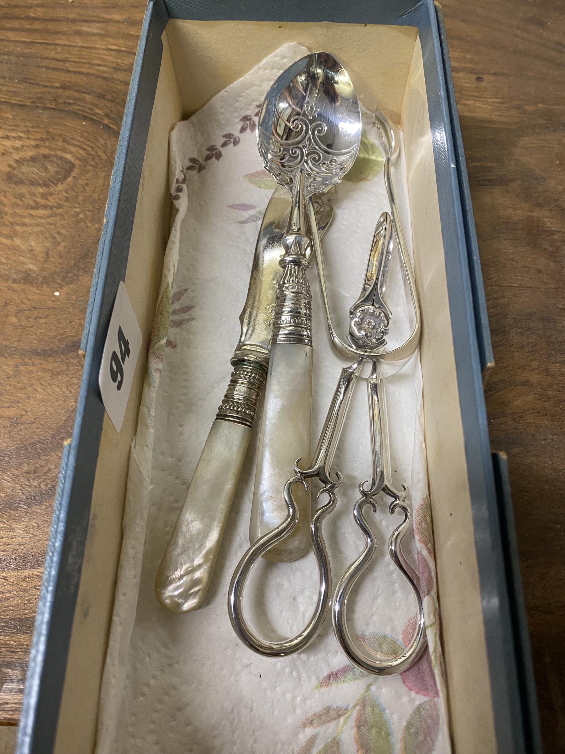Silver and mother of pearl jam spoon, plated mother of pearl butter knife and plated grape scissors