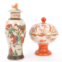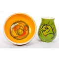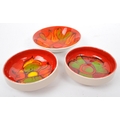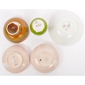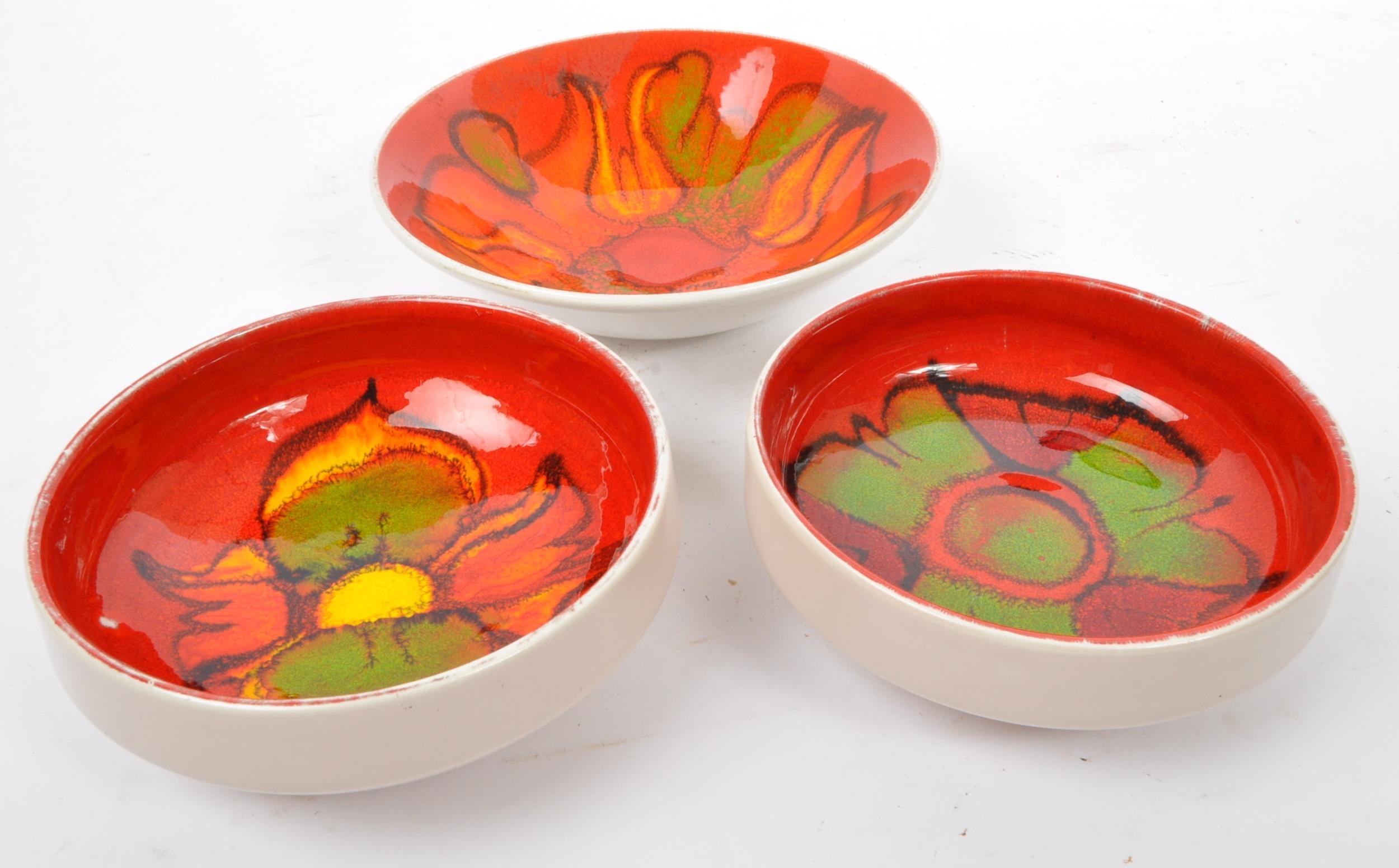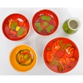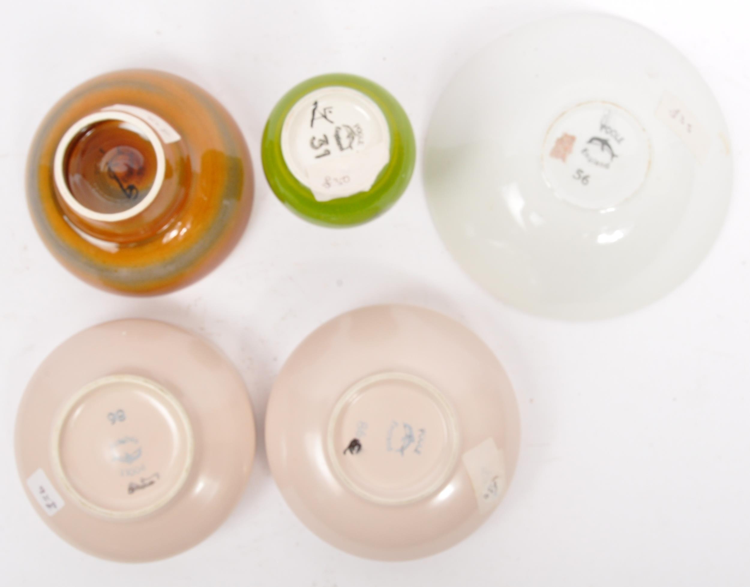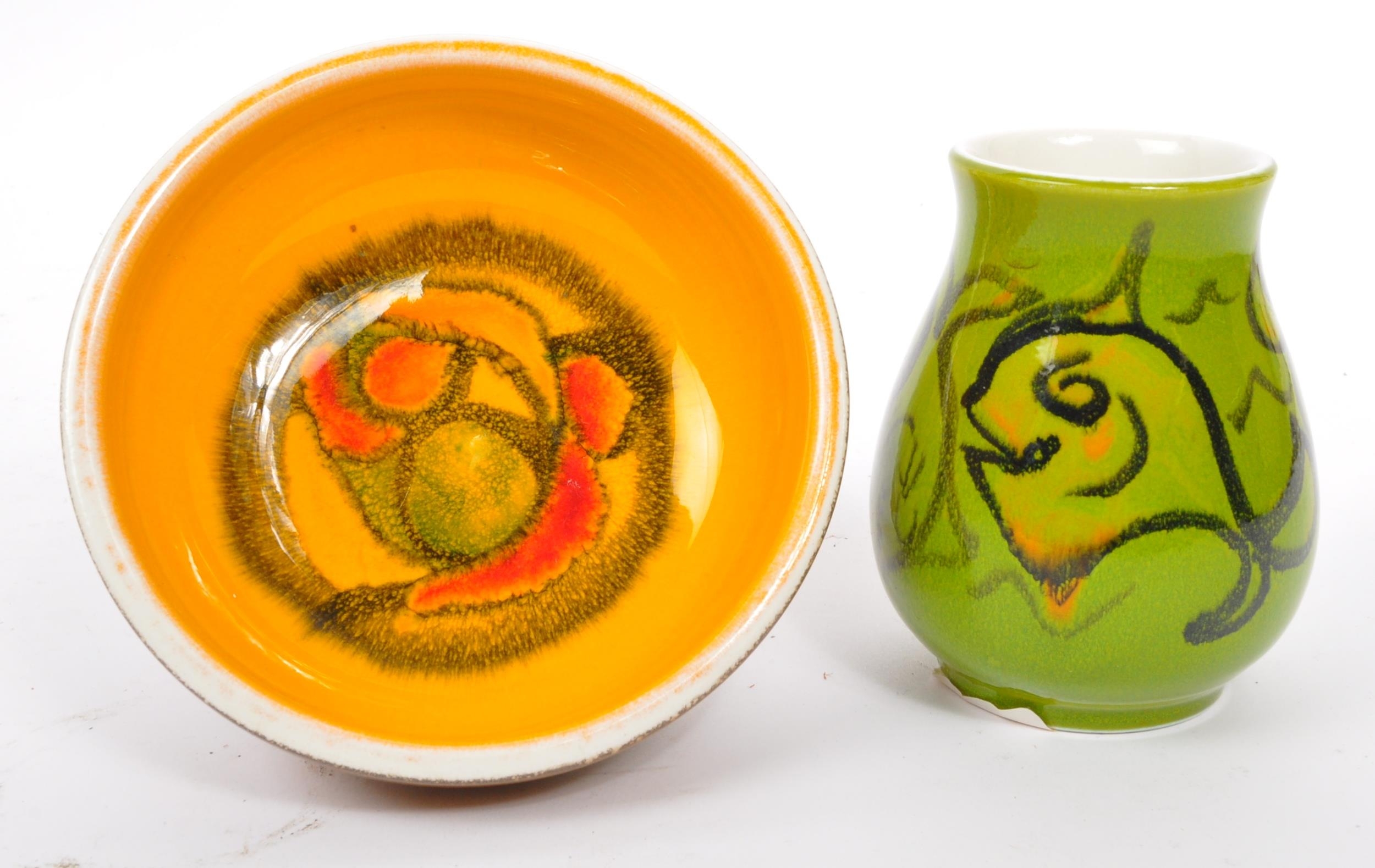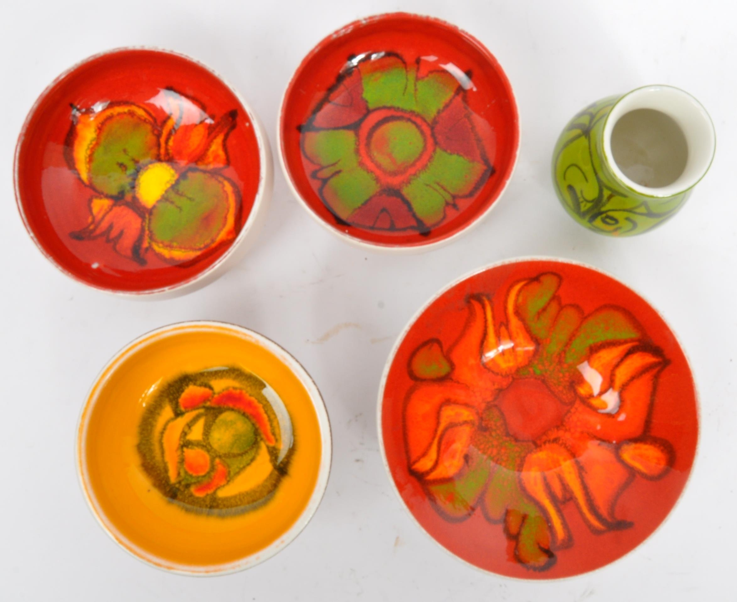 A collection of 5 x retro vintage hand painted bowls / dishes and vase in the 'Delphis' design by Poole Pottery. To include 2 x dishes (marked 86), 1 x bowl (marked 56), 2 x dishes (marked 86), raised dish (marked 38) and bud vase (marked 31). All marked 'Poole, England' to the underside. Largest measures 16cm (width).