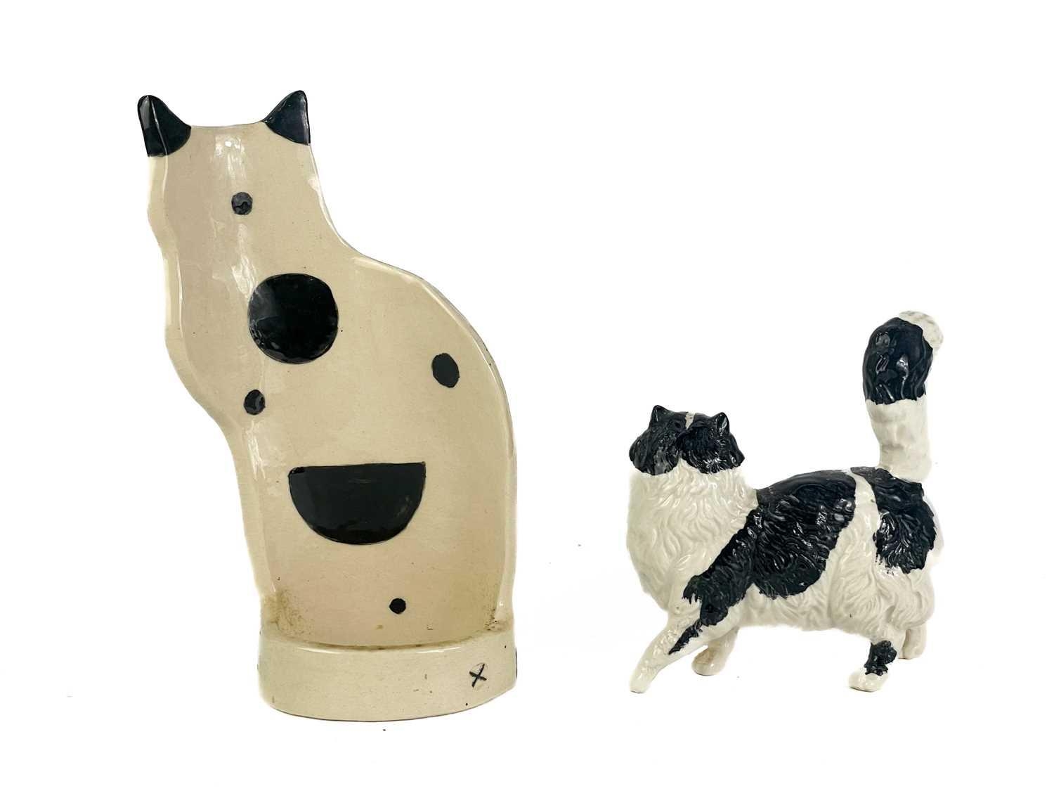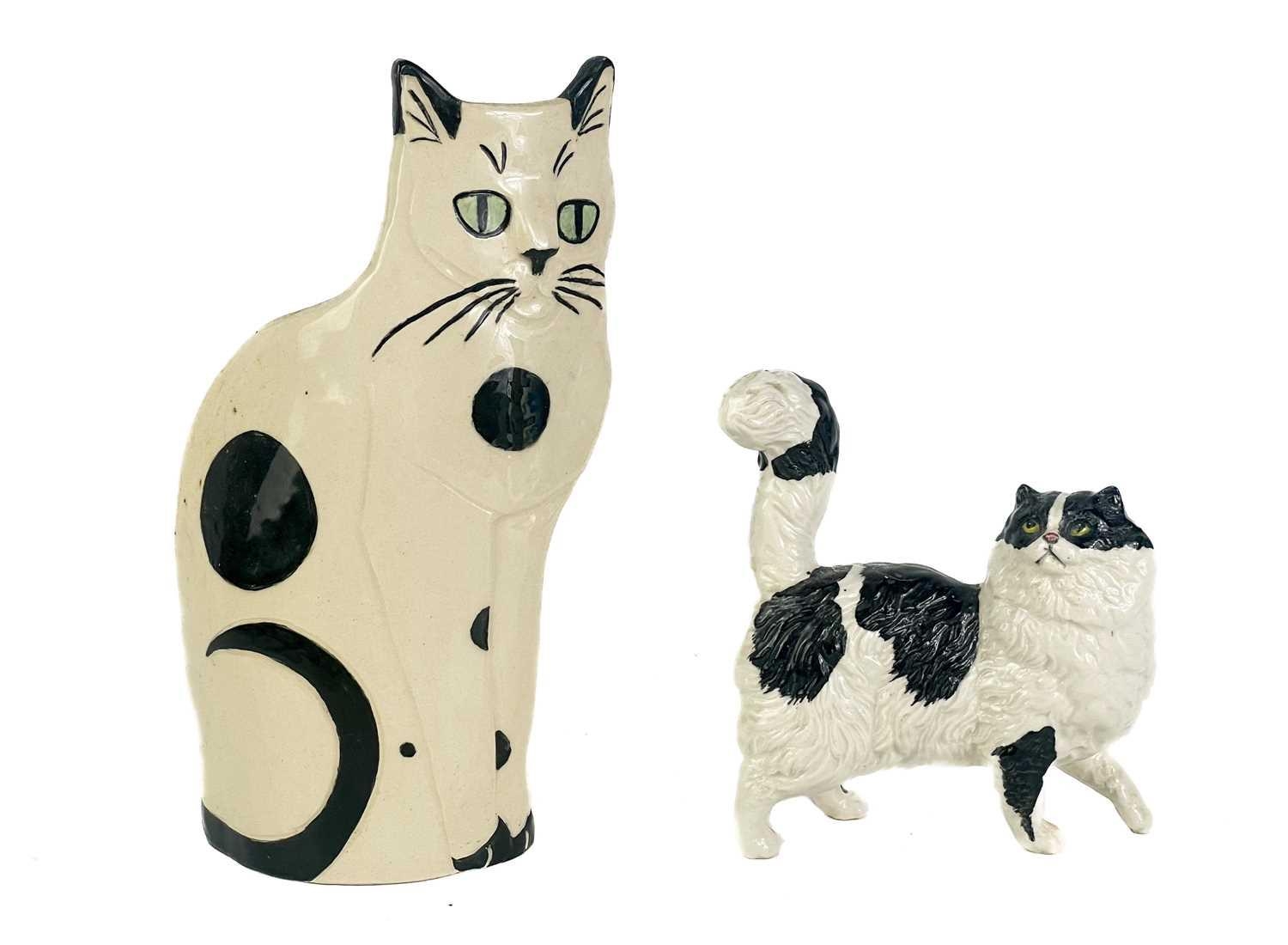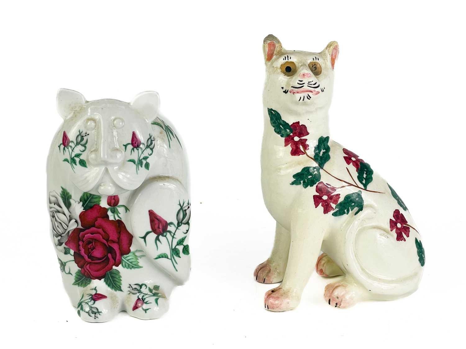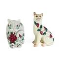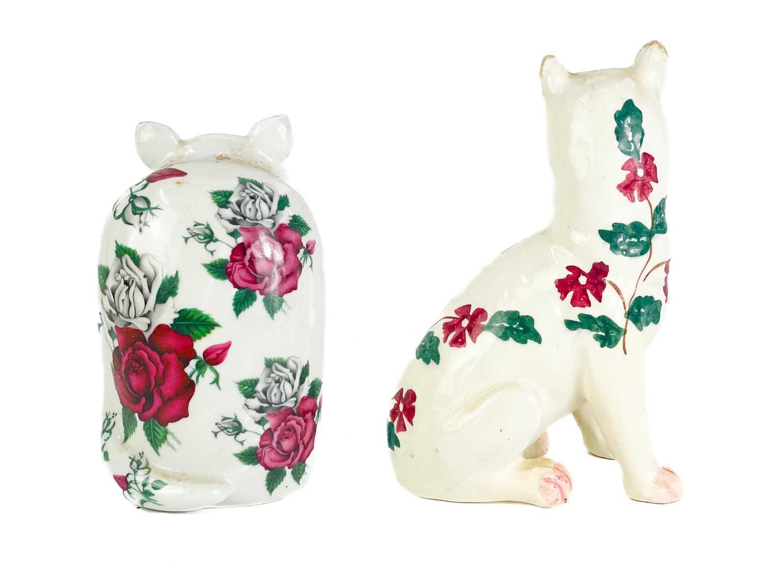 A P Rada pottery floral cat figurine. Height 14cm. Together with four other ceramic and pottery cat figurines.