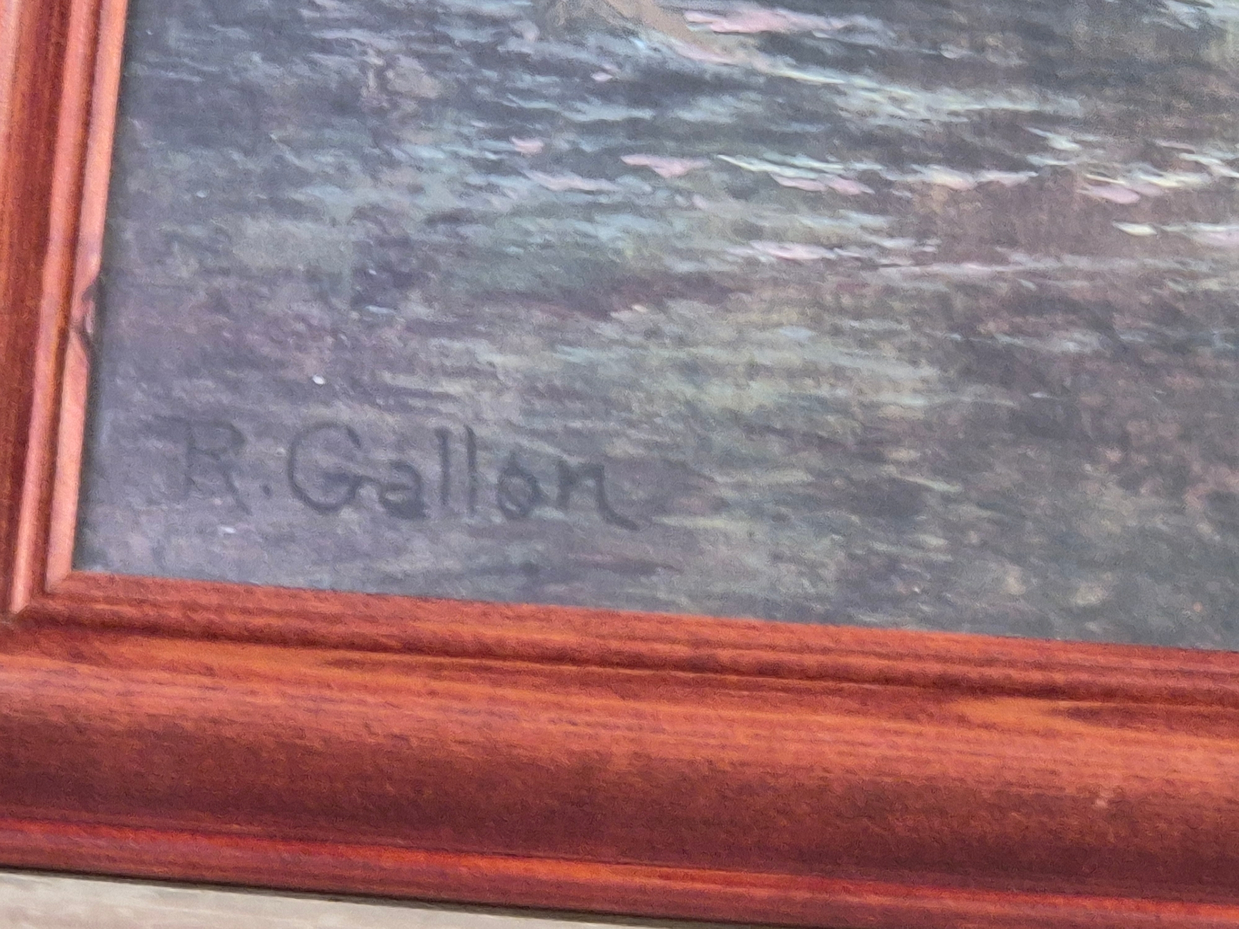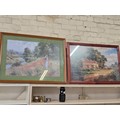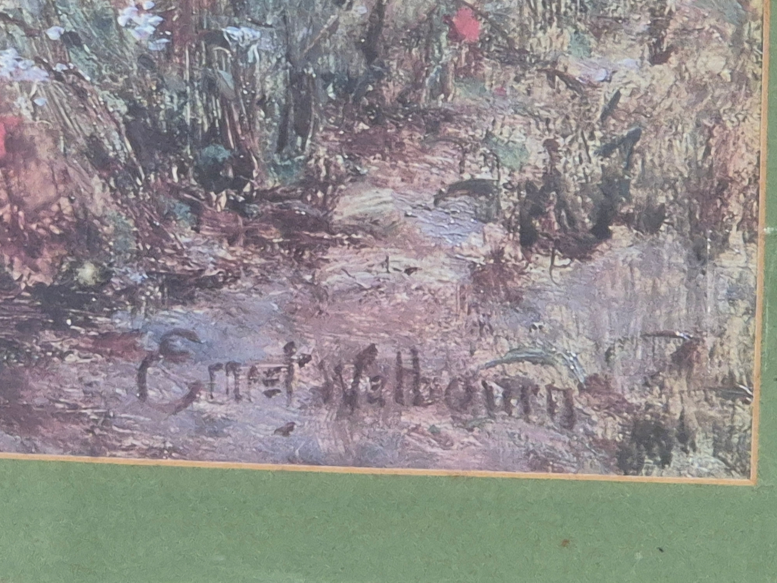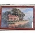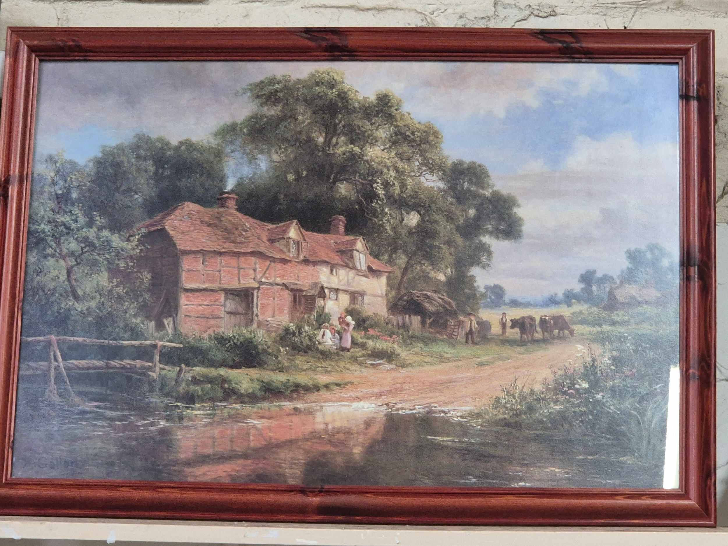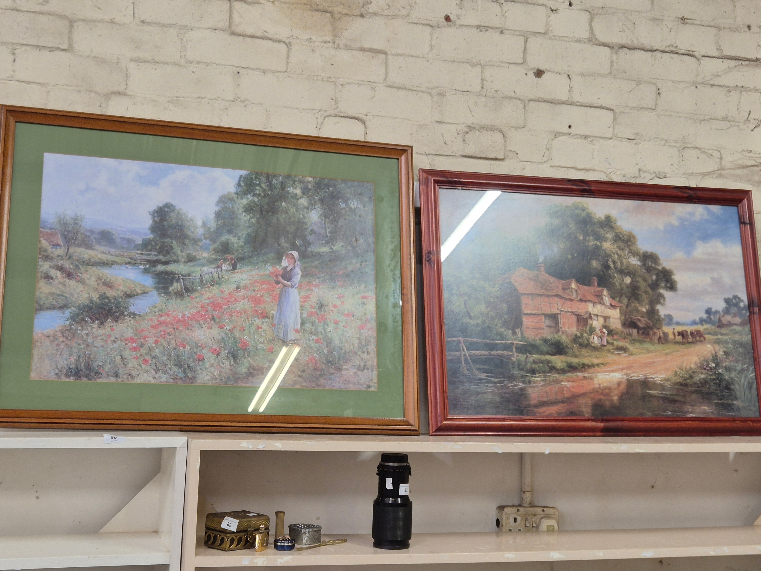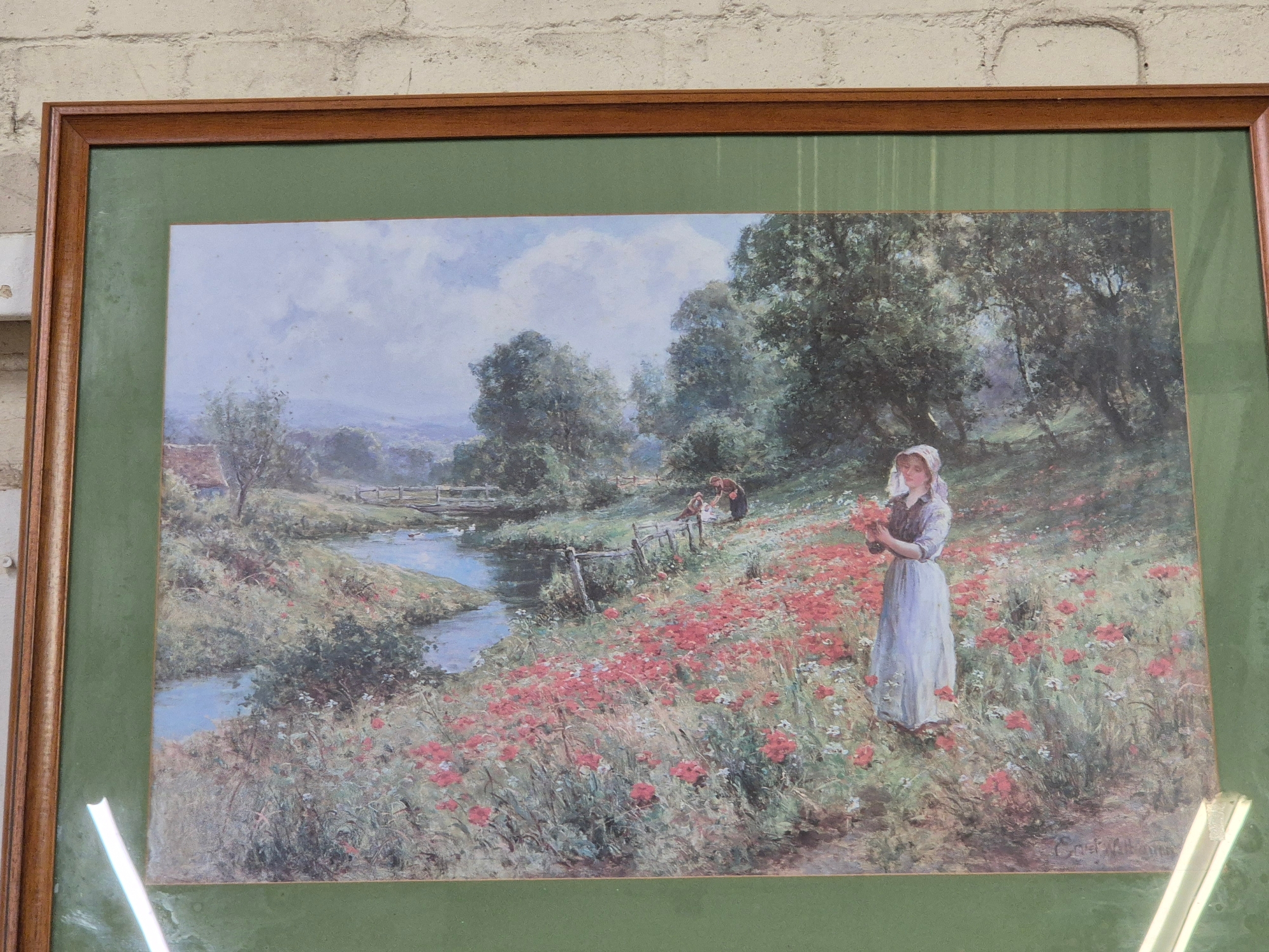 A large framed print of a country scene with figures in a field of poppies by Ernst Wilburn 1872 to 1927, beech frame 84cm x63cm plus a lovely framed print of a country cottage scene, by Robert Gallon 1845 - 1925, pine frame 83cm x 58cm