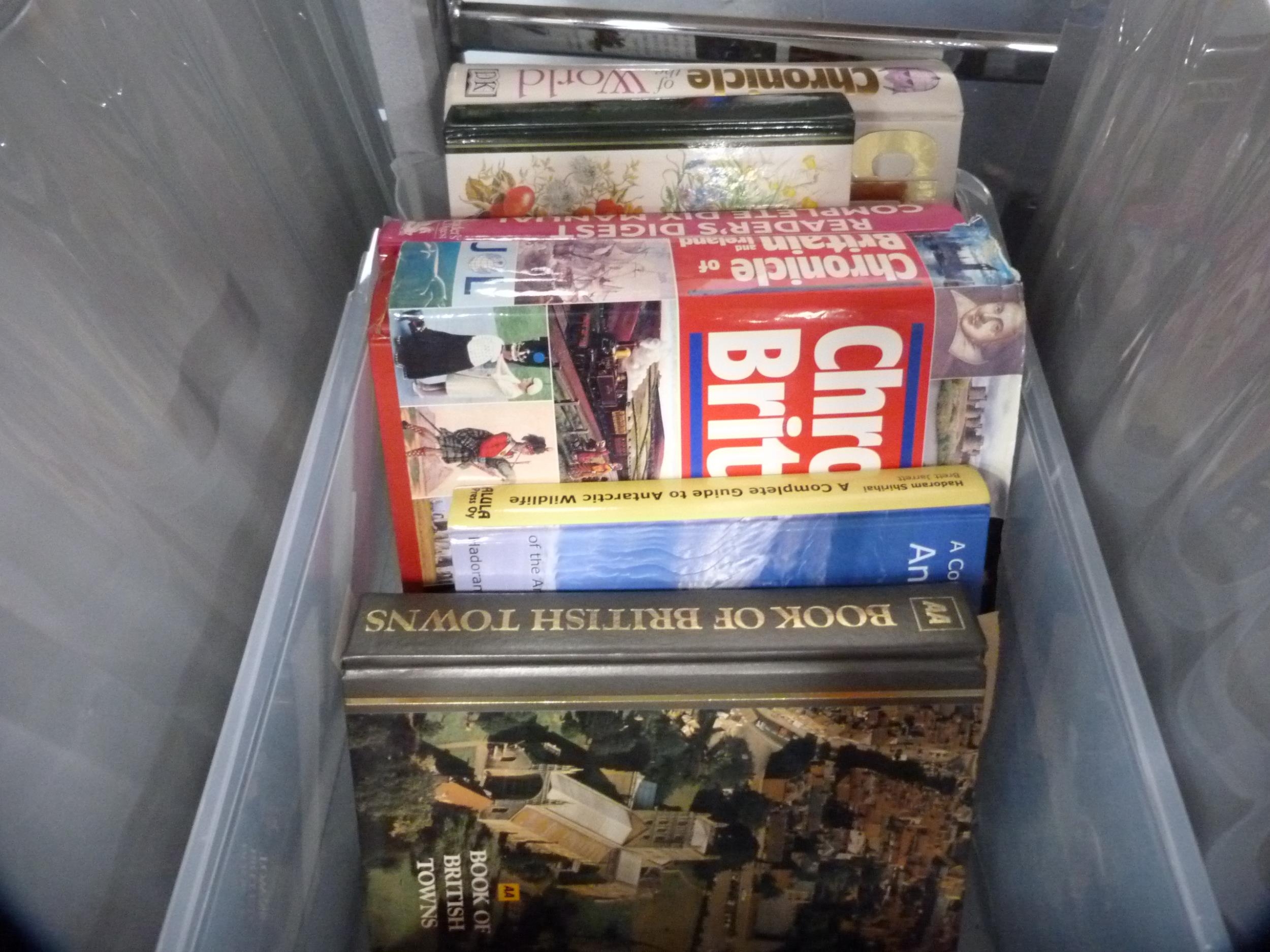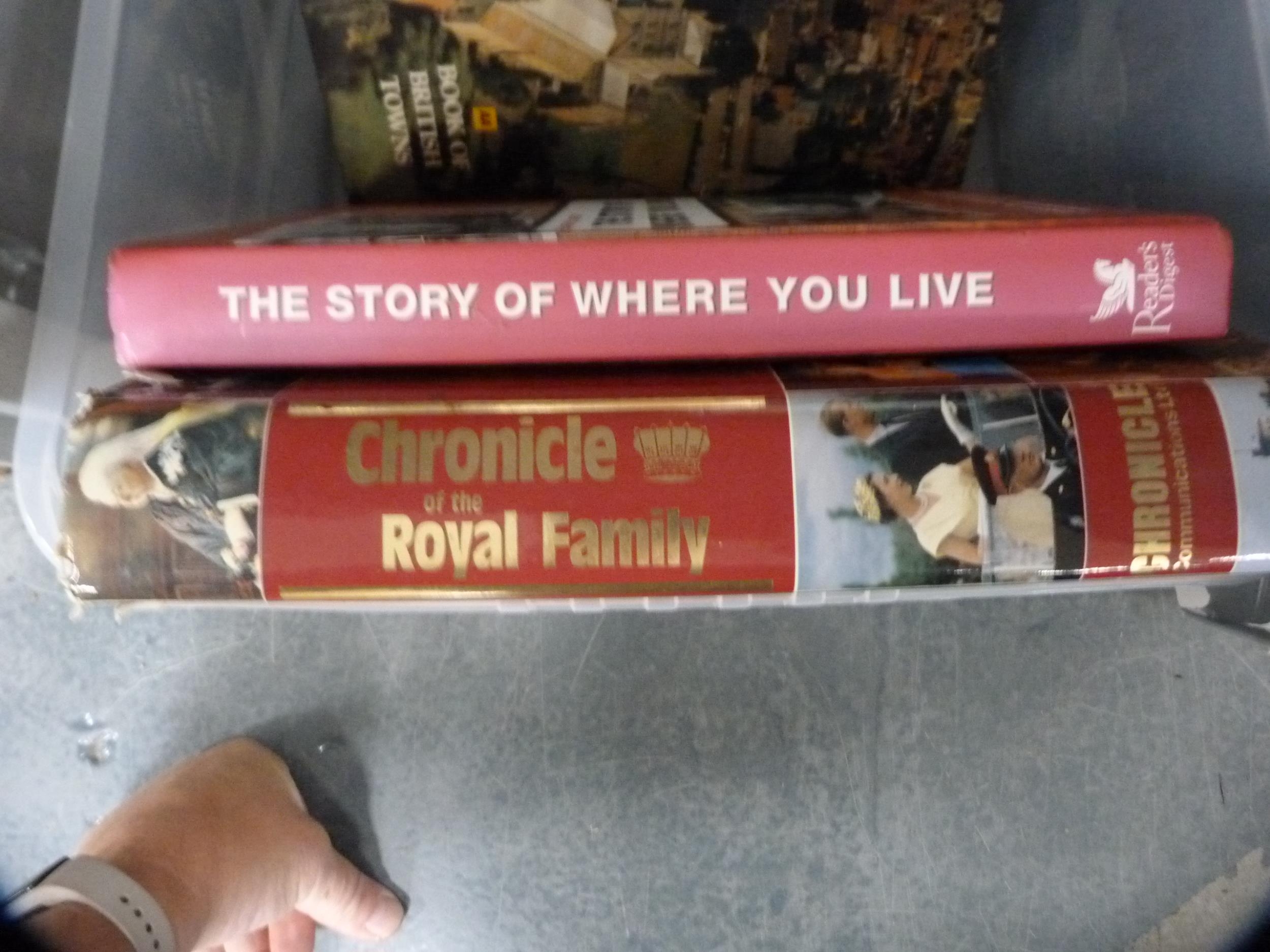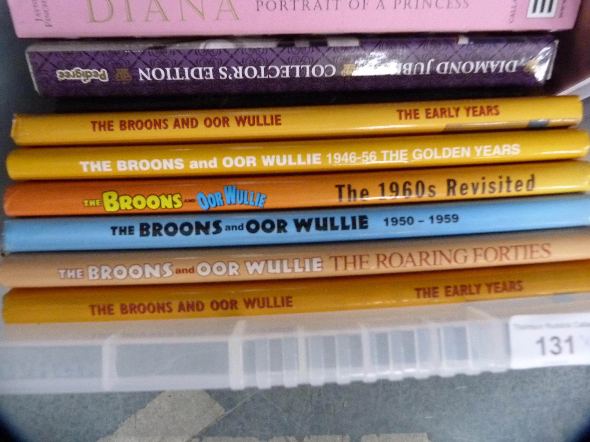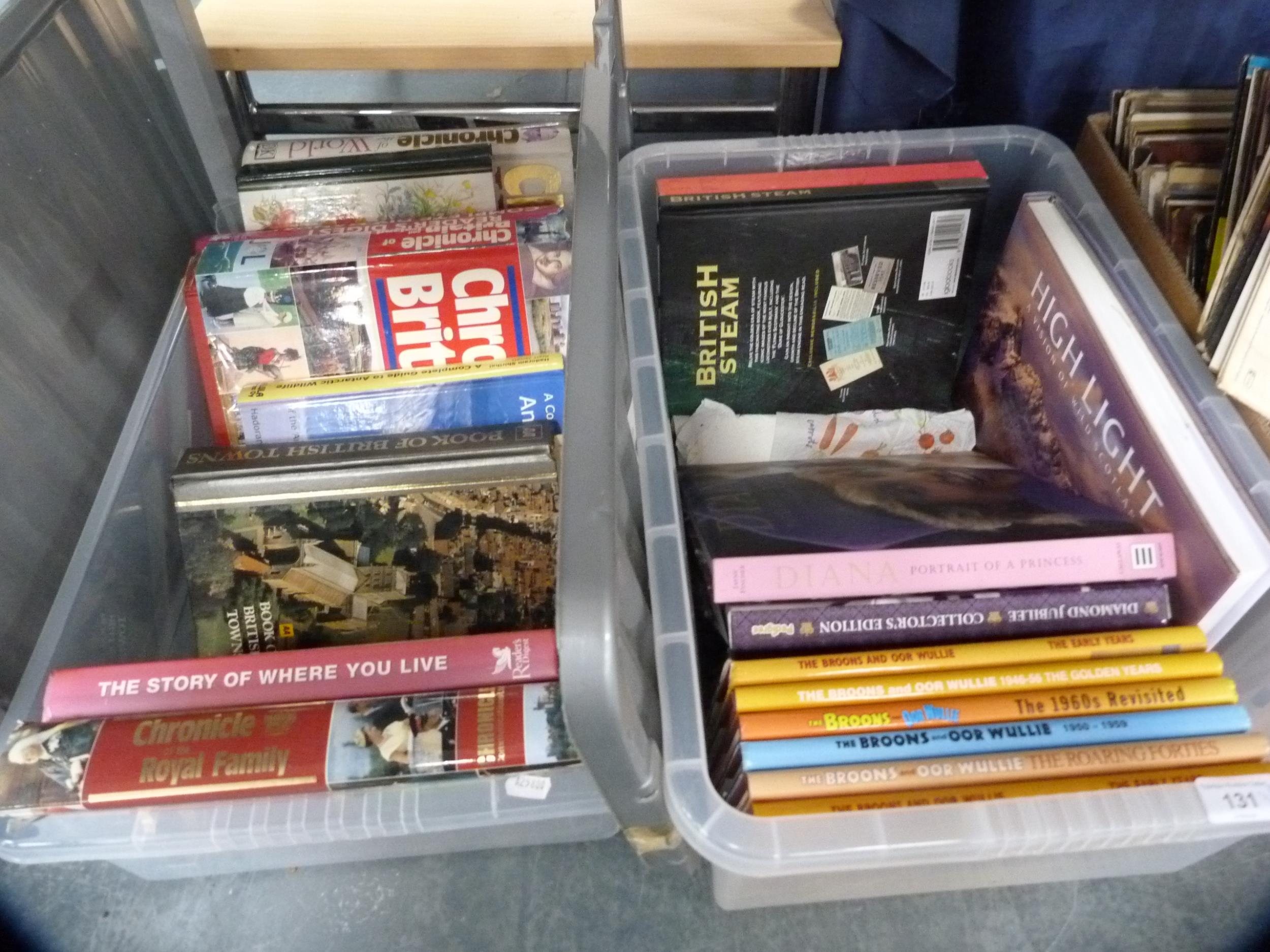 Two cartons containing books to include The Broons, Oor Wullie, Britain, coffee table books, Royal family, natural history etc.