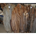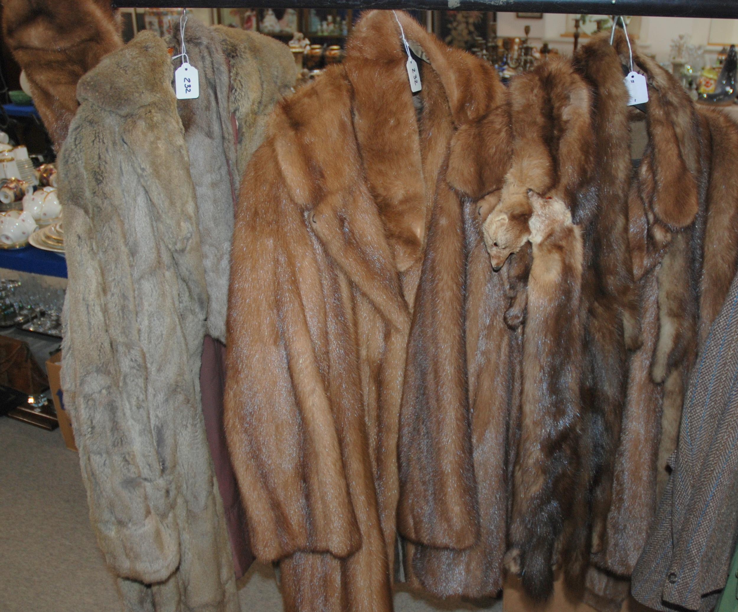 A light brown fur coat possibly chinchilla, two other fur coats, stoles and a hat