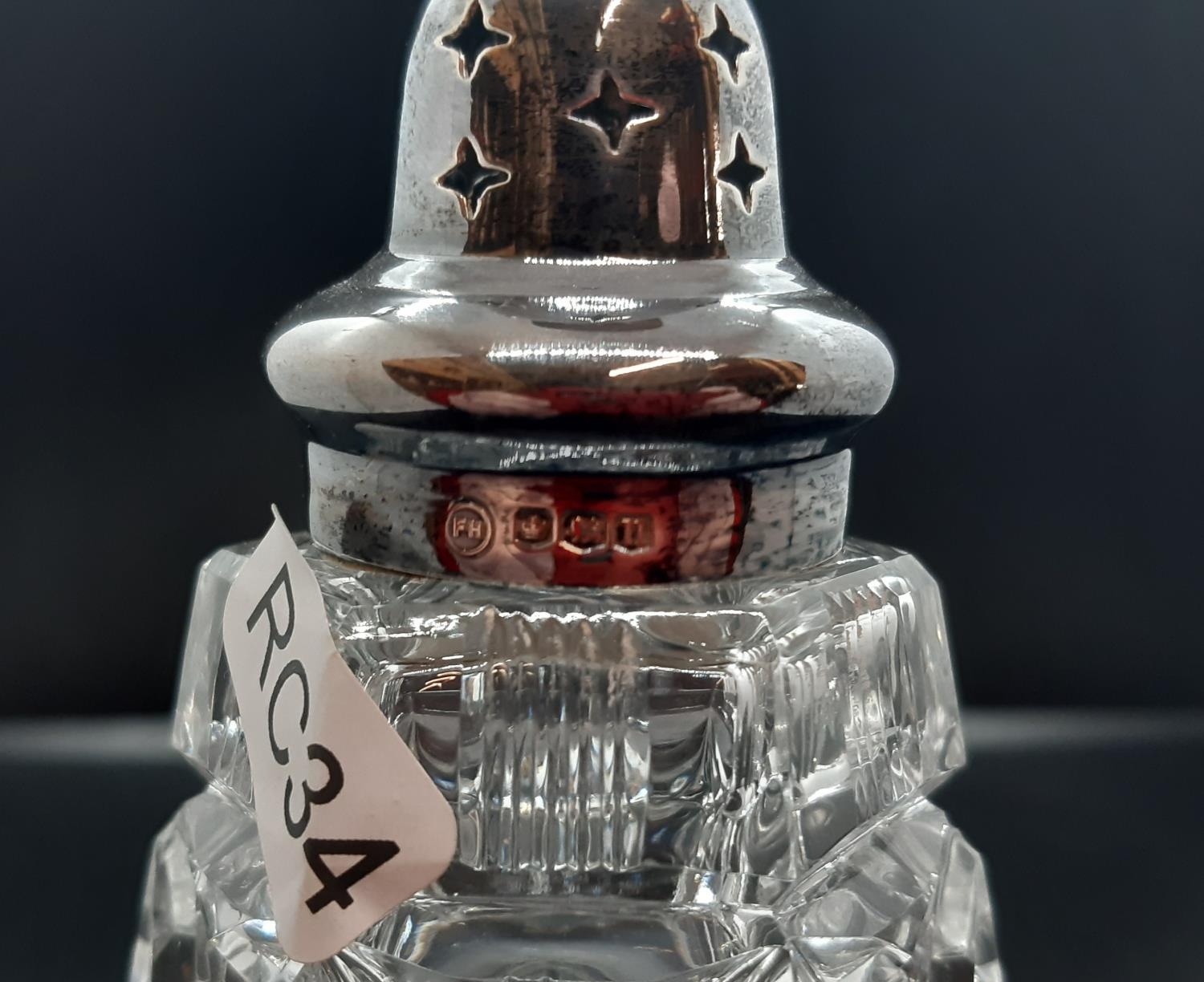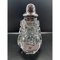 A cut glass sugar shaker with hallmarked Sheffield silver top dated 1930