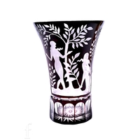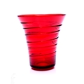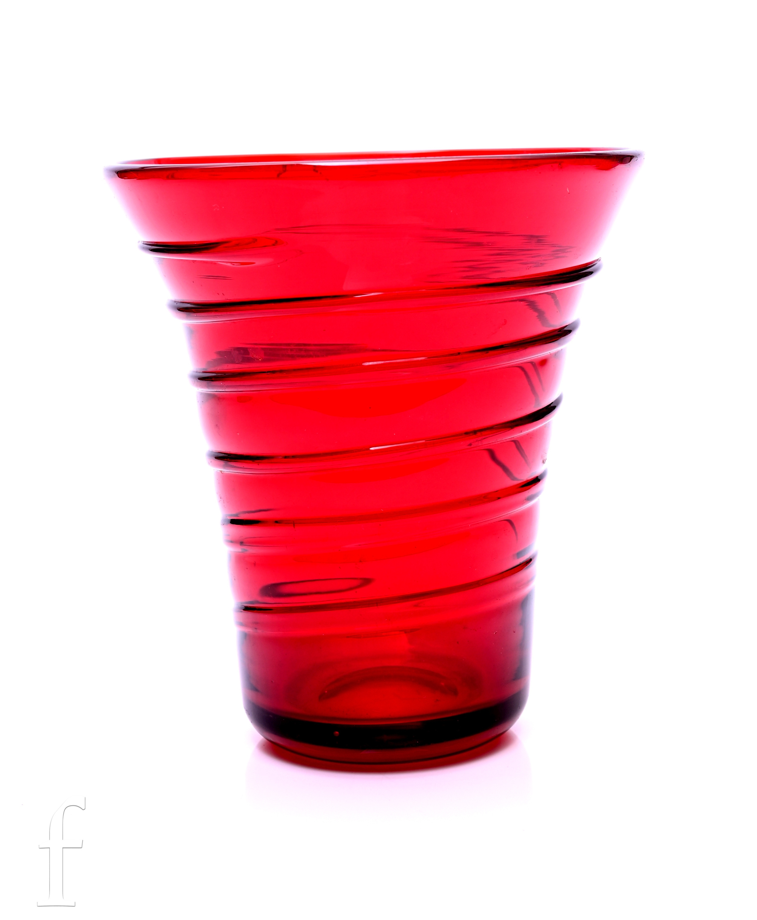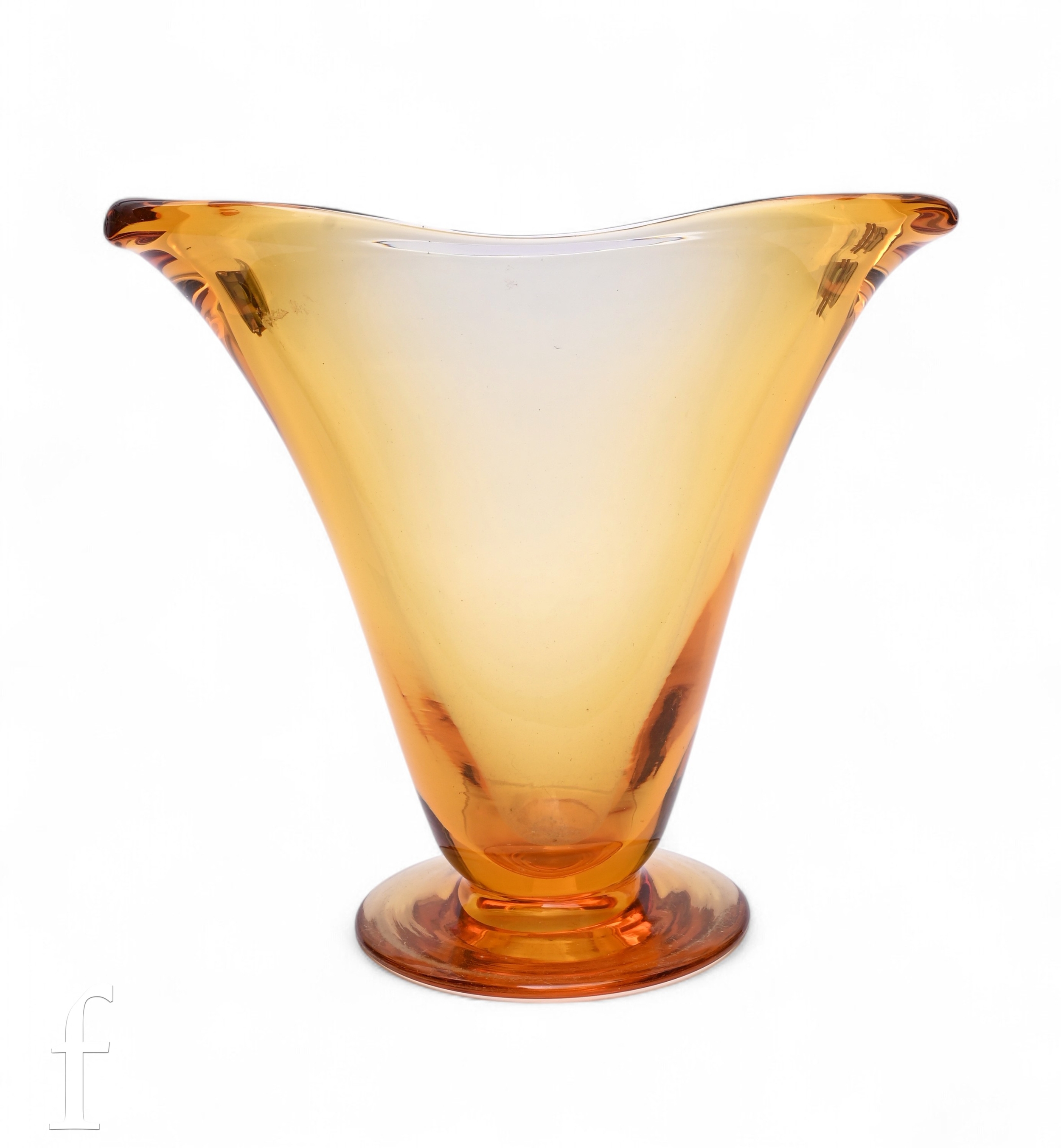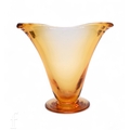 A 1940s Whitefriars glass forked footed vase designed by James Hogan, pattern number 9251, the compressed ovoid body with pulled rim to a wide circular foot in a deep golden amber, unmarked, height 23cm, together with a small James Powell self colour ribbon trail vase in ruby, pattern number 8886, height 14cm. (2)