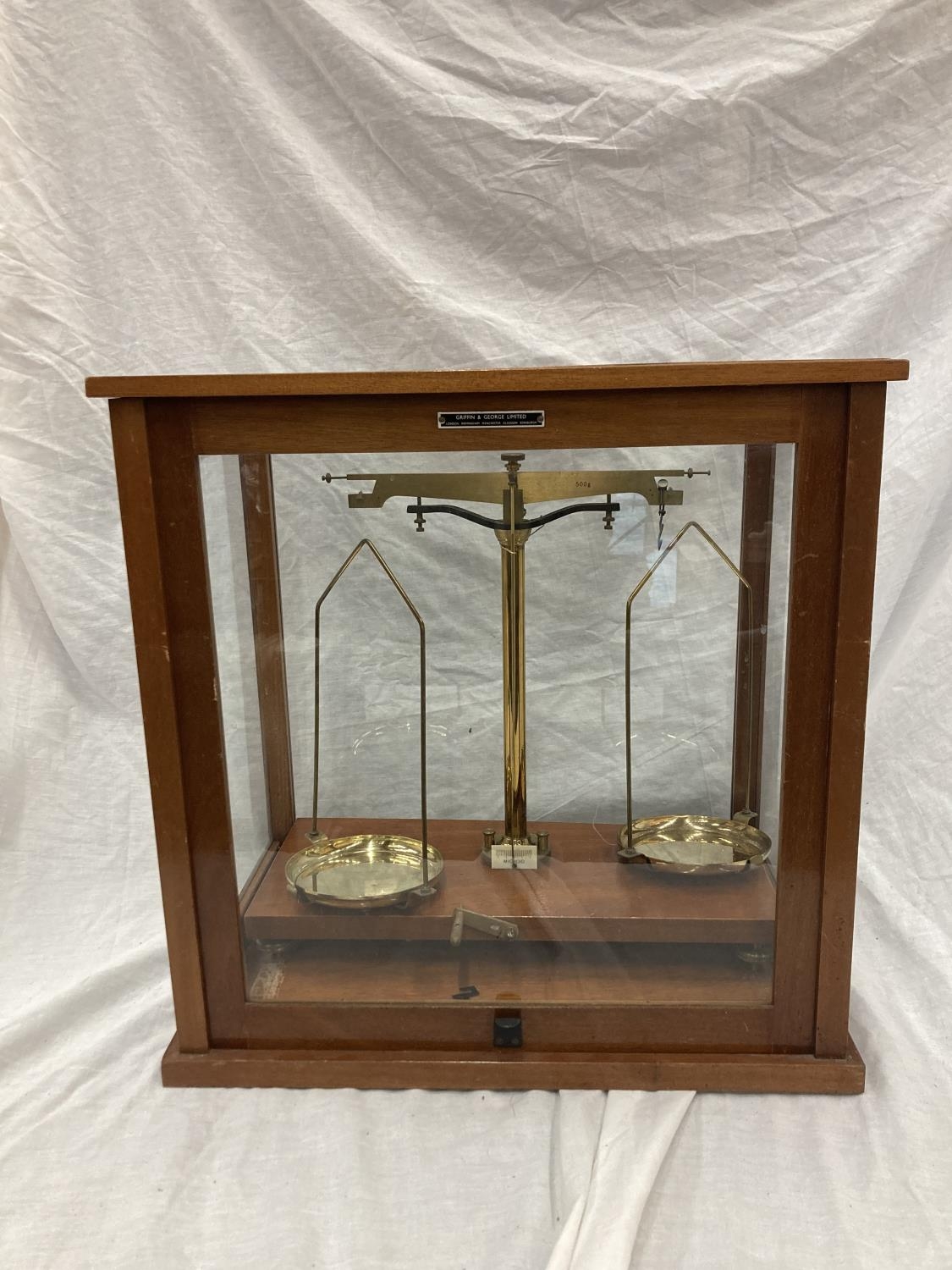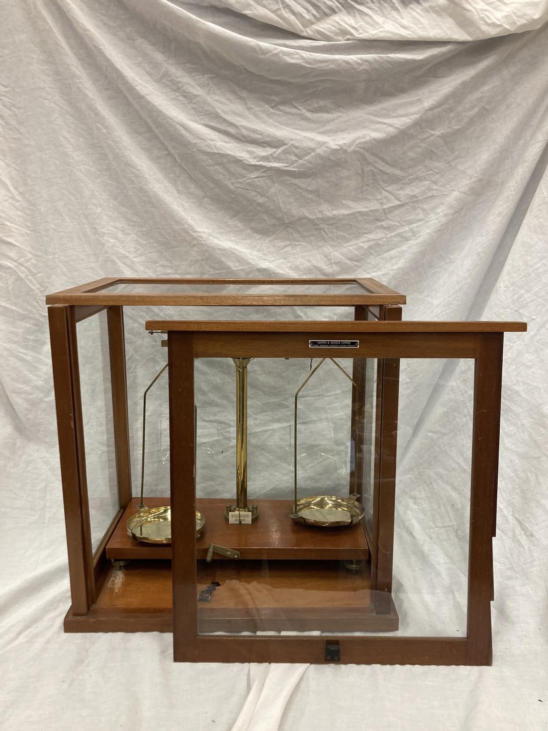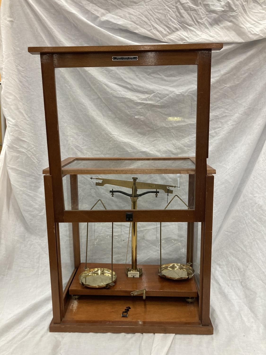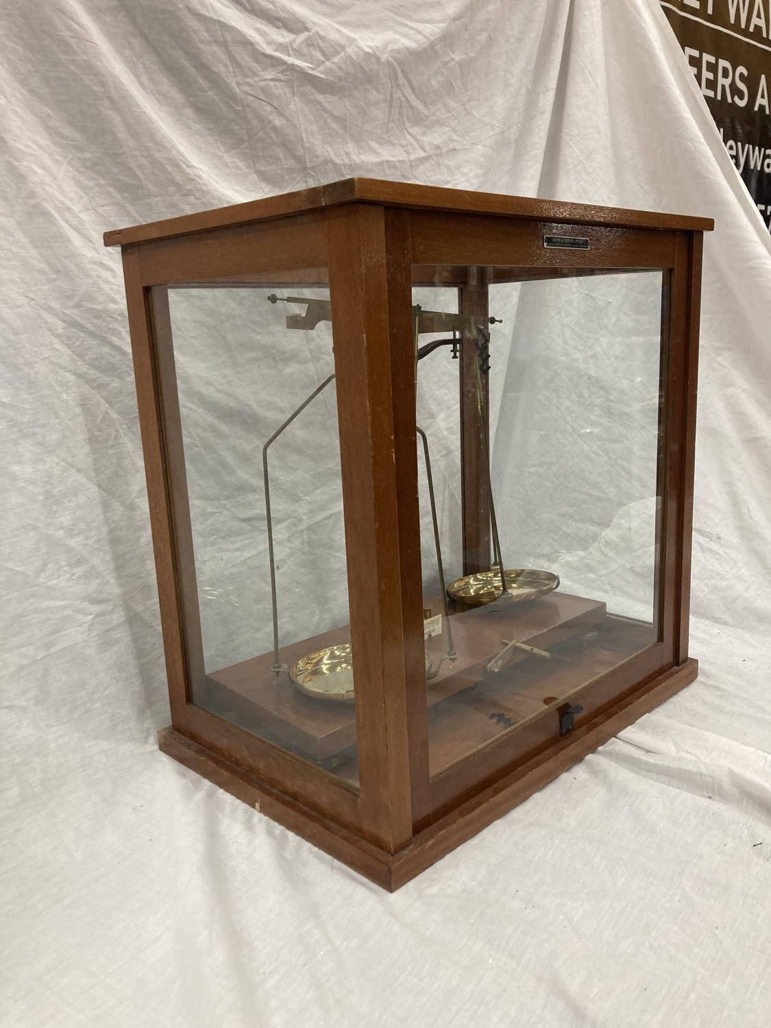 A GRIFFIN AND GEORGE LTD SET OF MICROID SCIENTIFIC SCALES IN A MAHOGANY CASE WITH GLASS PANELS - HEIGHT 48CM, WIDTH 46CM, DEPTH 30CM