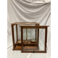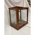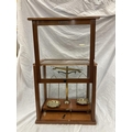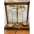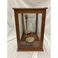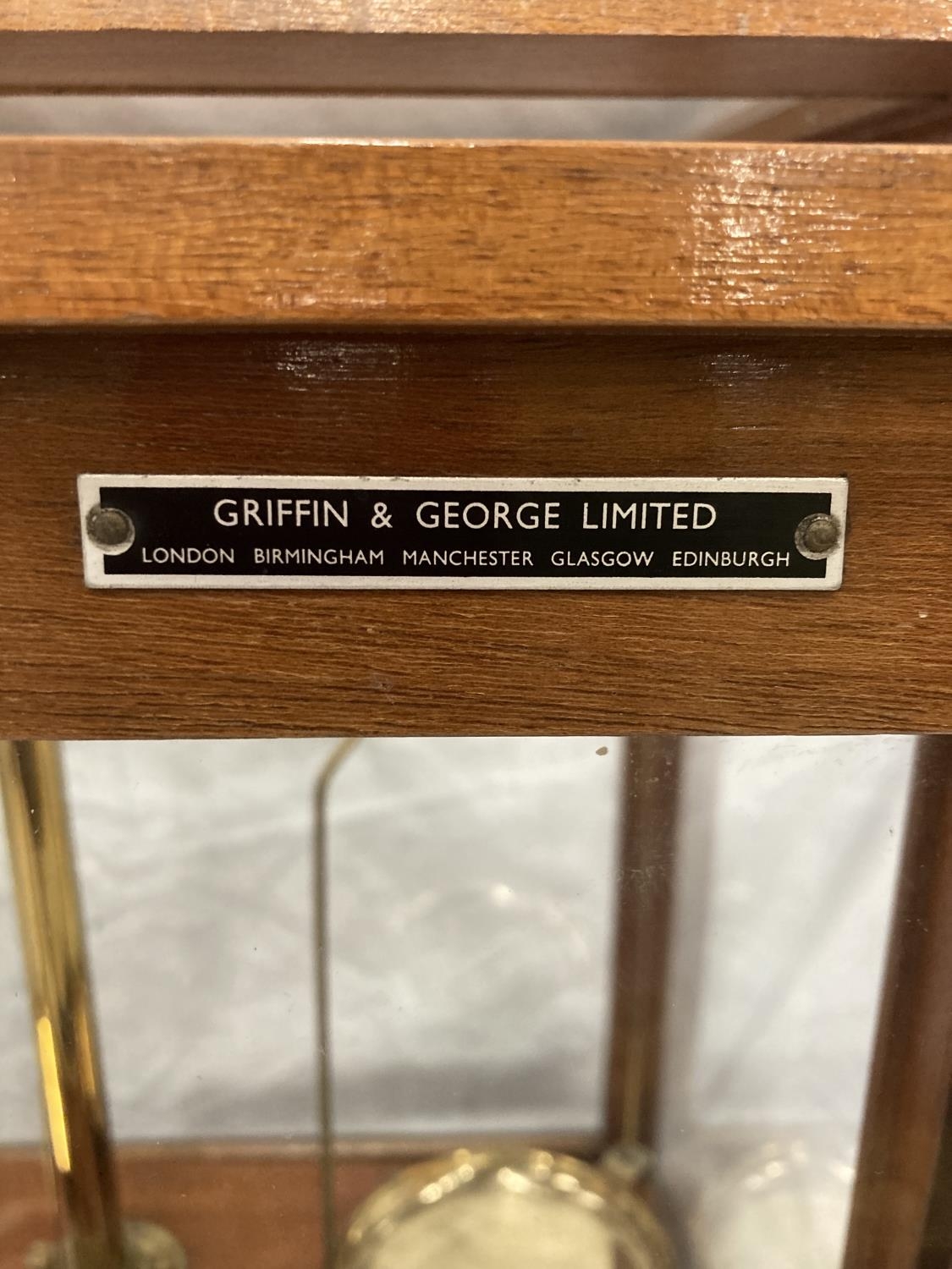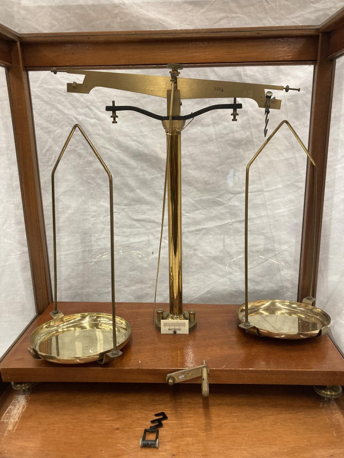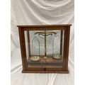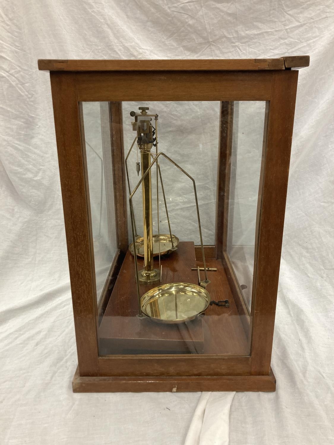 A GRIFFIN AND GEORGE LTD SET OF MICROID SCIENTIFIC SCALES IN A MAHOGANY CASE WITH GLASS PANELS - HEIGHT 48CM, WIDTH 46CM, DEPTH 30CM