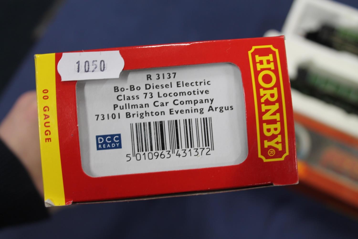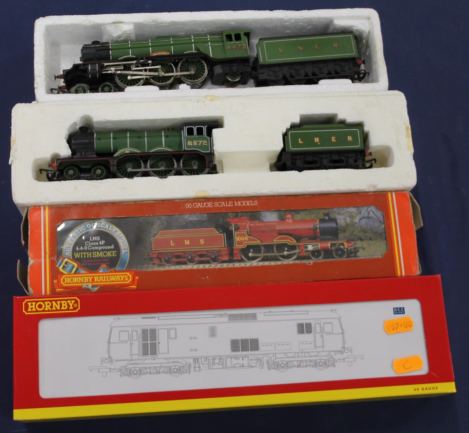 Hornby OO gauge model railways to include R3137 Bo-Bo diesel-electric Class 73 locomotive Pullman Car Company 73101 Brighton Evening Argus, DCC Ready, boxed, 4-4-0 tender locomotive 1000 LMS maroon boxed. Hornby Railways 4-6-0 tender locomotive 8572 LNER green and 4-6-2 Flying Scotsman tender locomotive 4472 LNER green. (4)