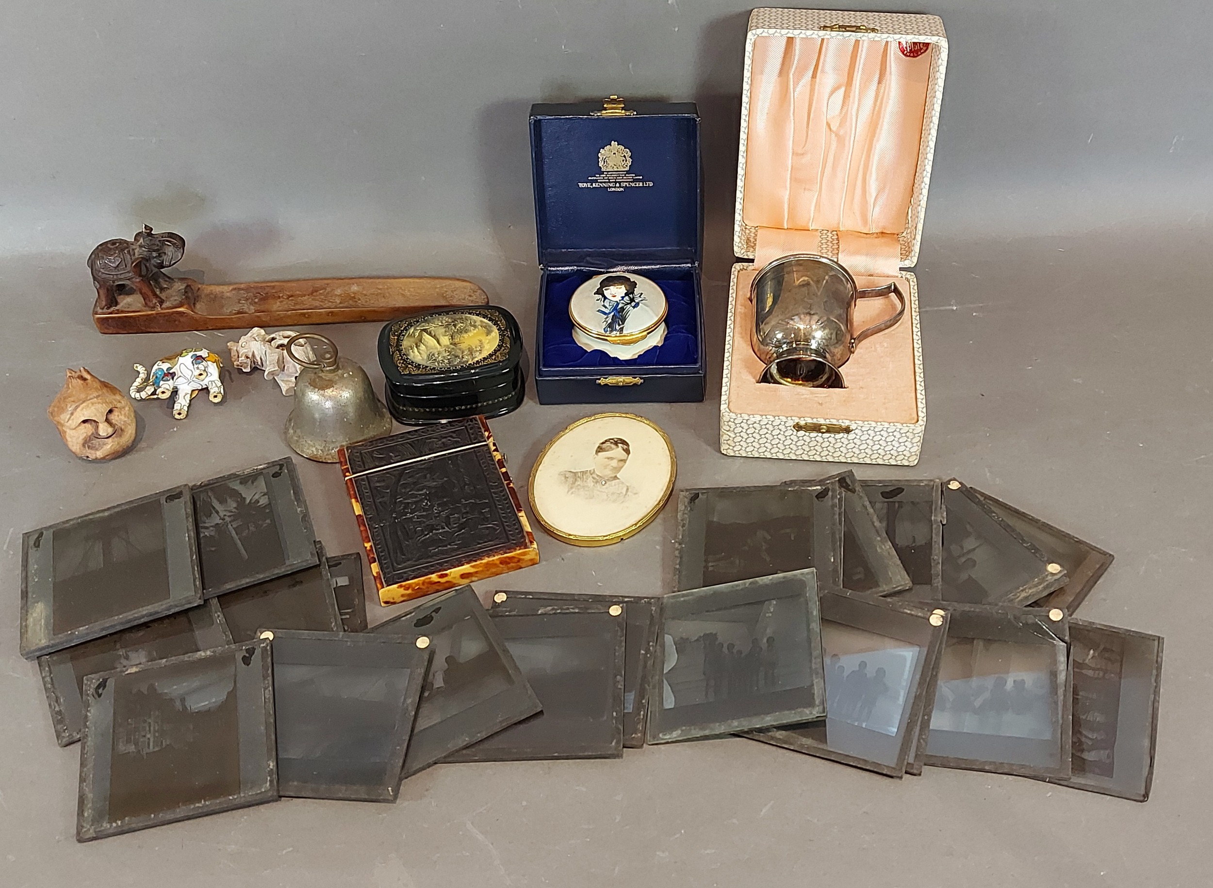 A 19th Century tortoiseshell card case together with other items including early negatives and an oval portrait miniature