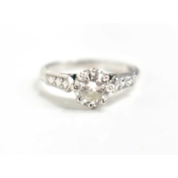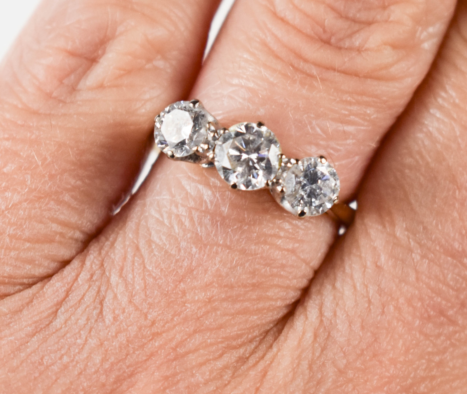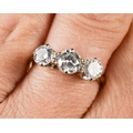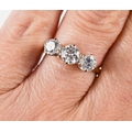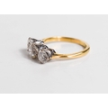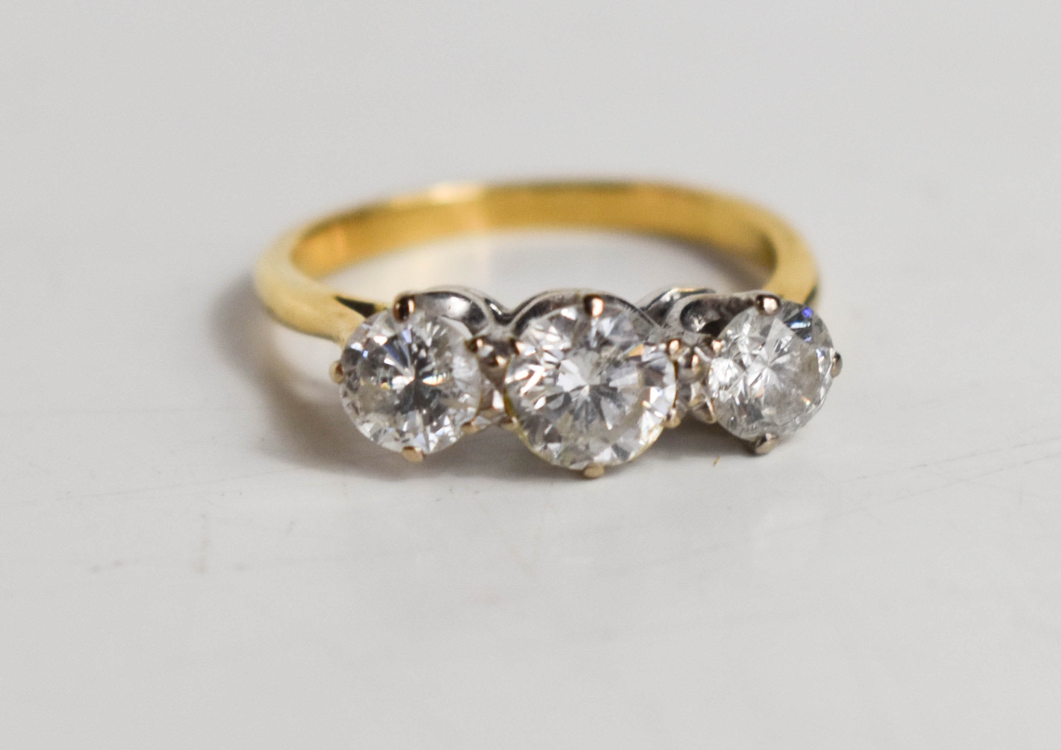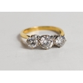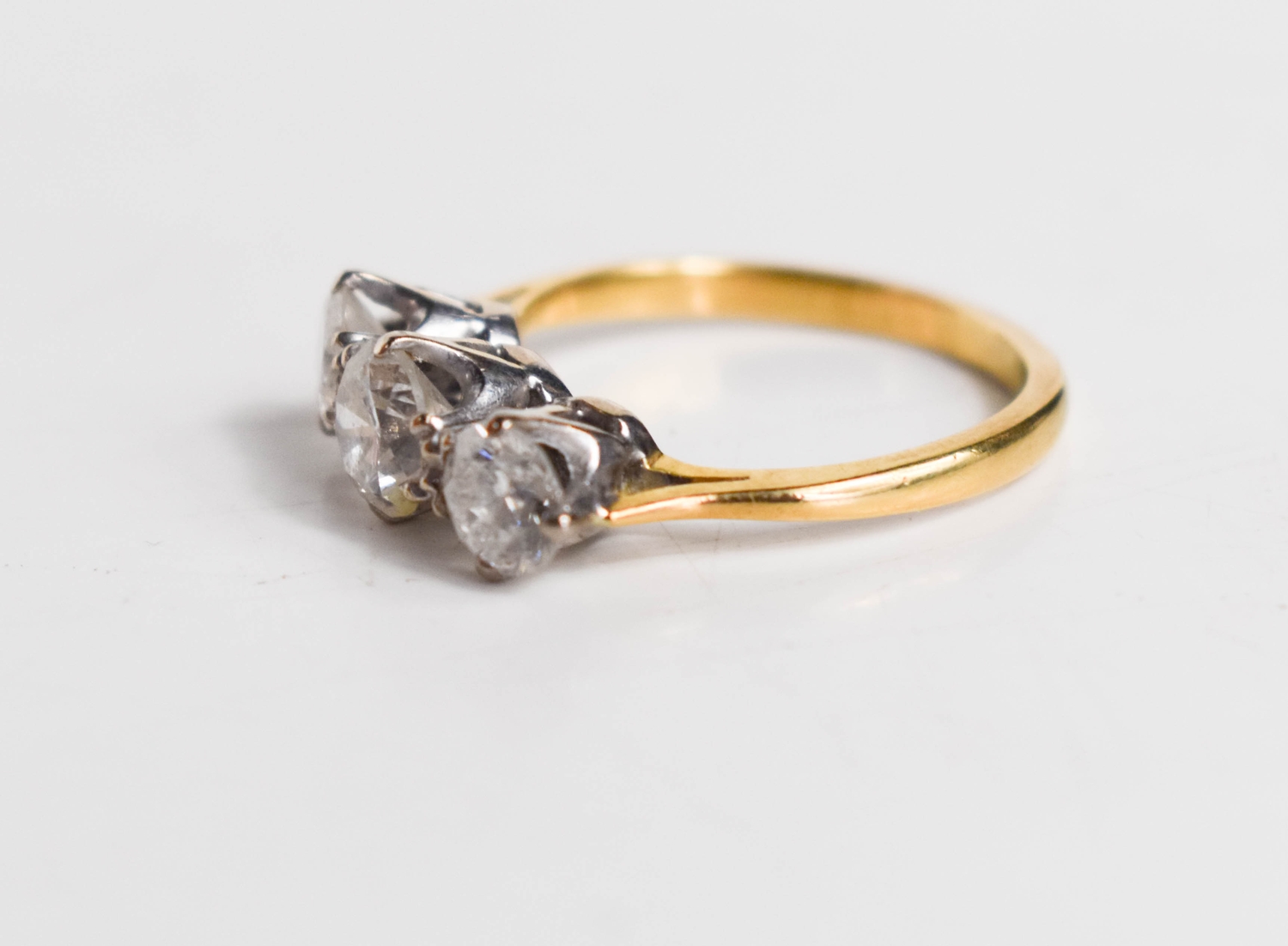 A gold and diamond three stone ring, the central brilliant cut diamond approximately ½ct, flanked by two diamonds approximately ¼cts, unmarked but testing as at least 9ct gold, size K, 3.3g.