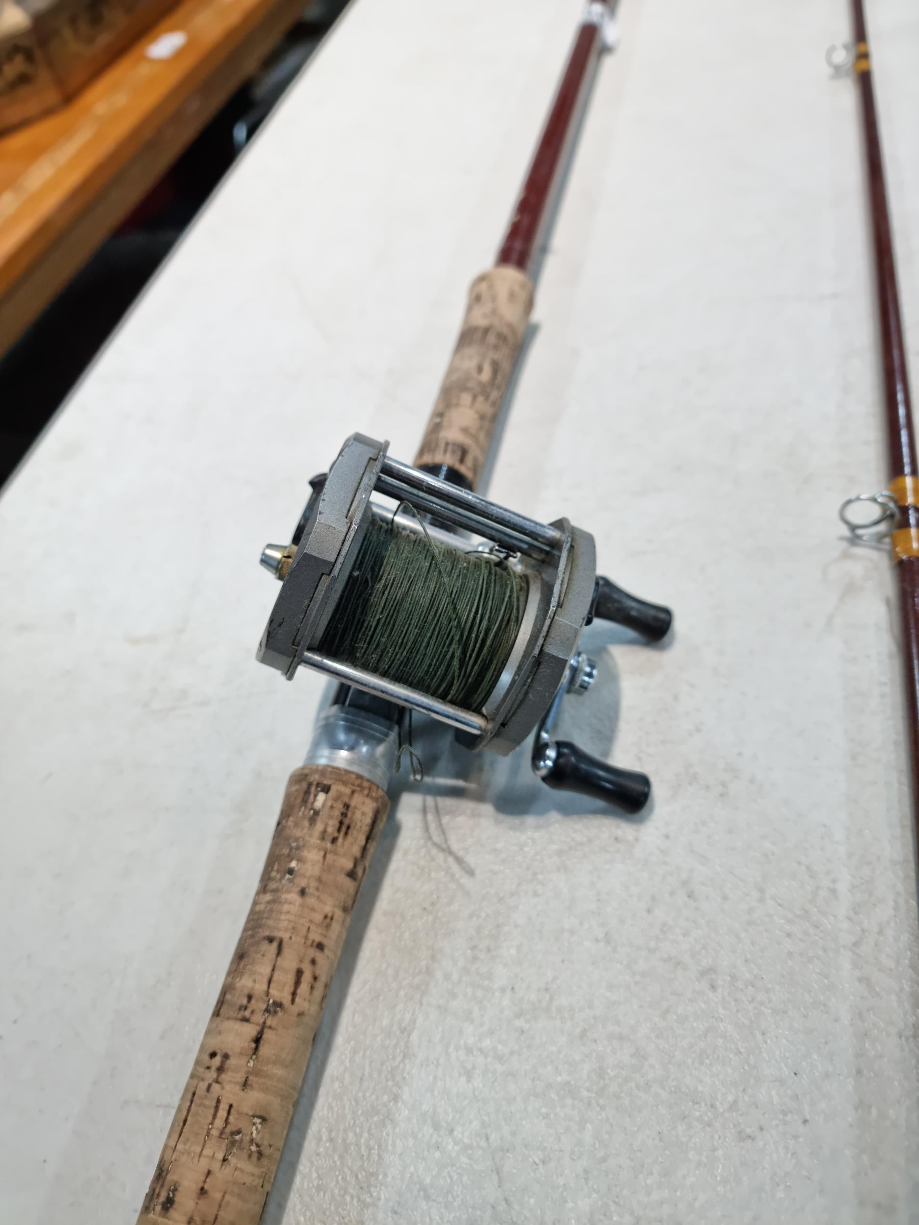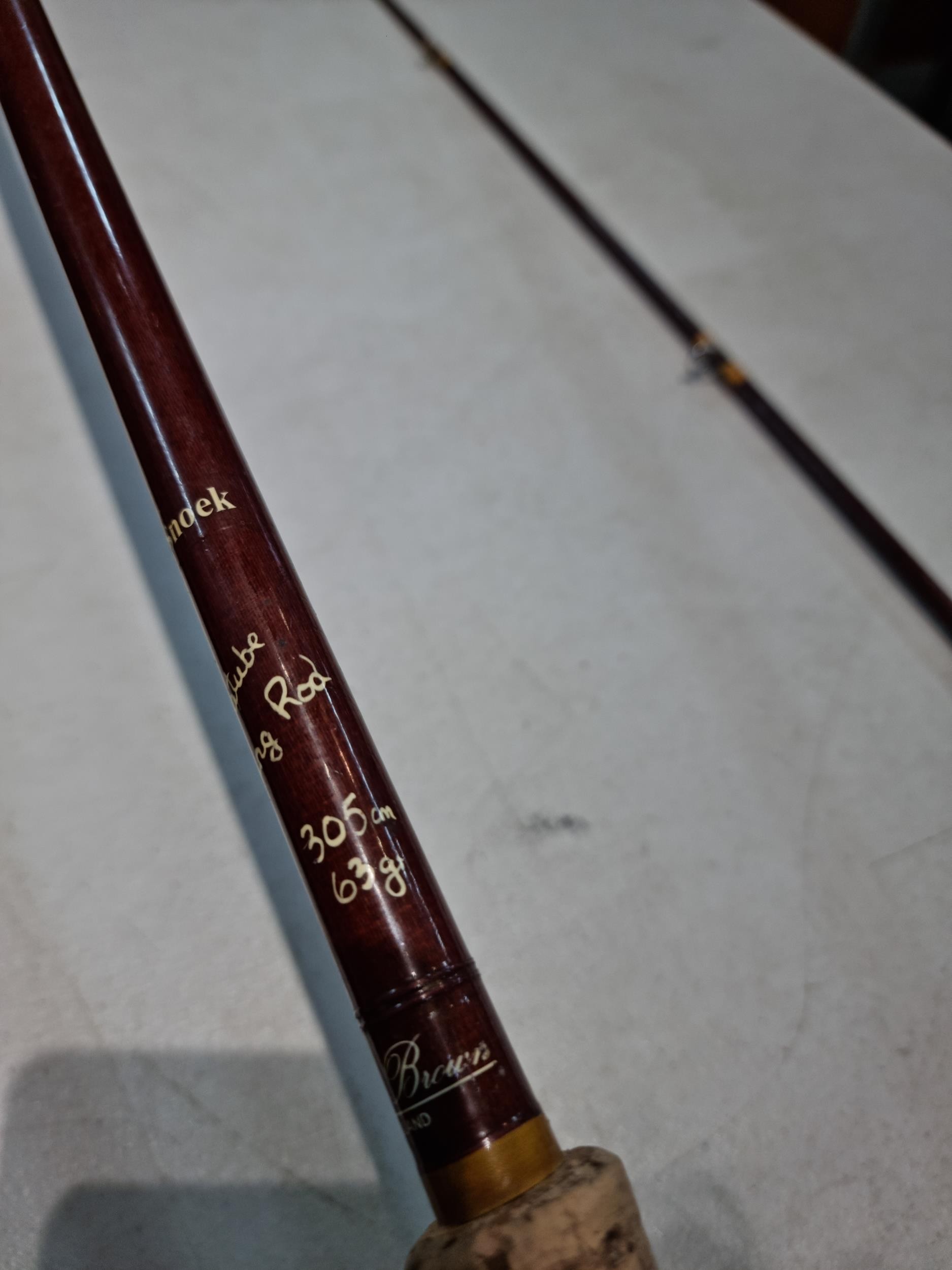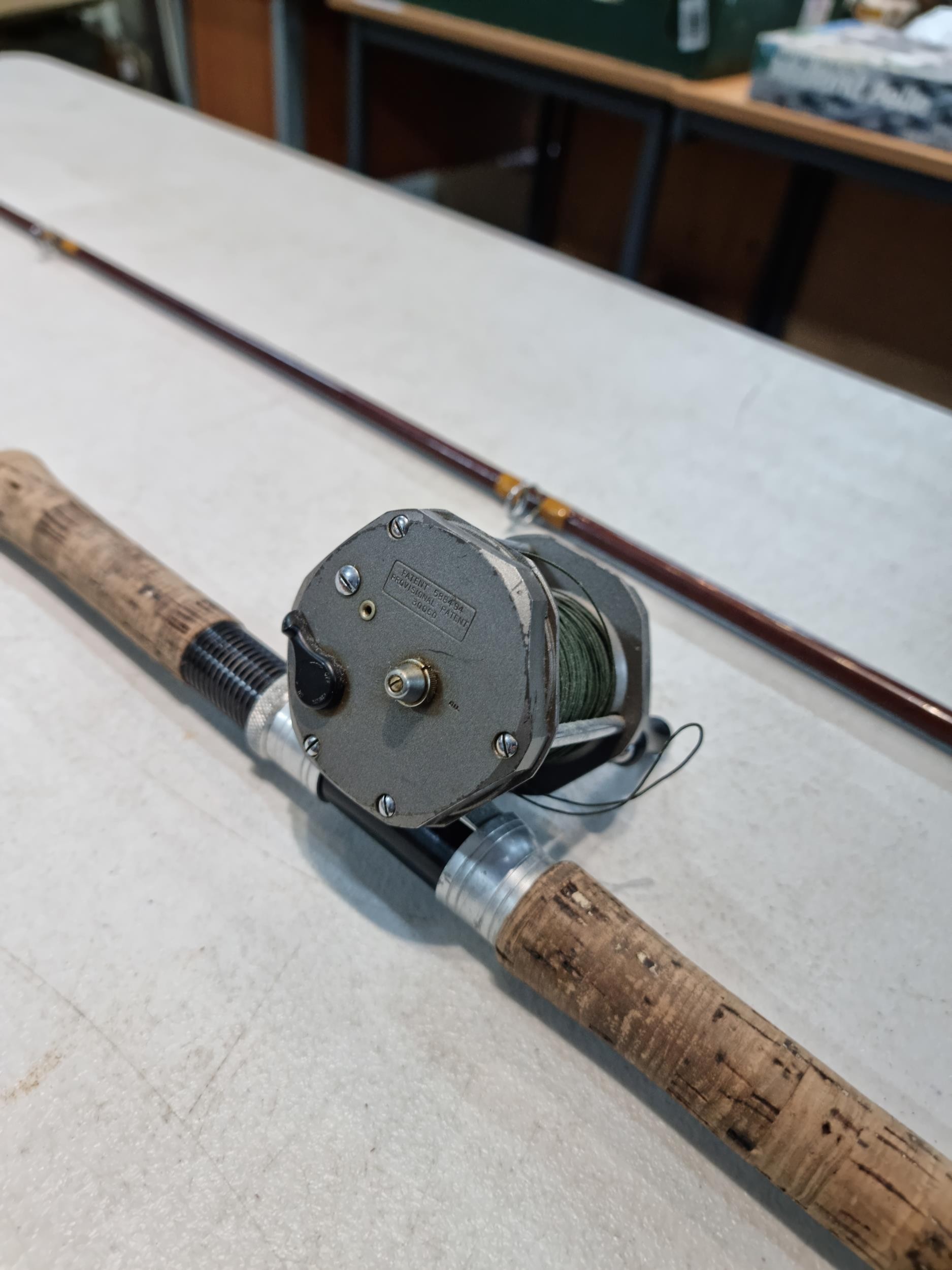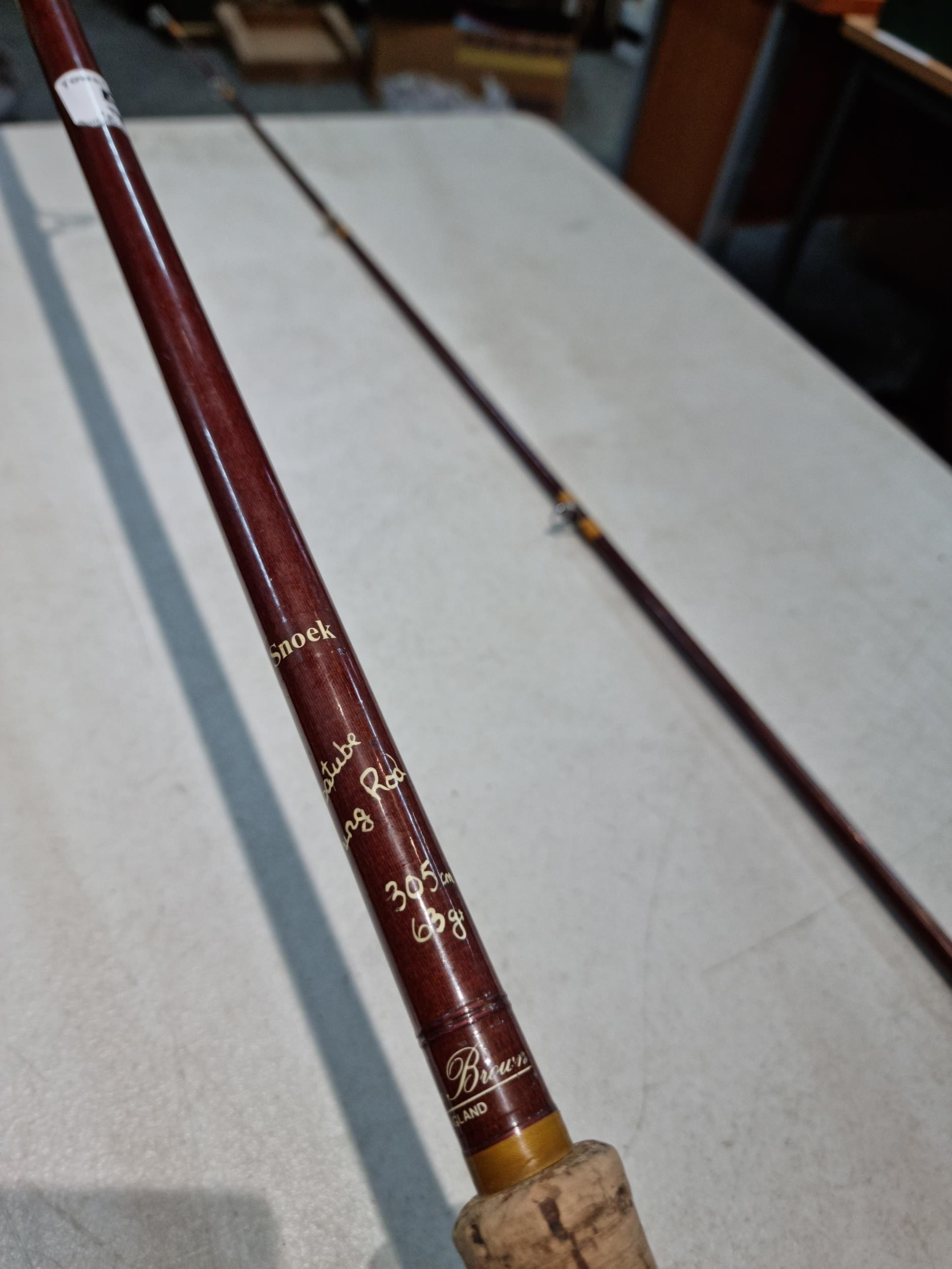 Good quality vintage fishing Rod by Alan Brown measures 10ft in length, 2 1/4 pound test curve, fibre tube, spinning rod (De Shock) with associated Young's Gildex multiplayer reel