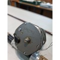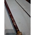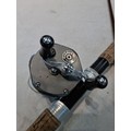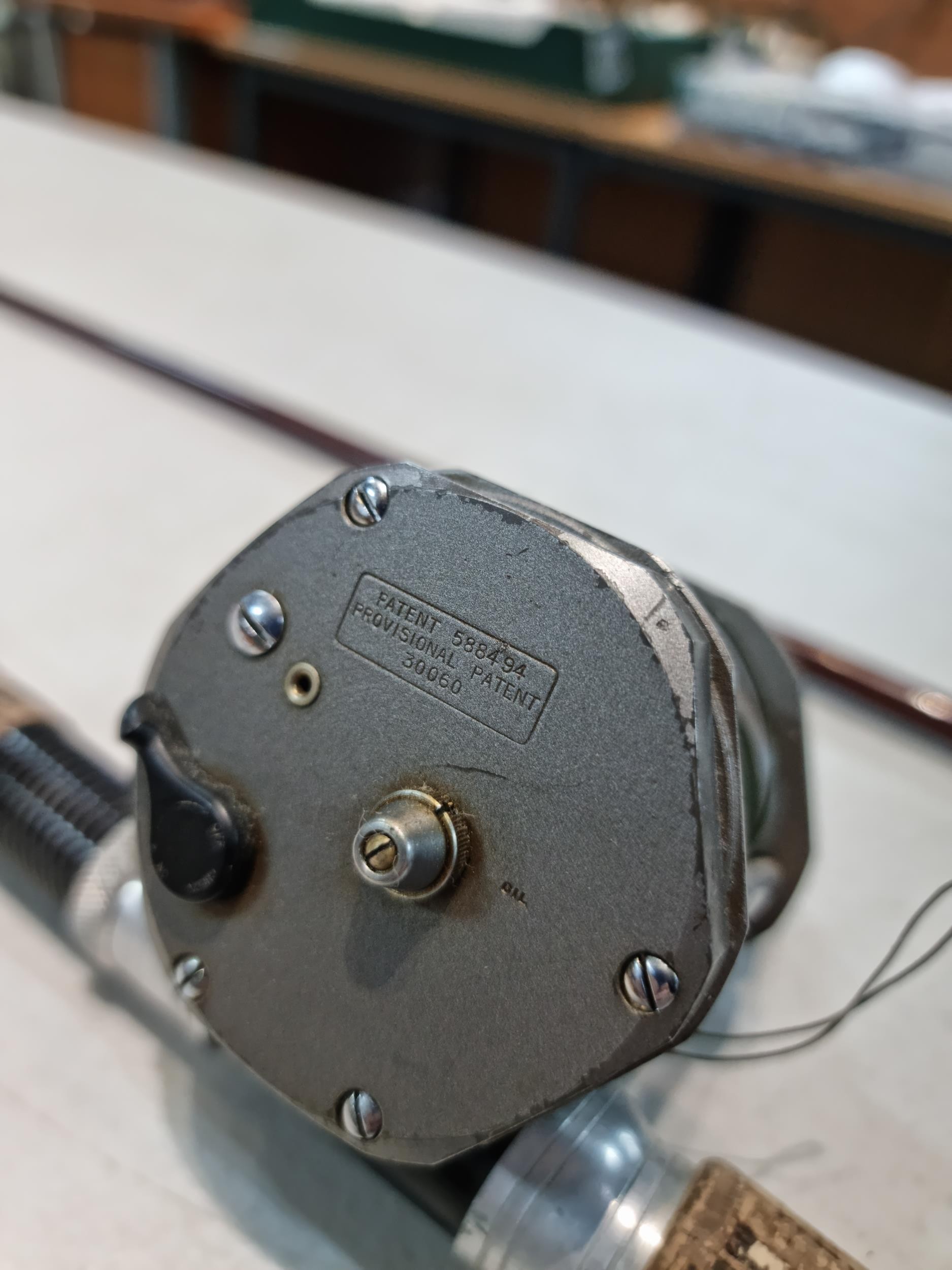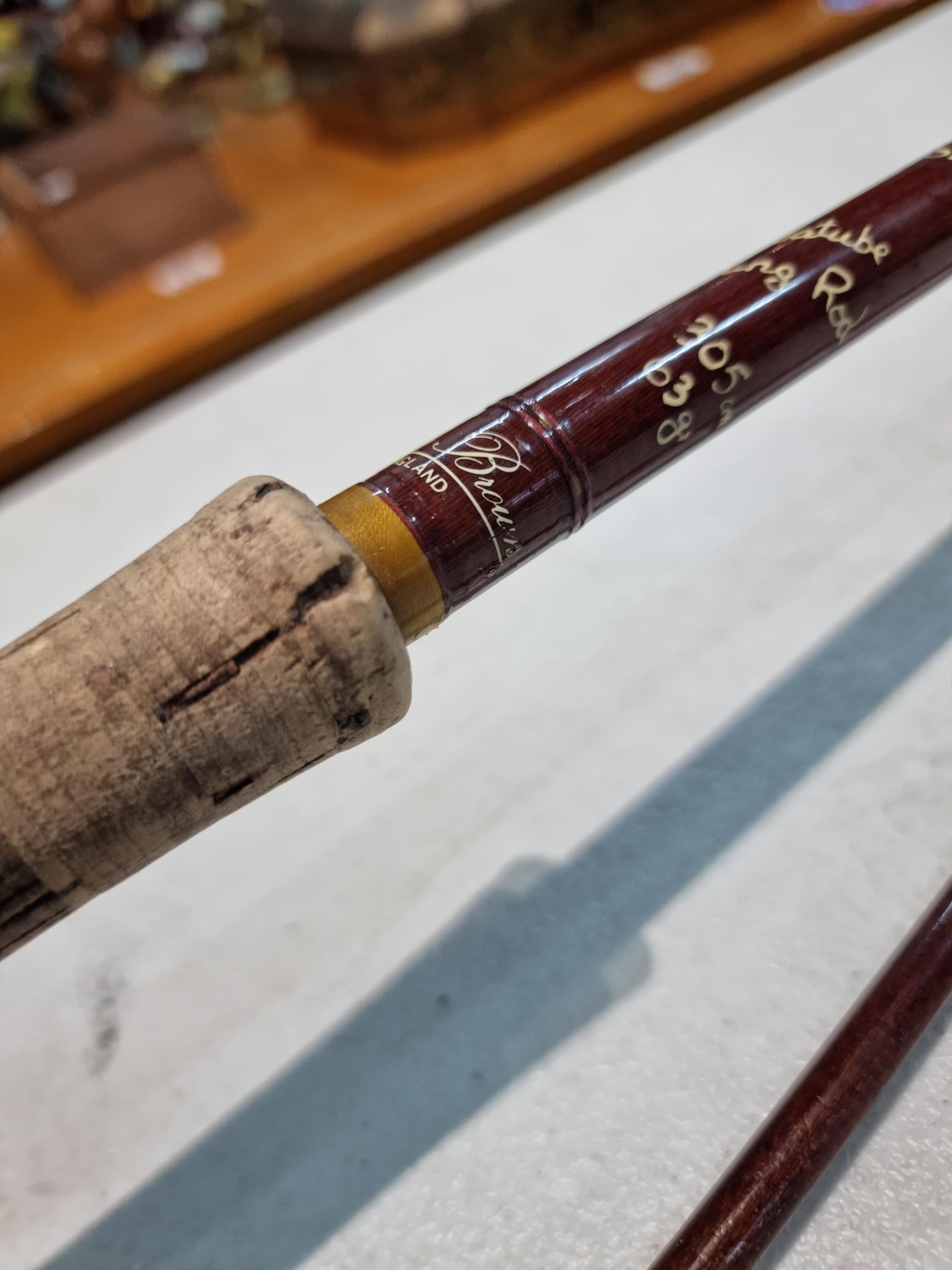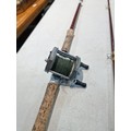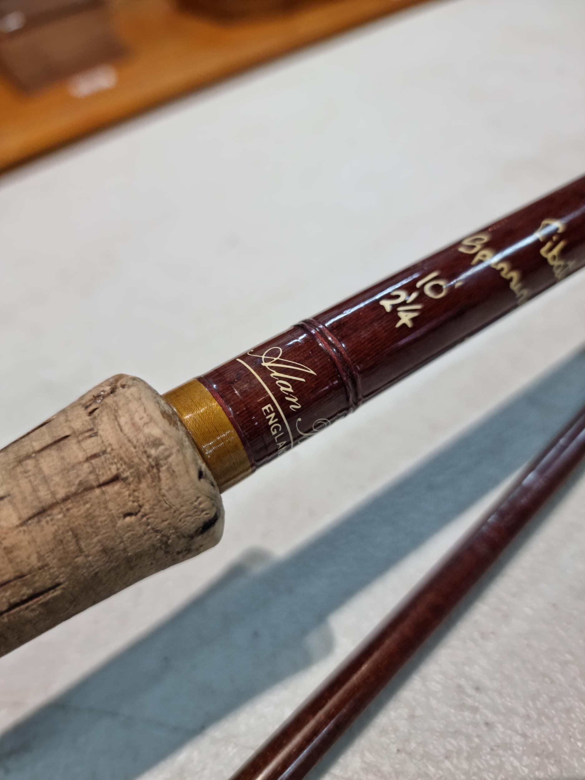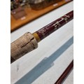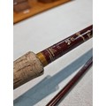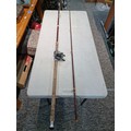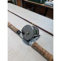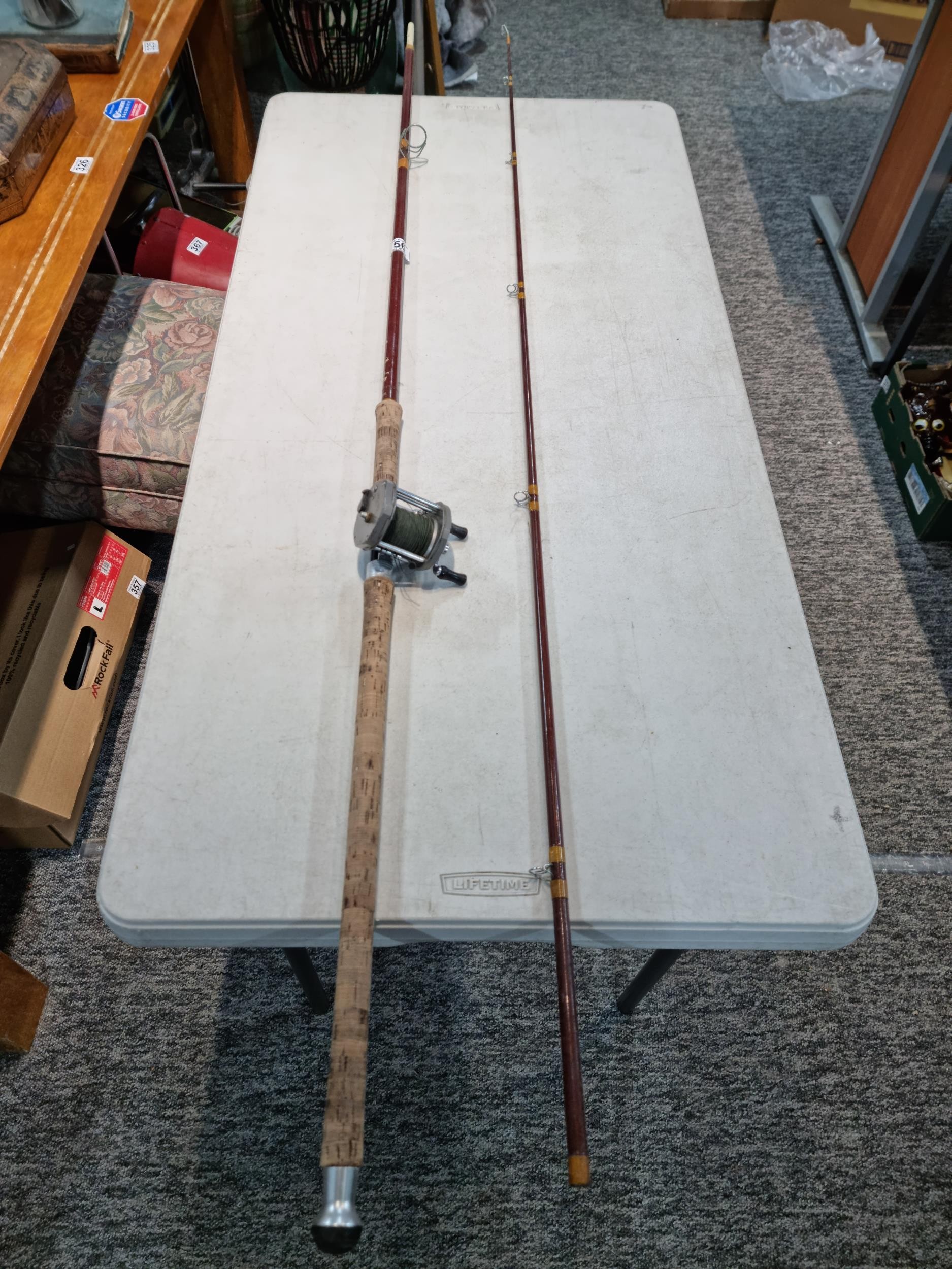 Good quality vintage fishing Rod by Alan Brown measures 10ft in length, 2 1/4 pound test curve, fibre tube, spinning rod (De Shock) with associated Young's Gildex multiplayer reel