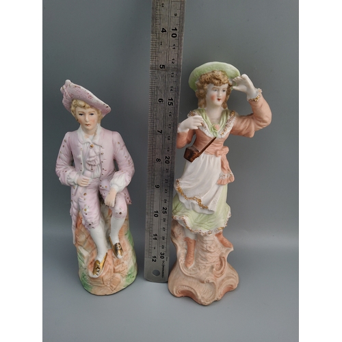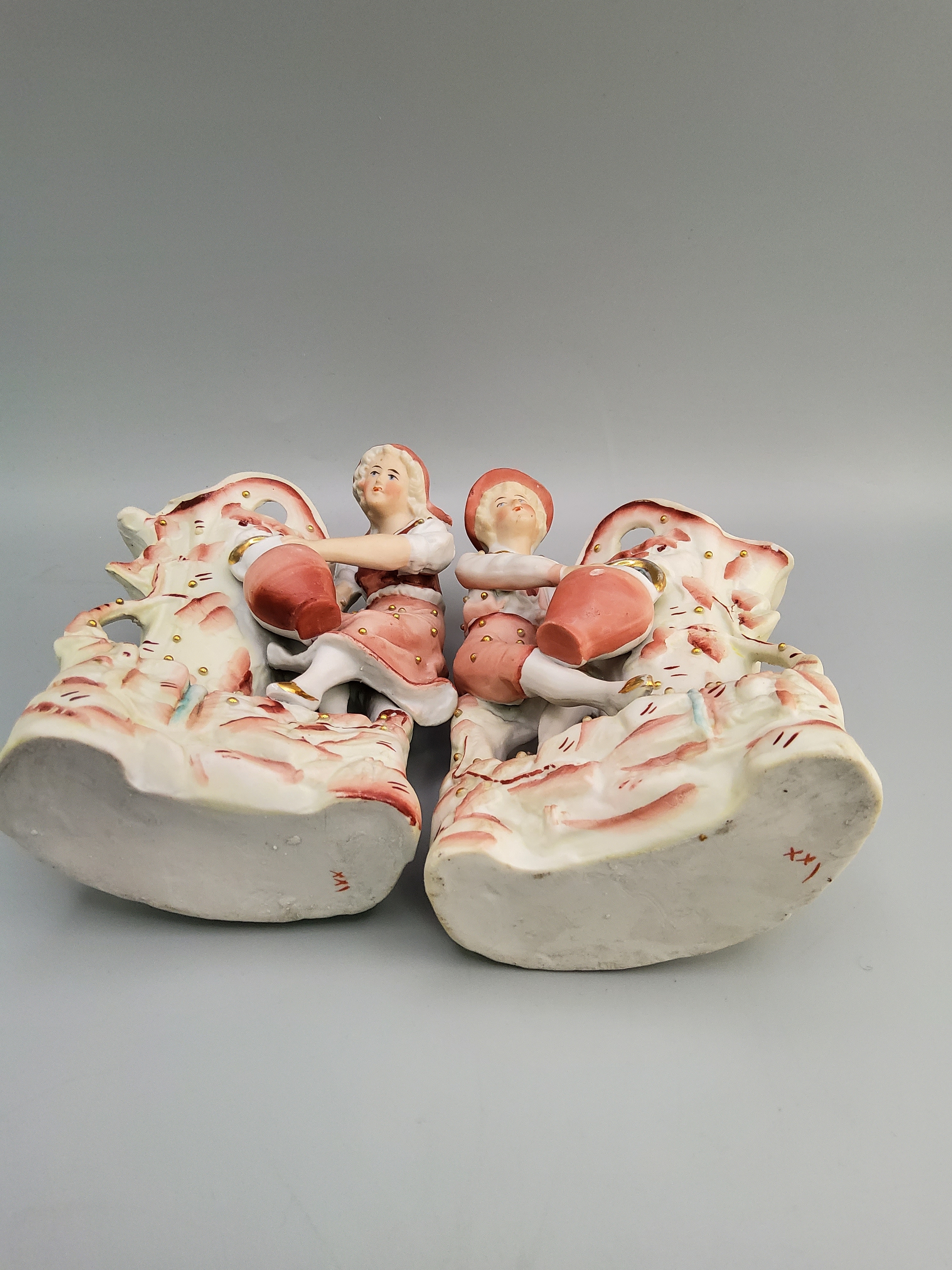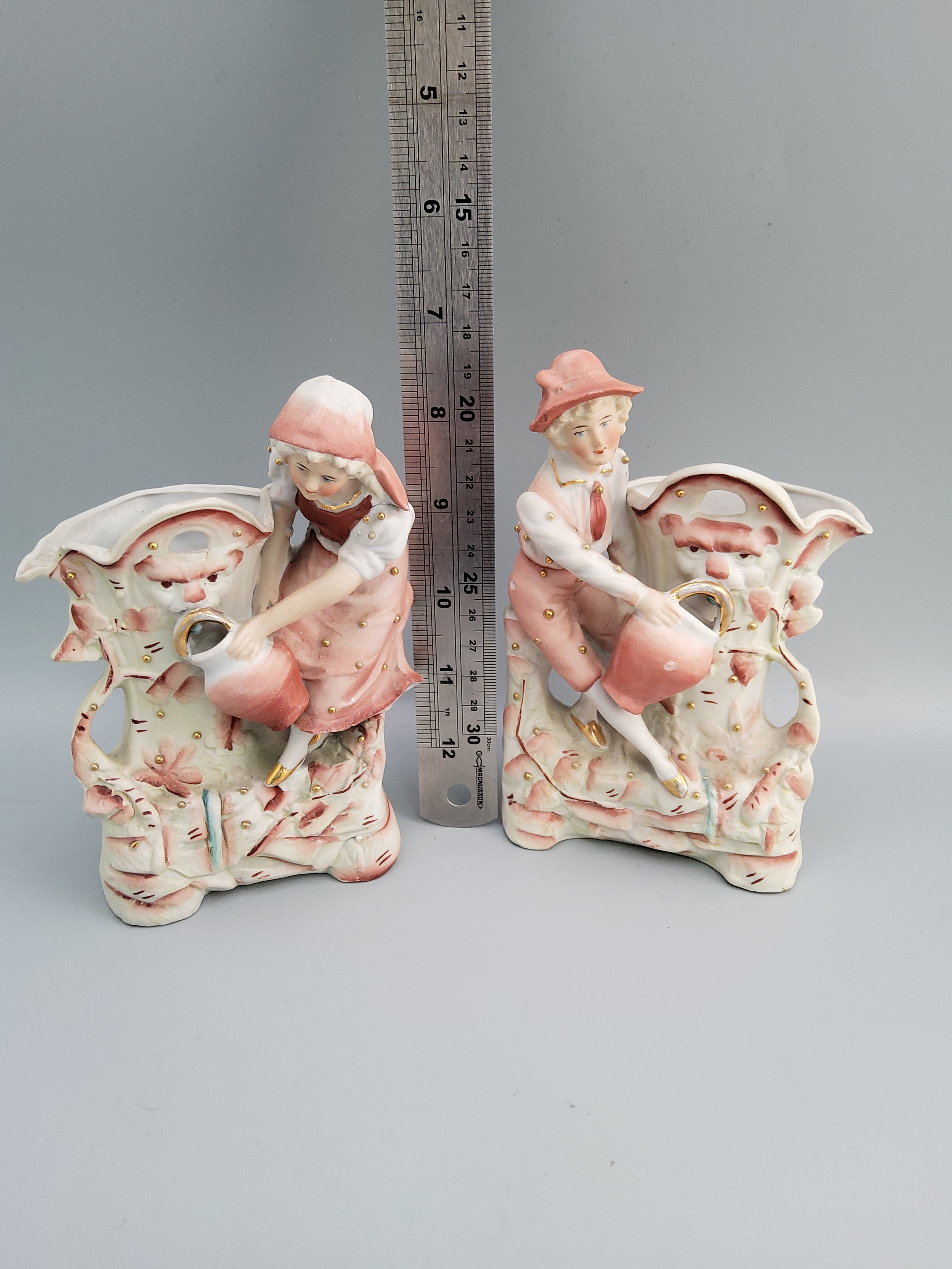 Vintage Bisque porcelain spill vases featuring a boy and girl watering plants