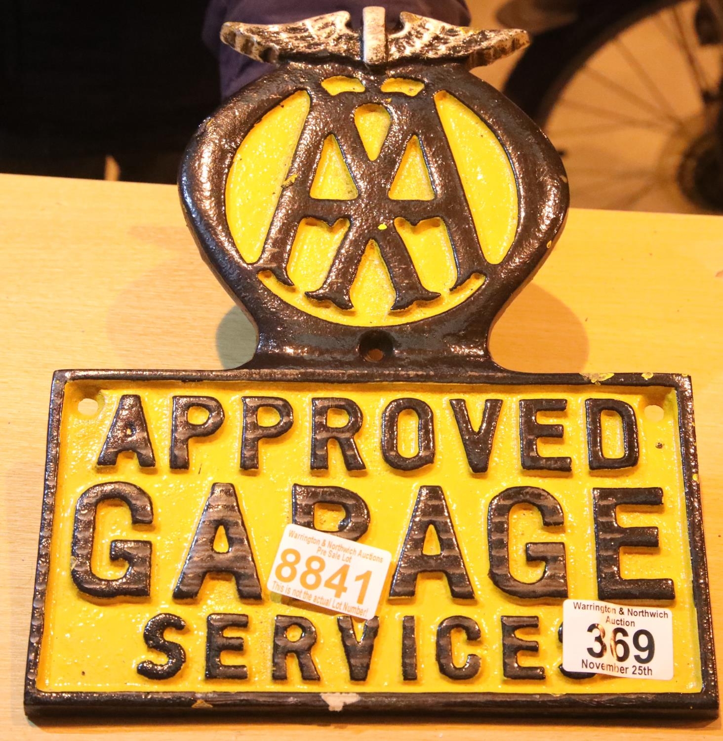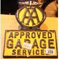 Cast iron AA Approved Garage Services sign, 28 x 23 cm. P&P Group 1 (£14+VAT for the first lot and £1+VAT for subsequent lots)