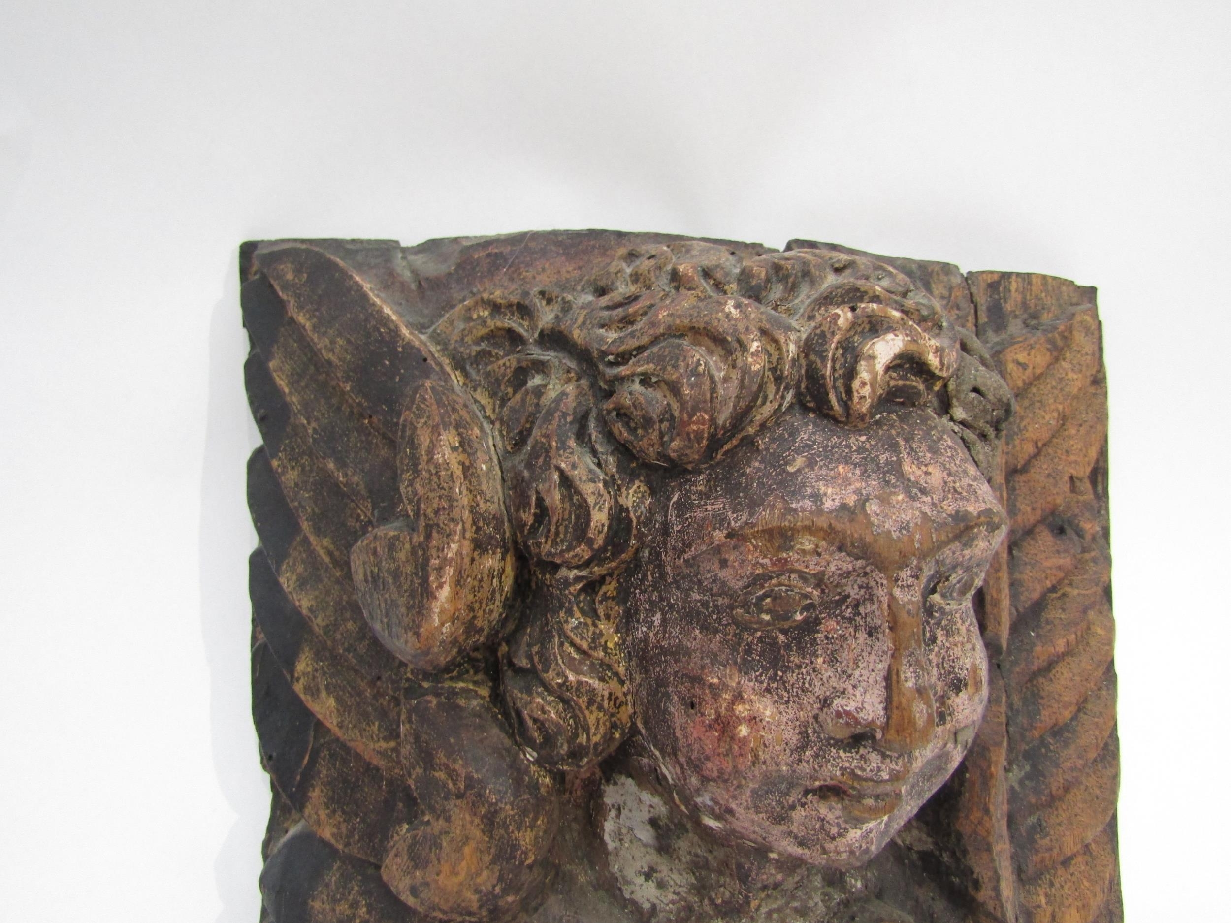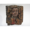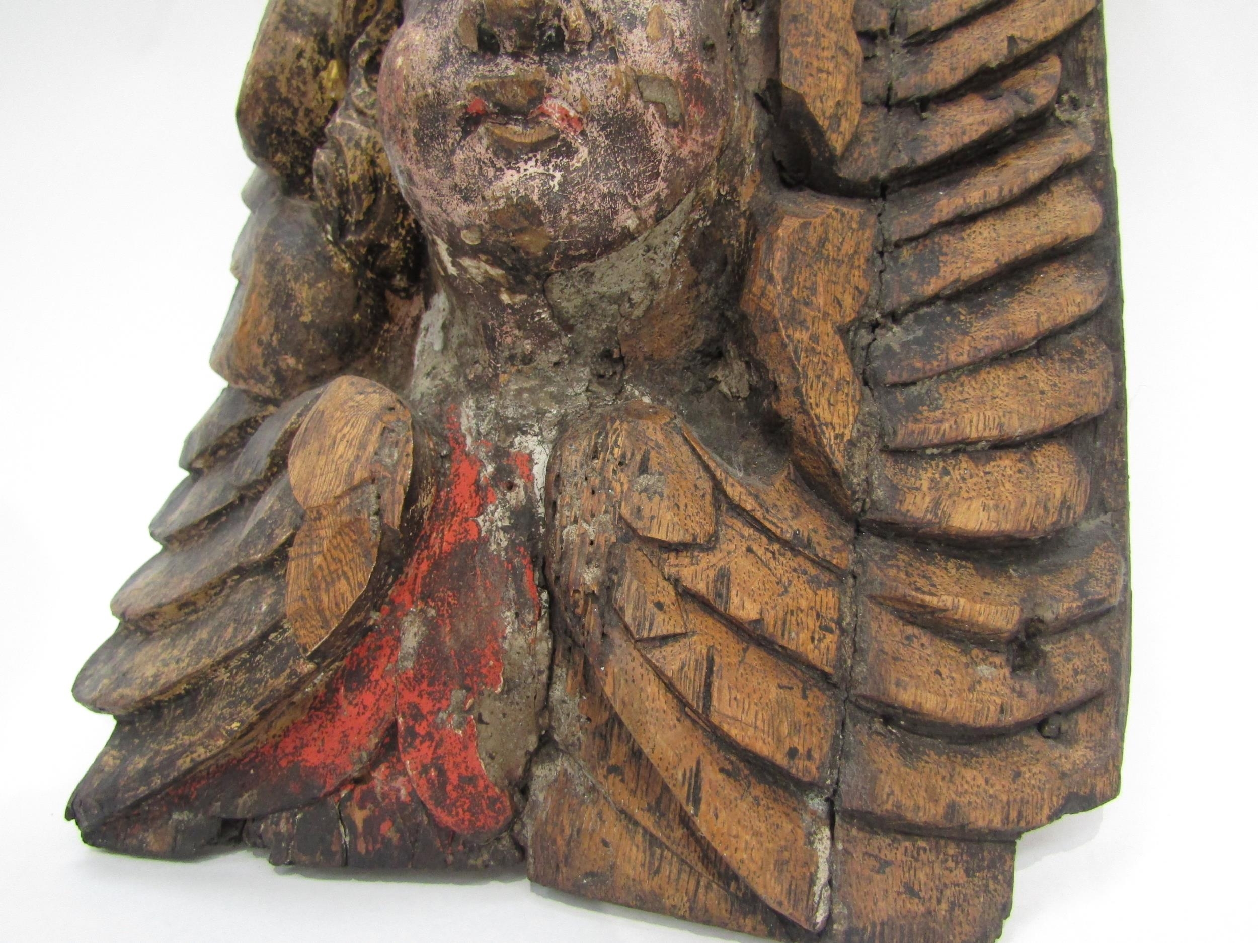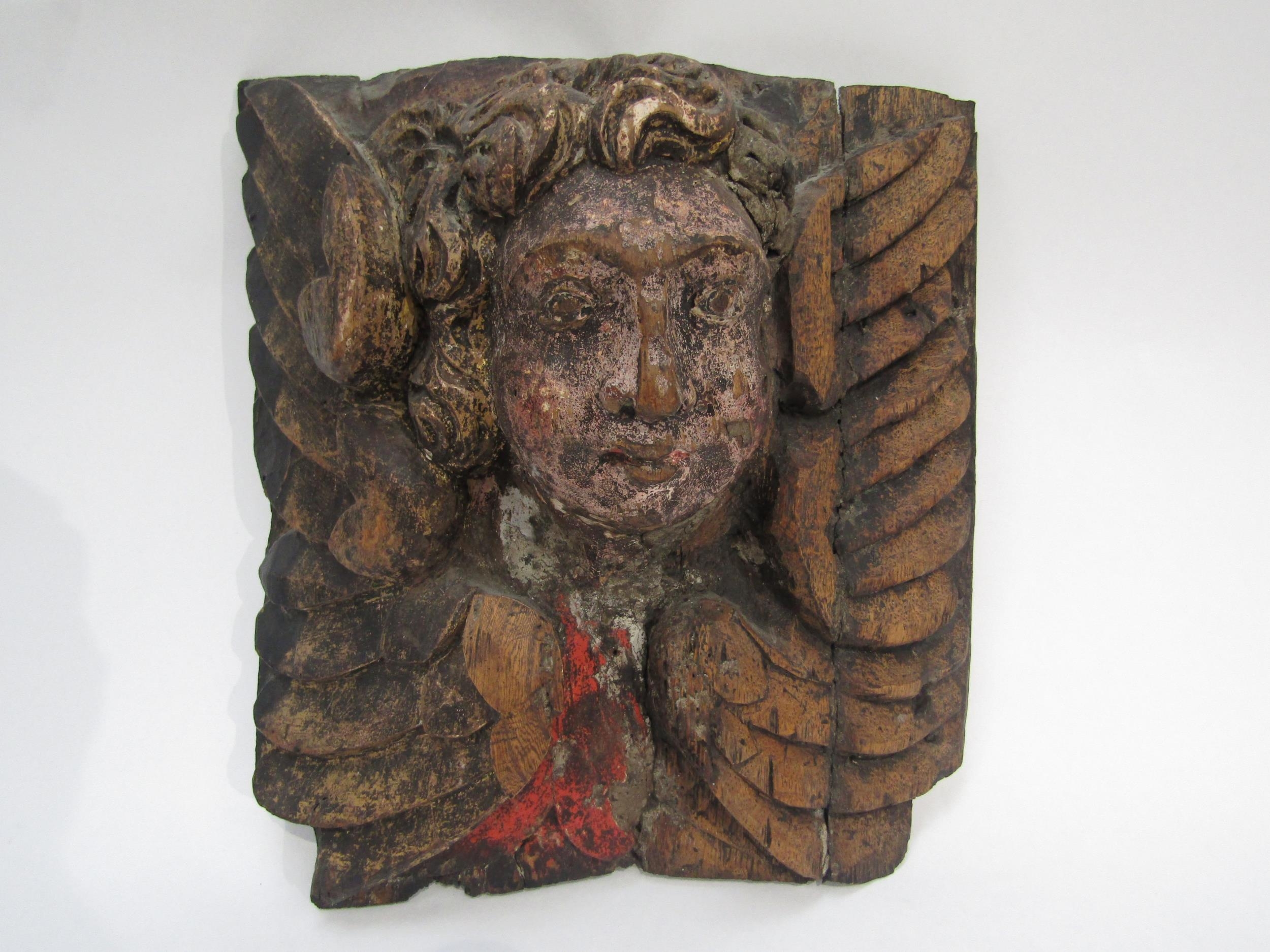 A 17th Century polychrome, carved wood Angel corbel, 30cm x 28cm
