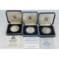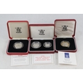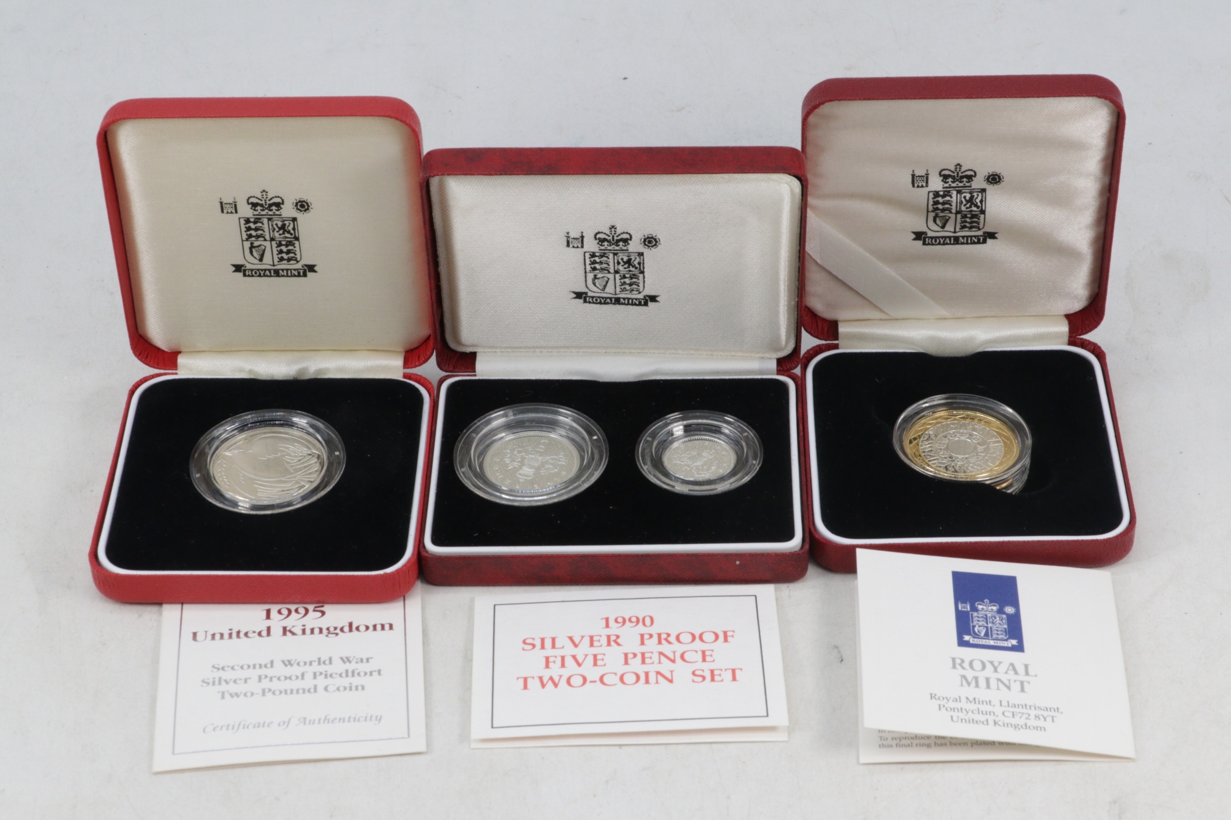 1995 World war 2 silver proof pied fort two pound coin, 1990 Silver proof Five pence two coin set and 1997 silver proof two pound coin.