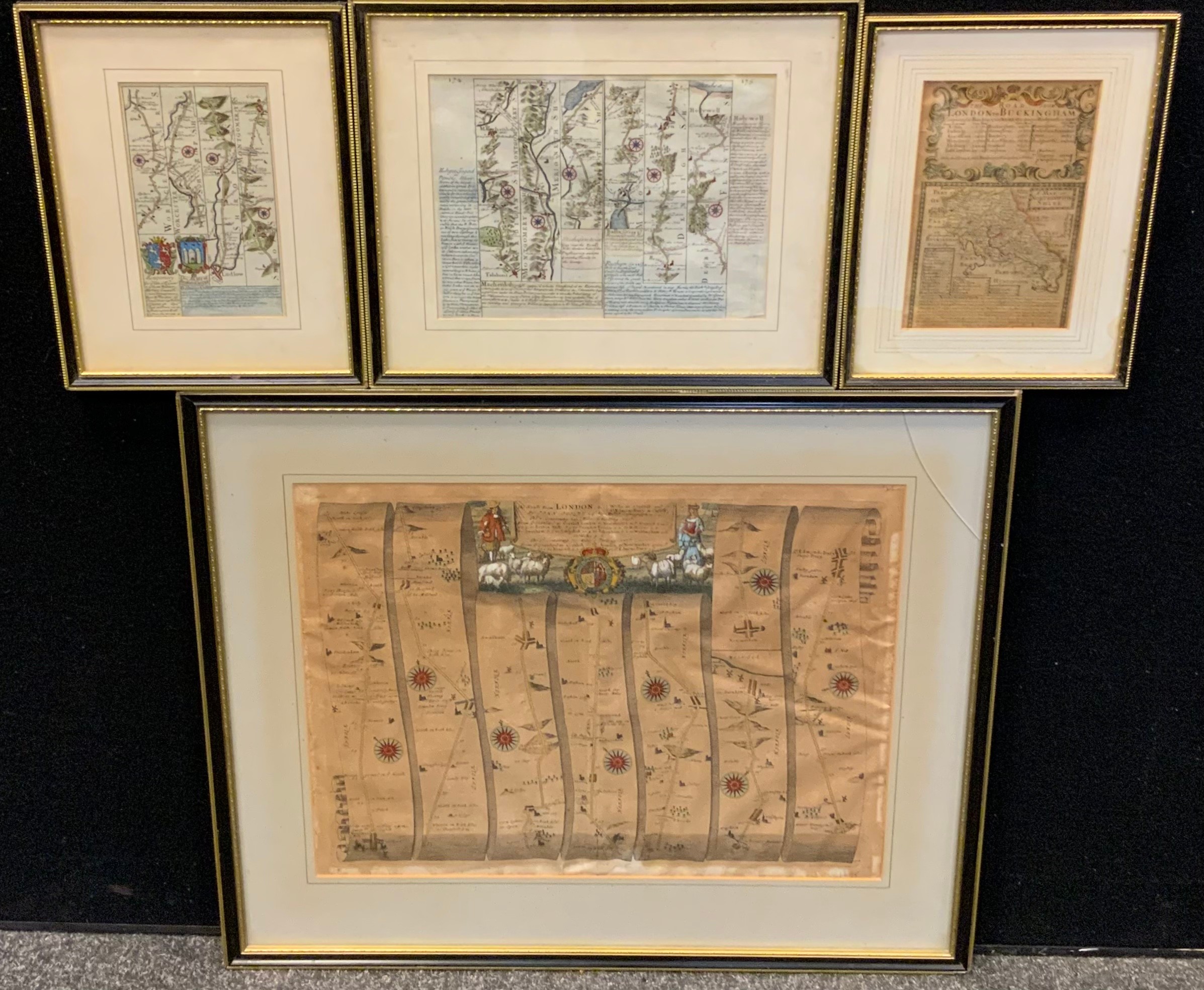 Ogilby (John). The Road from London to Wells in Norfolk, hand coloured engraved strip road map, 350 x 450 mm; others London Buckingham; Holywell and Ludlow (4)