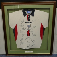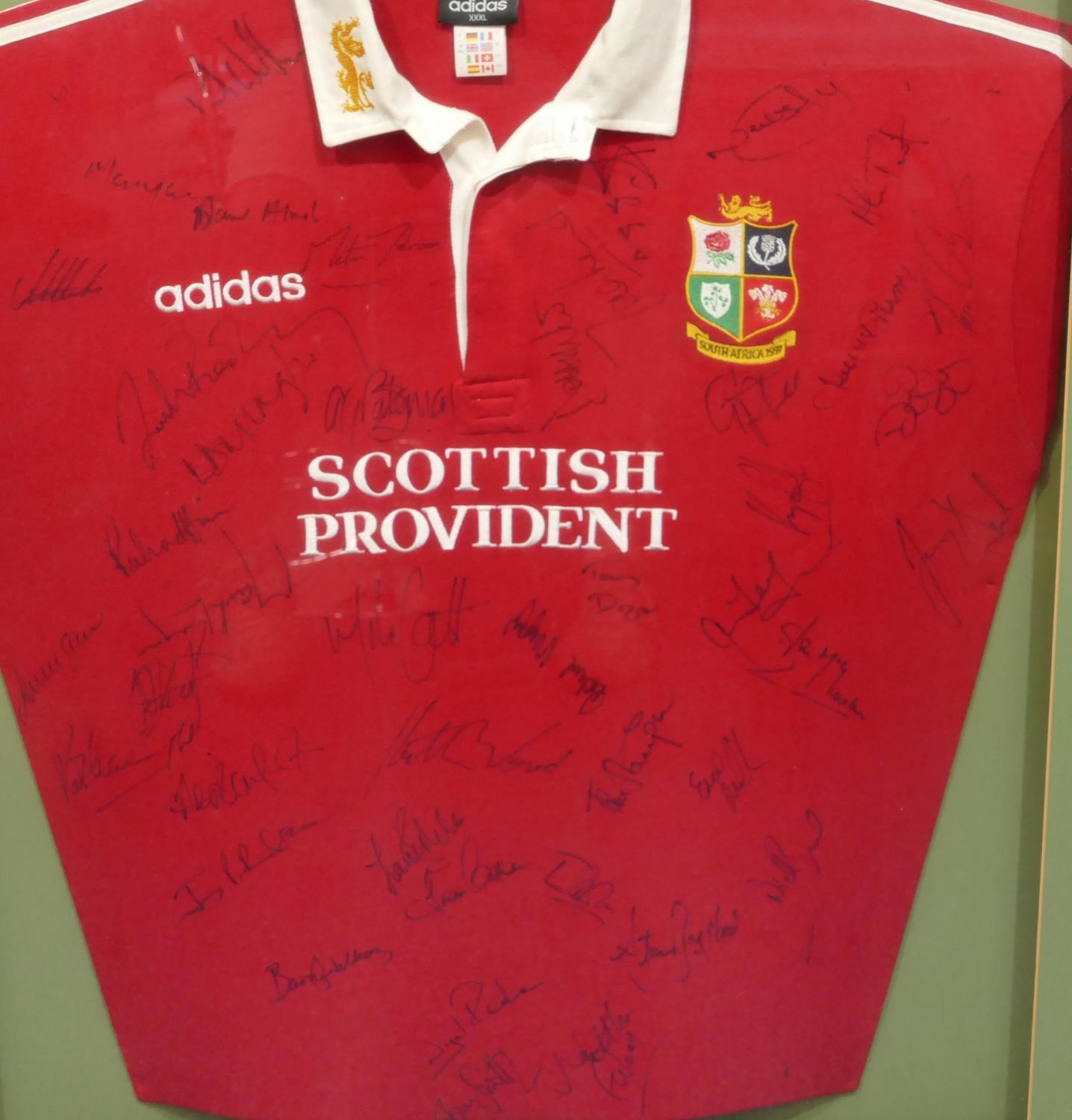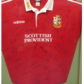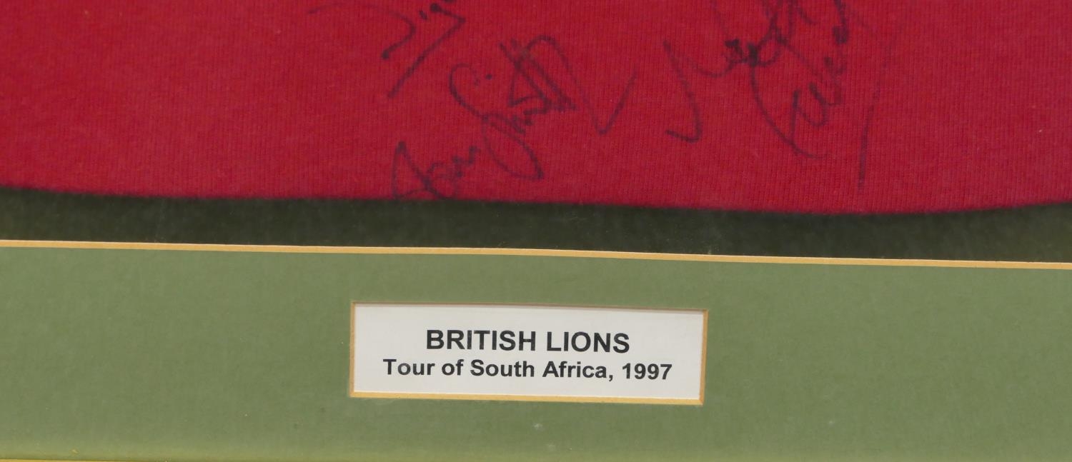 A signed British Lions rugby shirt "Tour of South Africa 1997", framed, overall size 106 x 91cm.