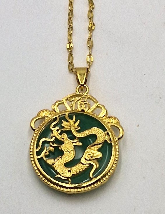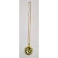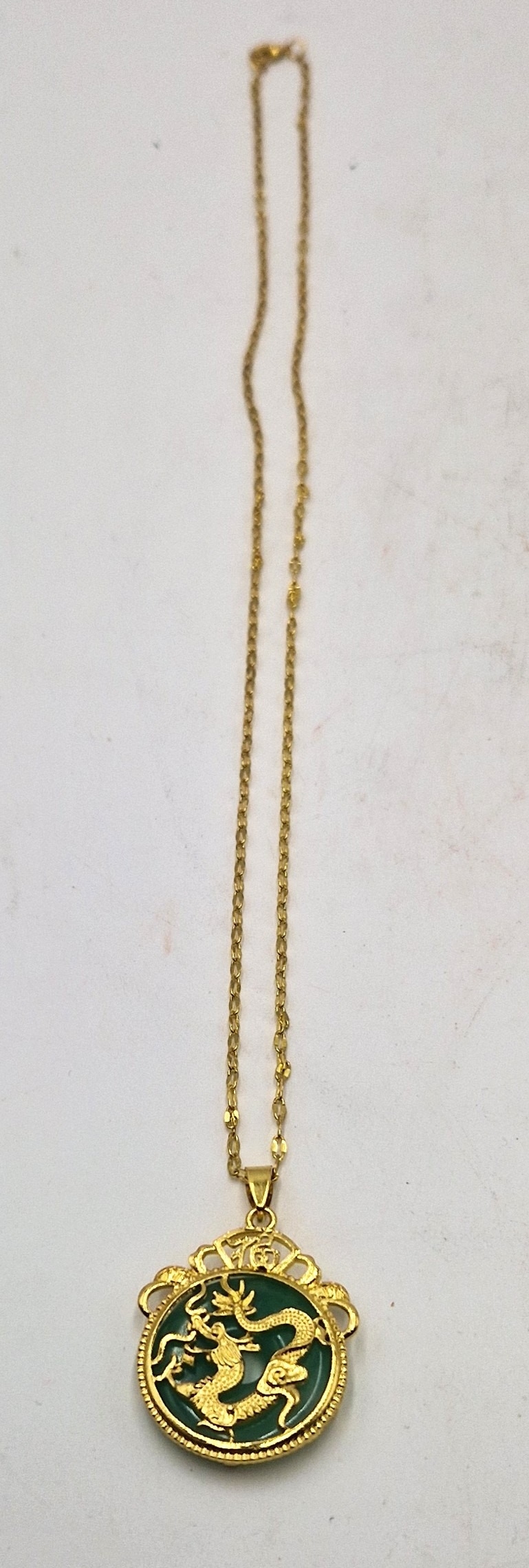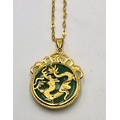 YELLOW METAL PENDANT FEATURING A STYLISED DRAGON MOTIF AGAINST A BLACK BACKGROUND ON A YELLOW METAL NECK CHAIN (Boxed)