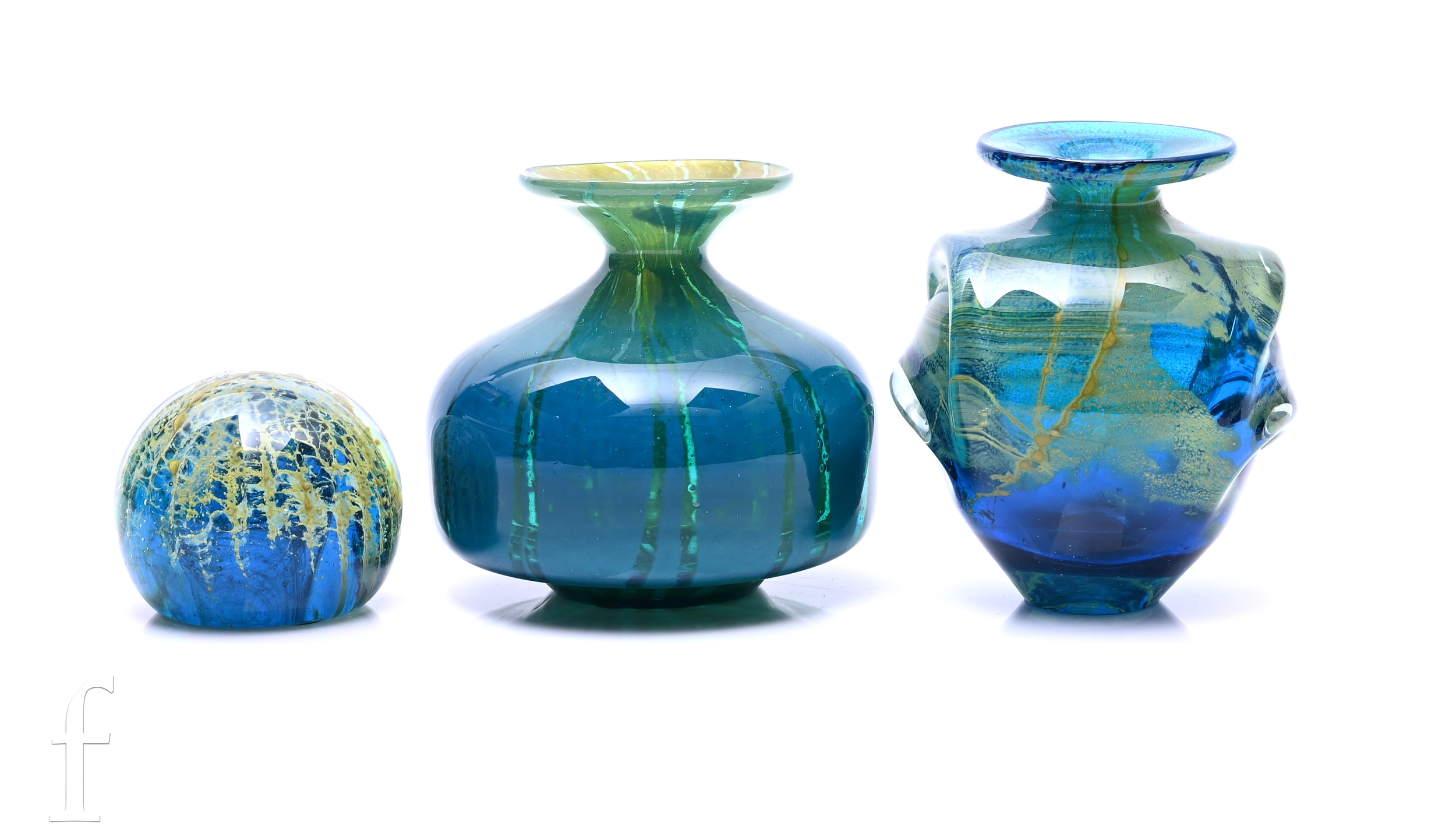 A Mdina eared glass vase of shouldered ovoid form with collar neck and flat rim, cased in clear crystal over green and blue ground, unmarked, together with a Ming range low shouldered vase and a spherical paperweight, tallest 23cm. (3)
