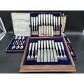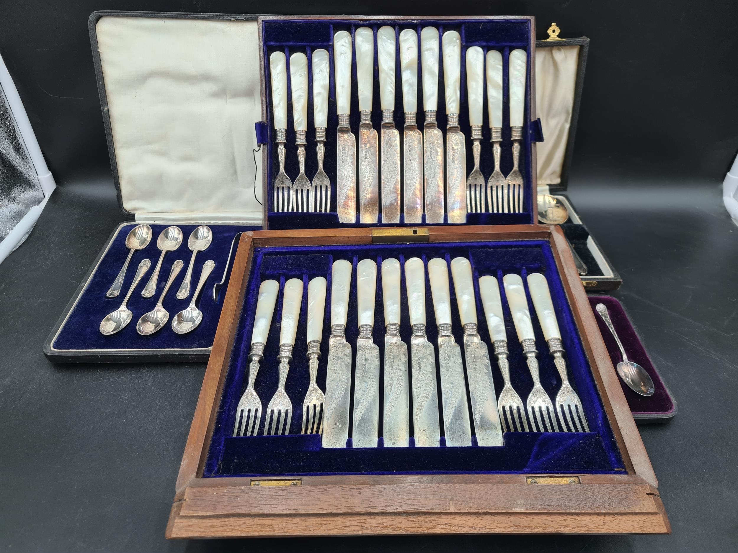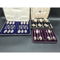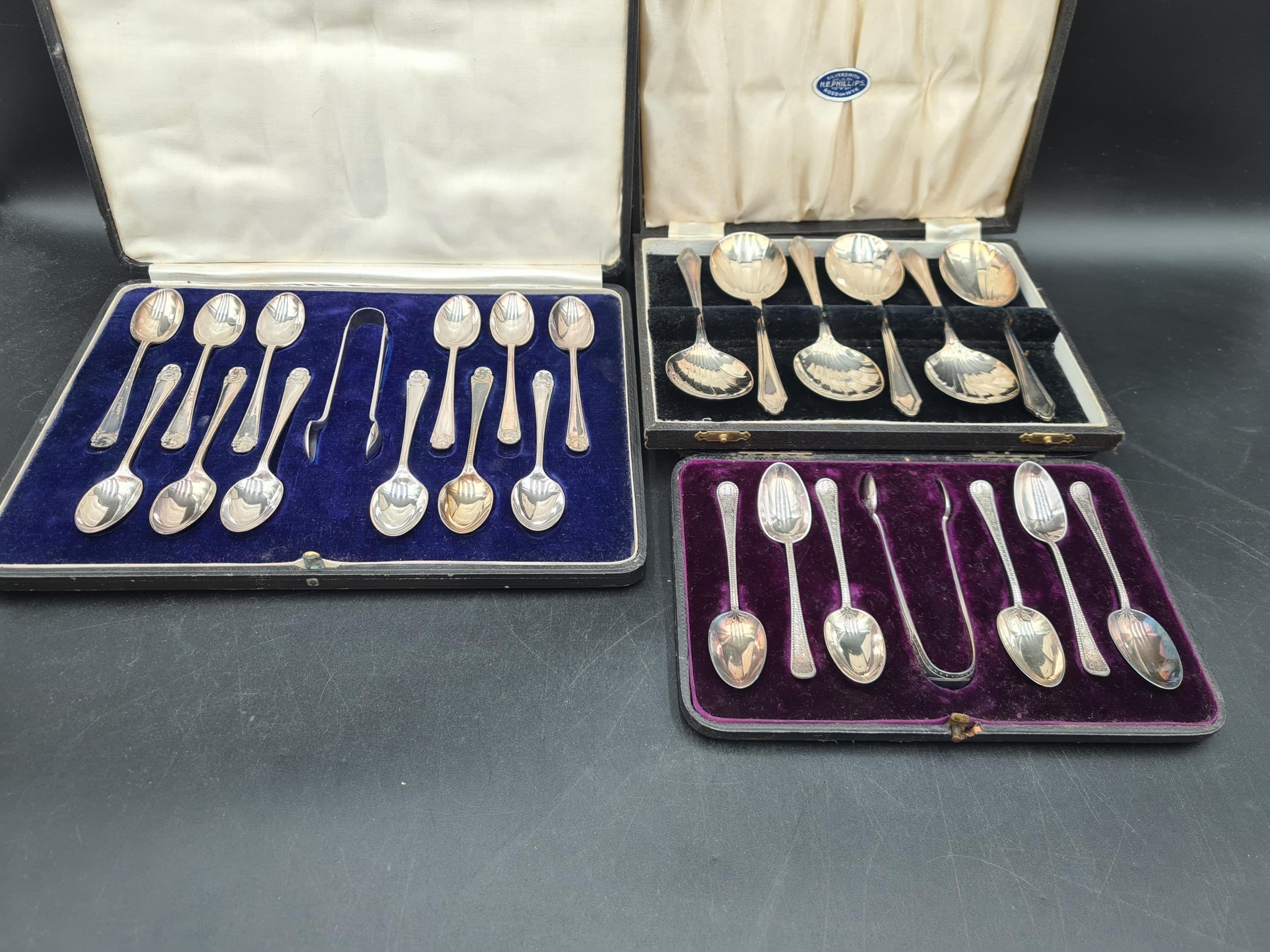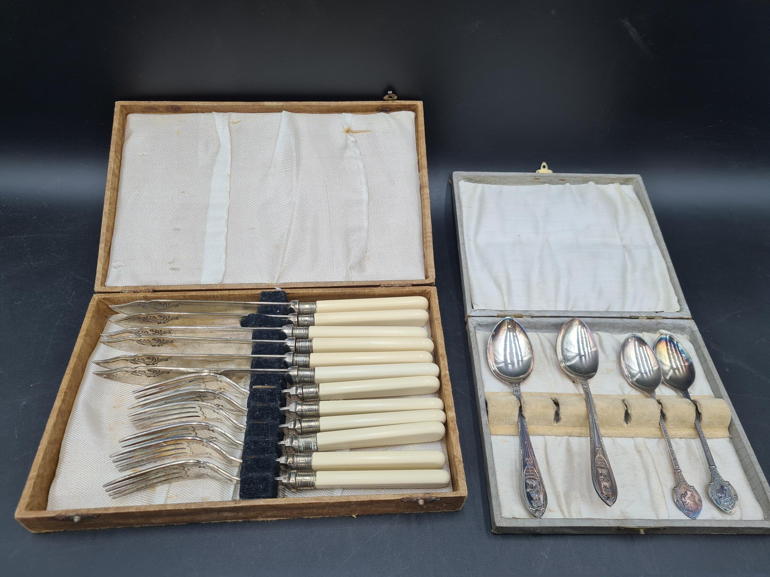 One dozen plated Teaspoons and Sugar Tongs, six Teaspoons and Sugar Tongs, Dessert Knives and Forks, Fruit Spoons, etc, all cased