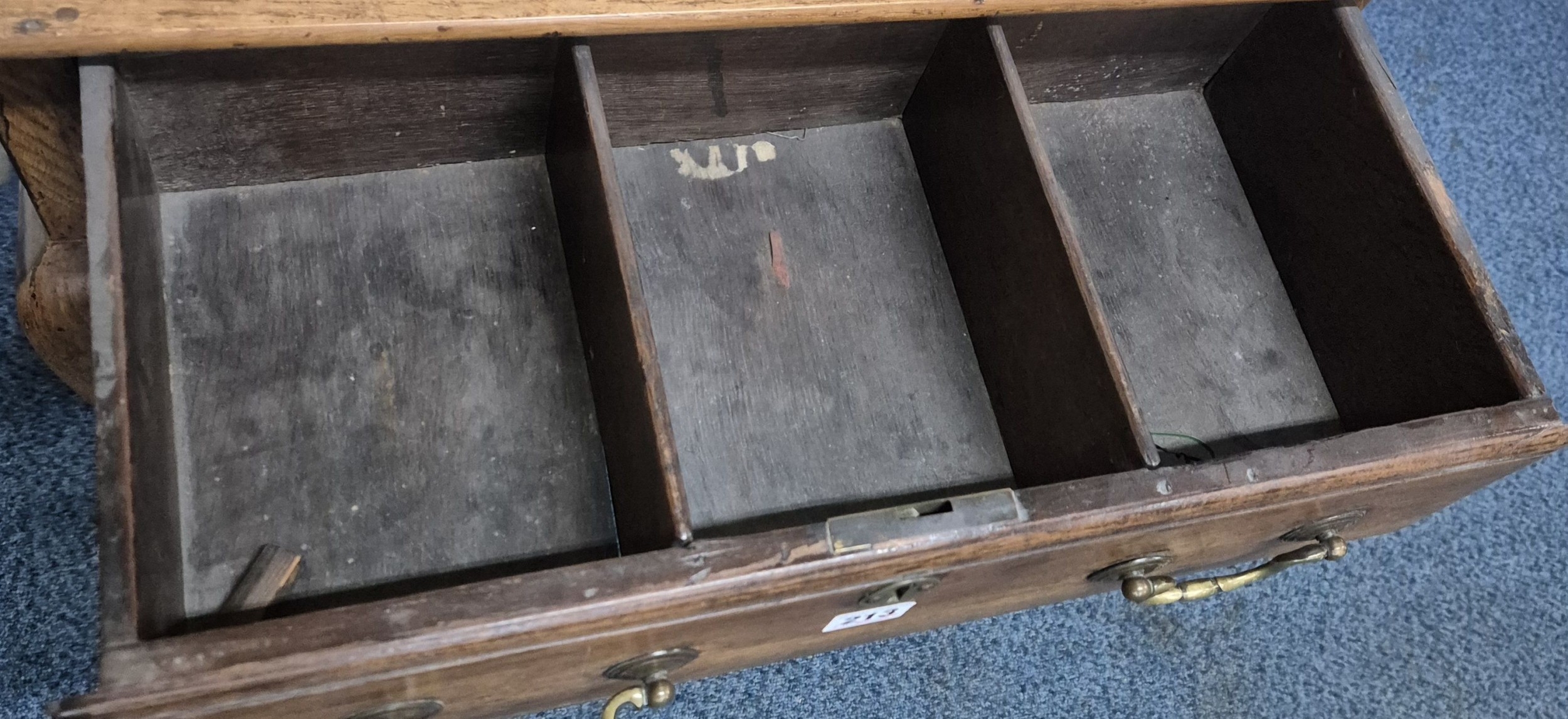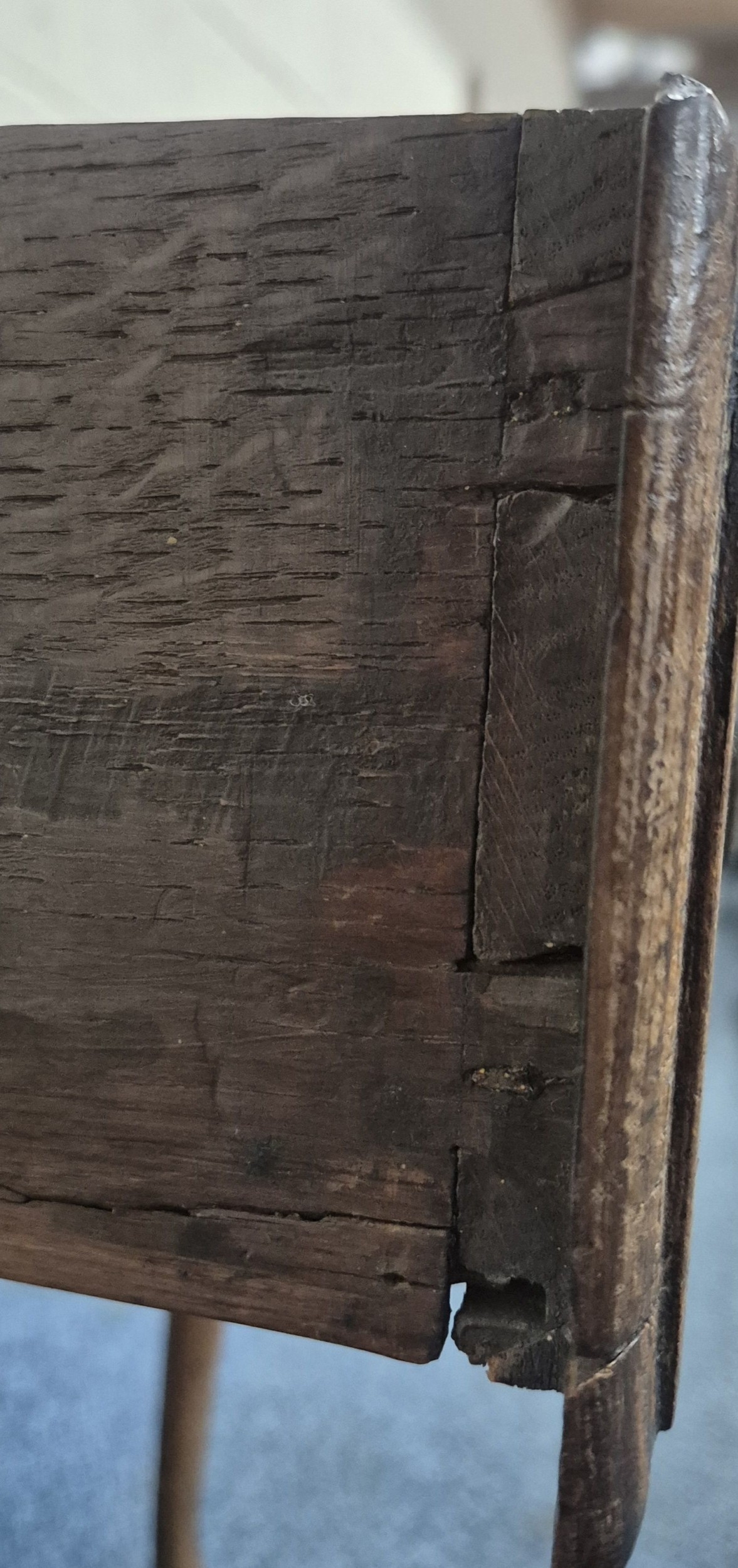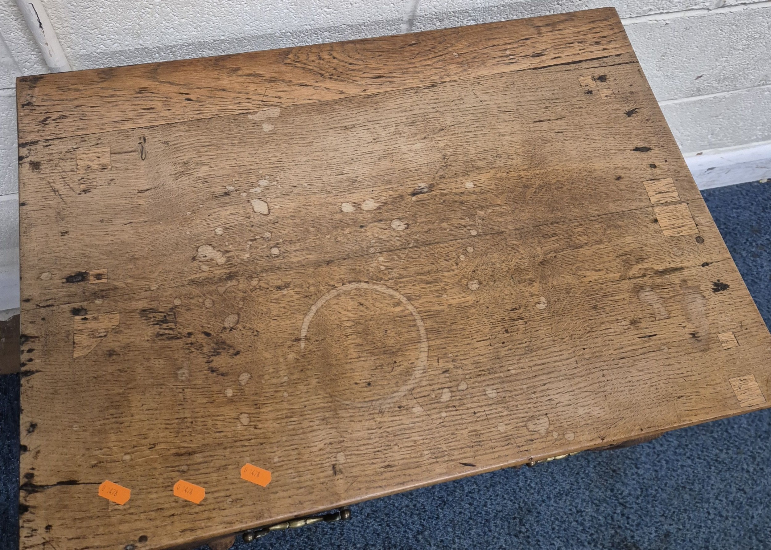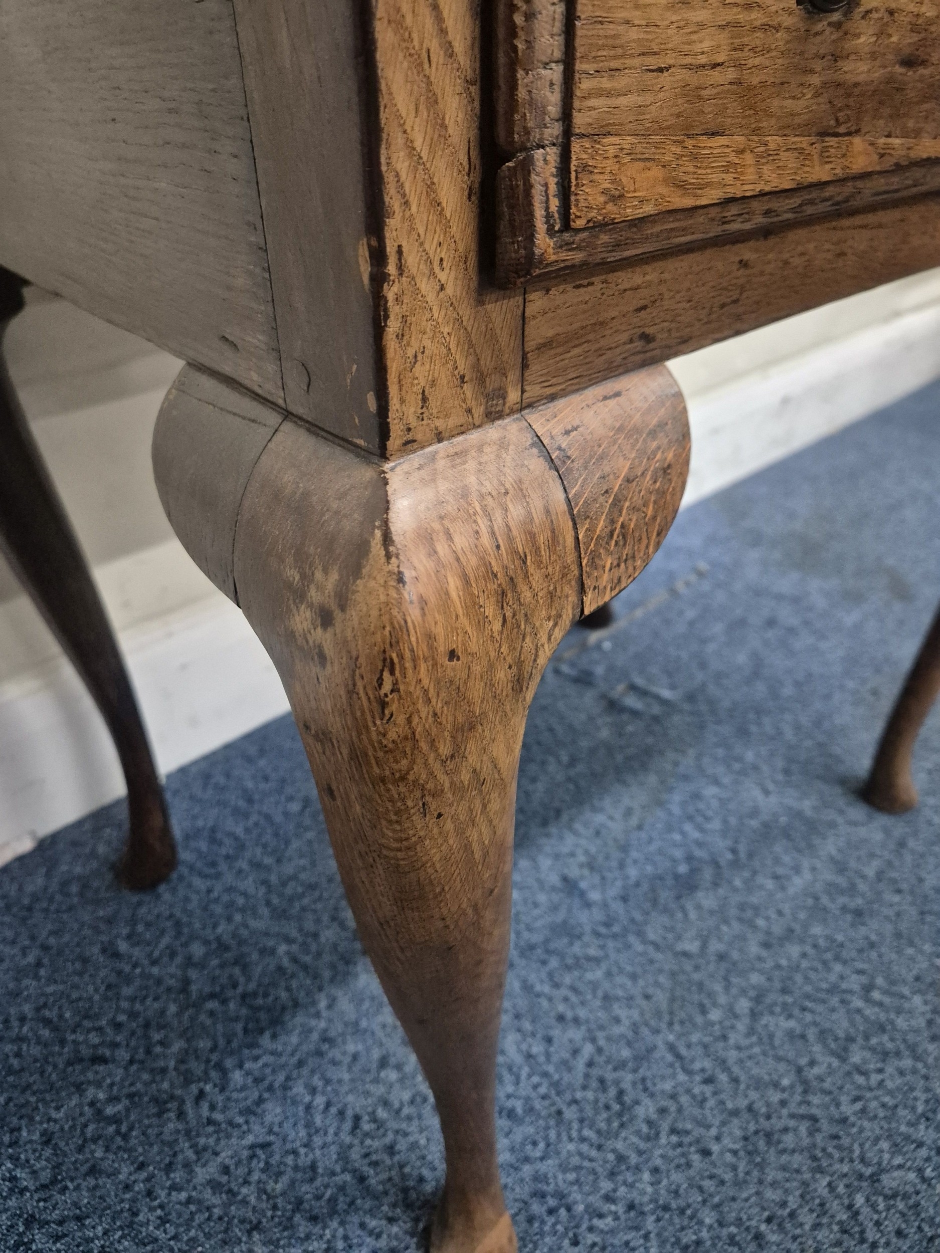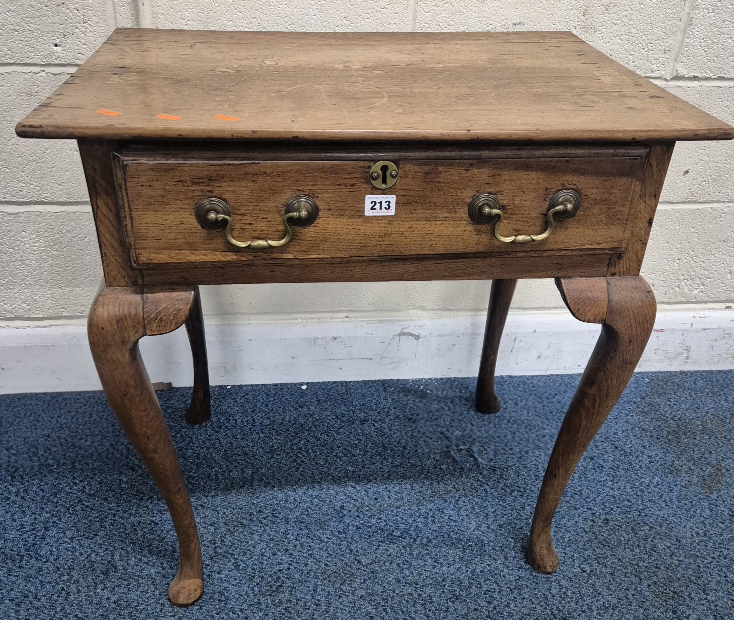 A GEORGIAN OAK LOWBOY, fitted with a single frieze drawer, raised on cabriole legs, width 69cm x depth 49cm x height 71cm, condition report: historical marks, scuffs, stains, splits, sun bleached, repairs, other wear and usage