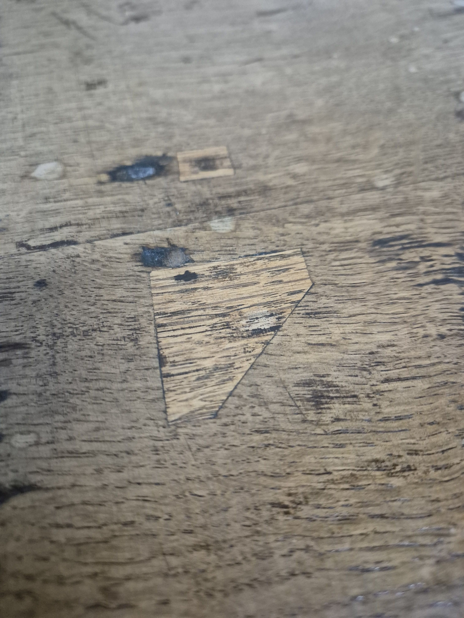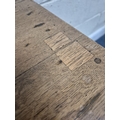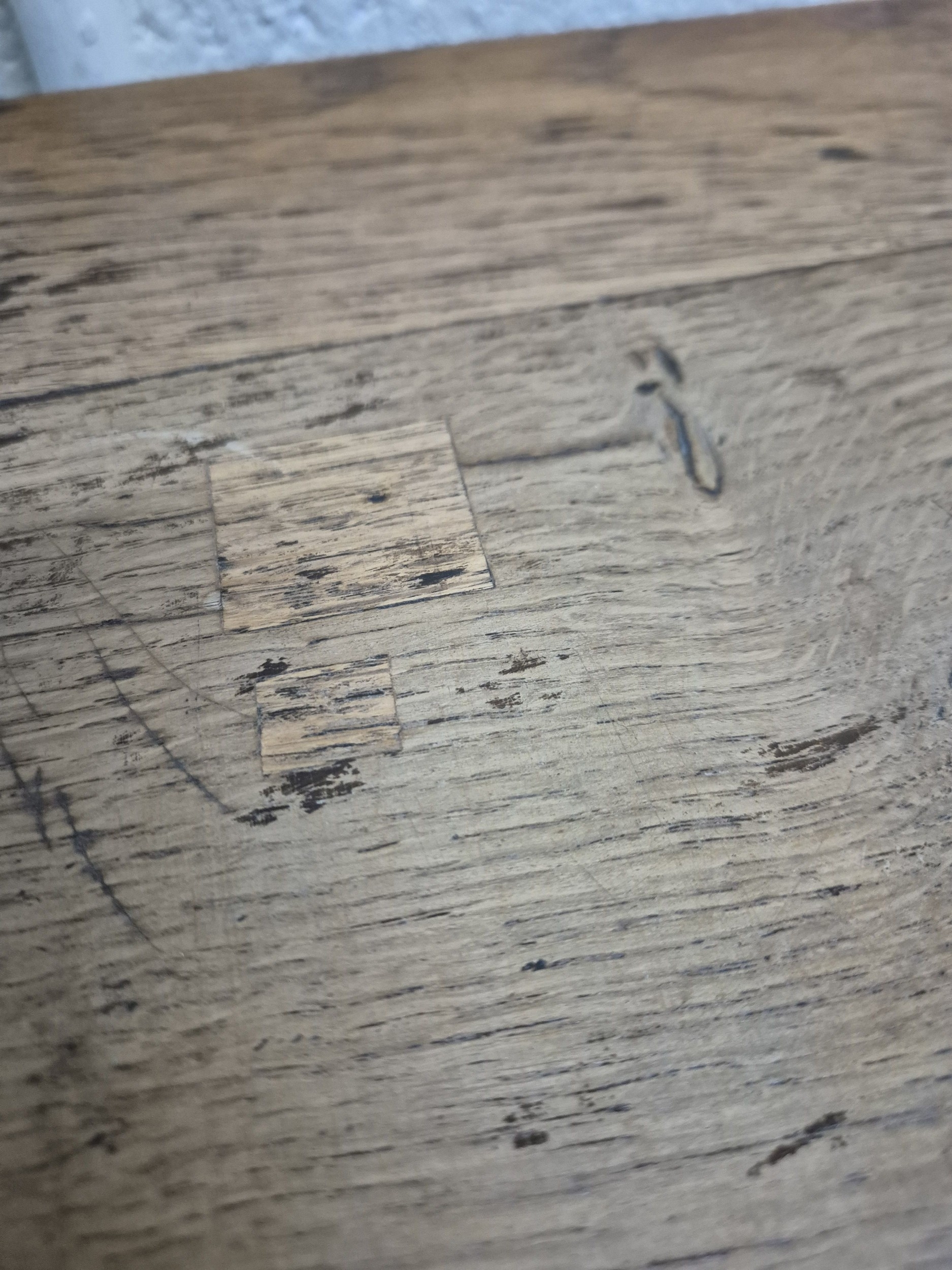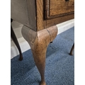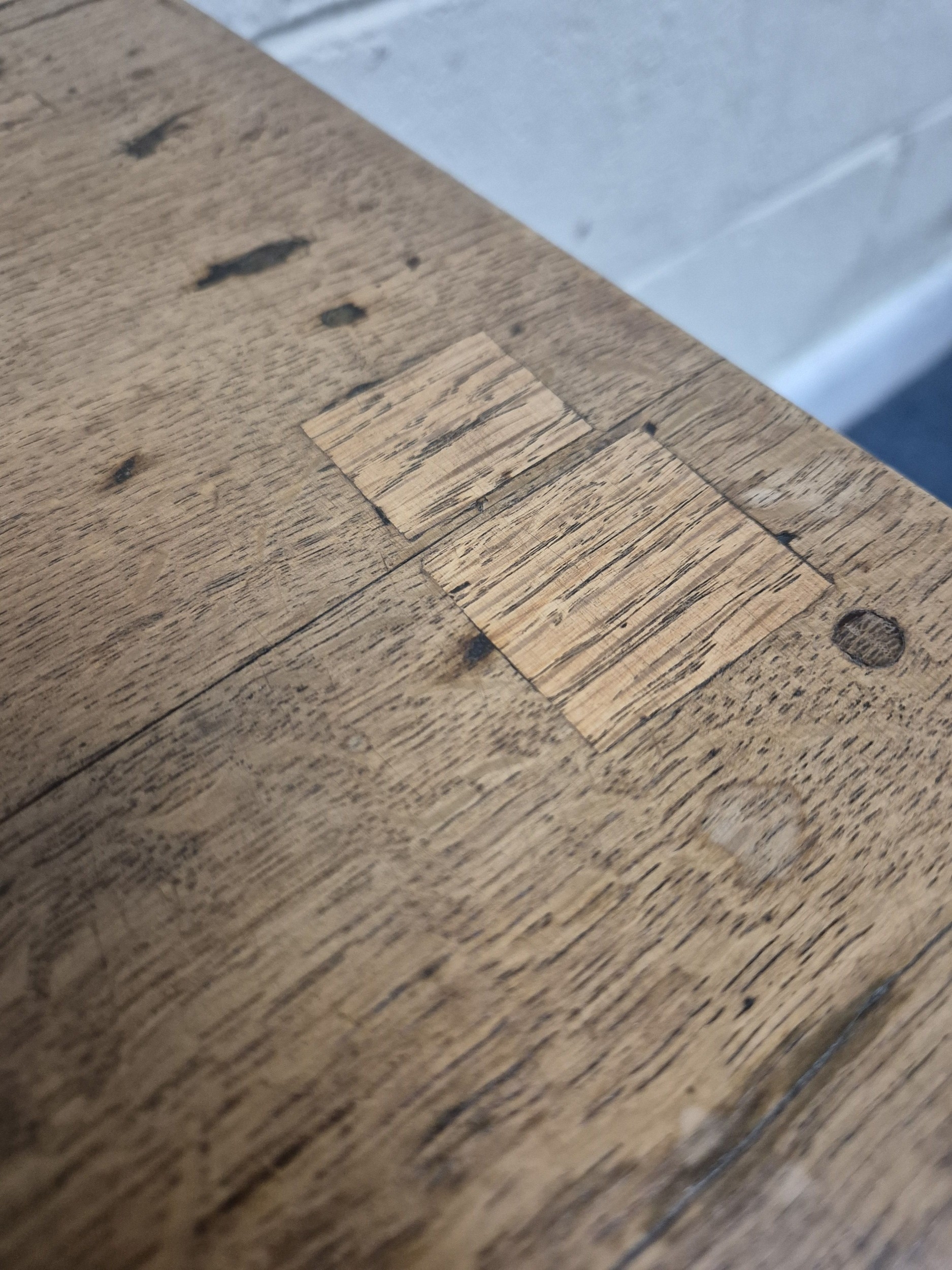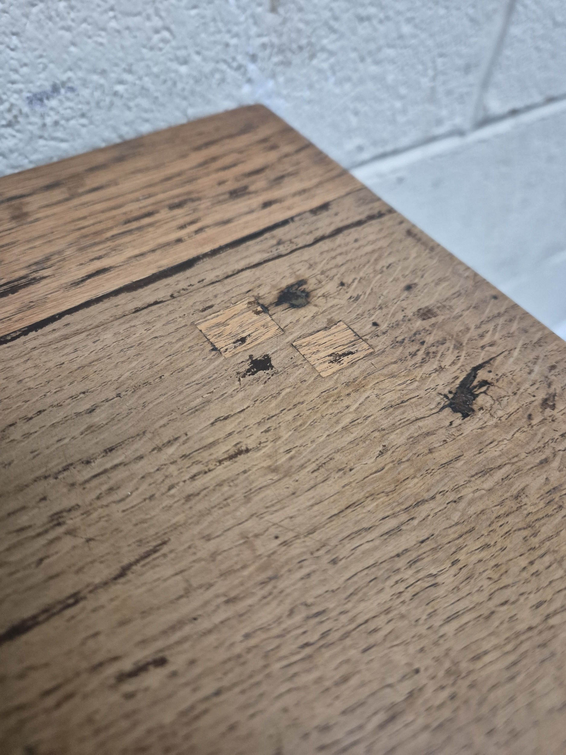 A GEORGIAN OAK LOWBOY, fitted with a single frieze drawer, raised on cabriole legs, width 69cm x depth 49cm x height 71cm, condition report: historical marks, scuffs, stains, splits, sun bleached, repairs, other wear and usage