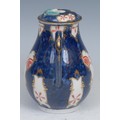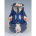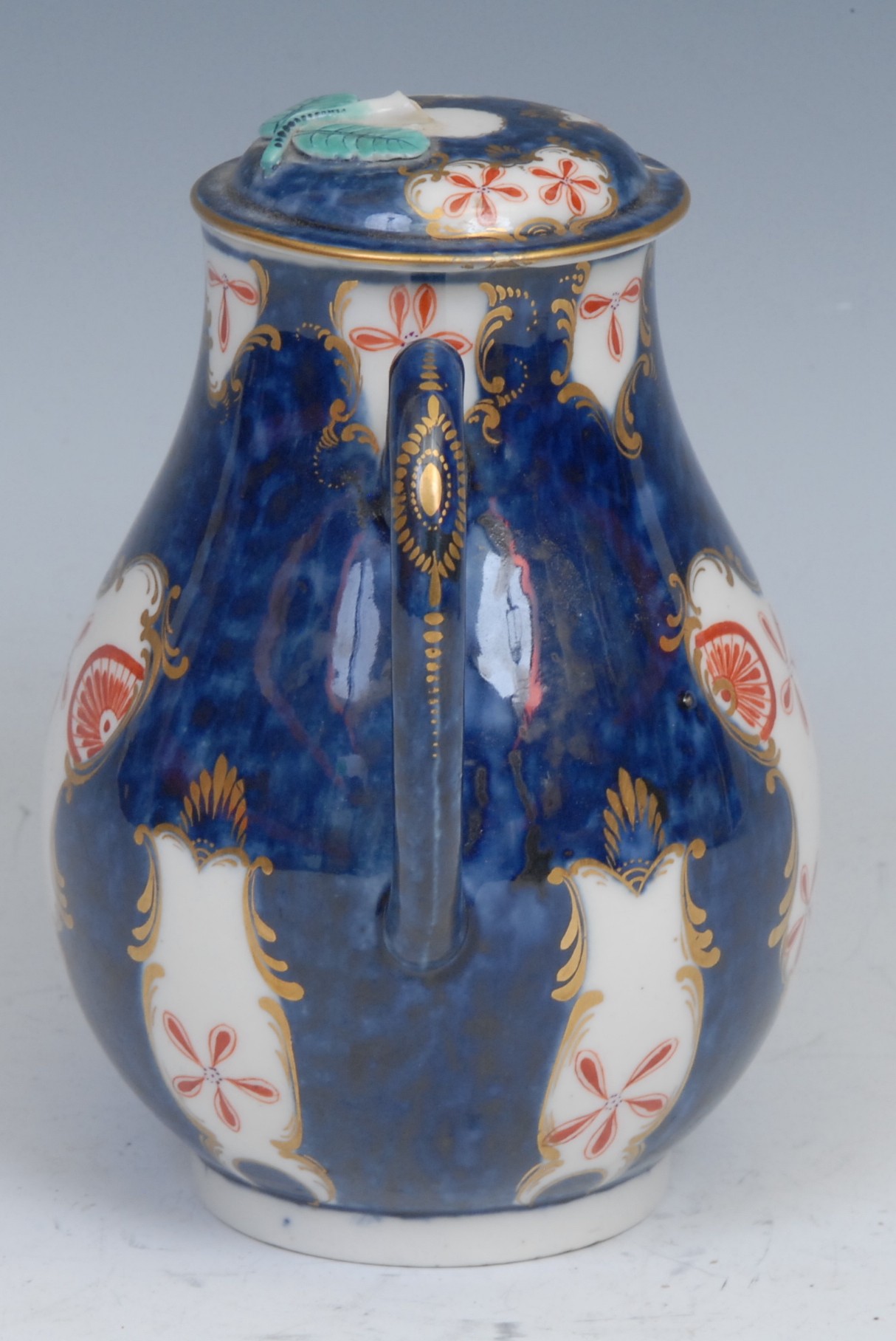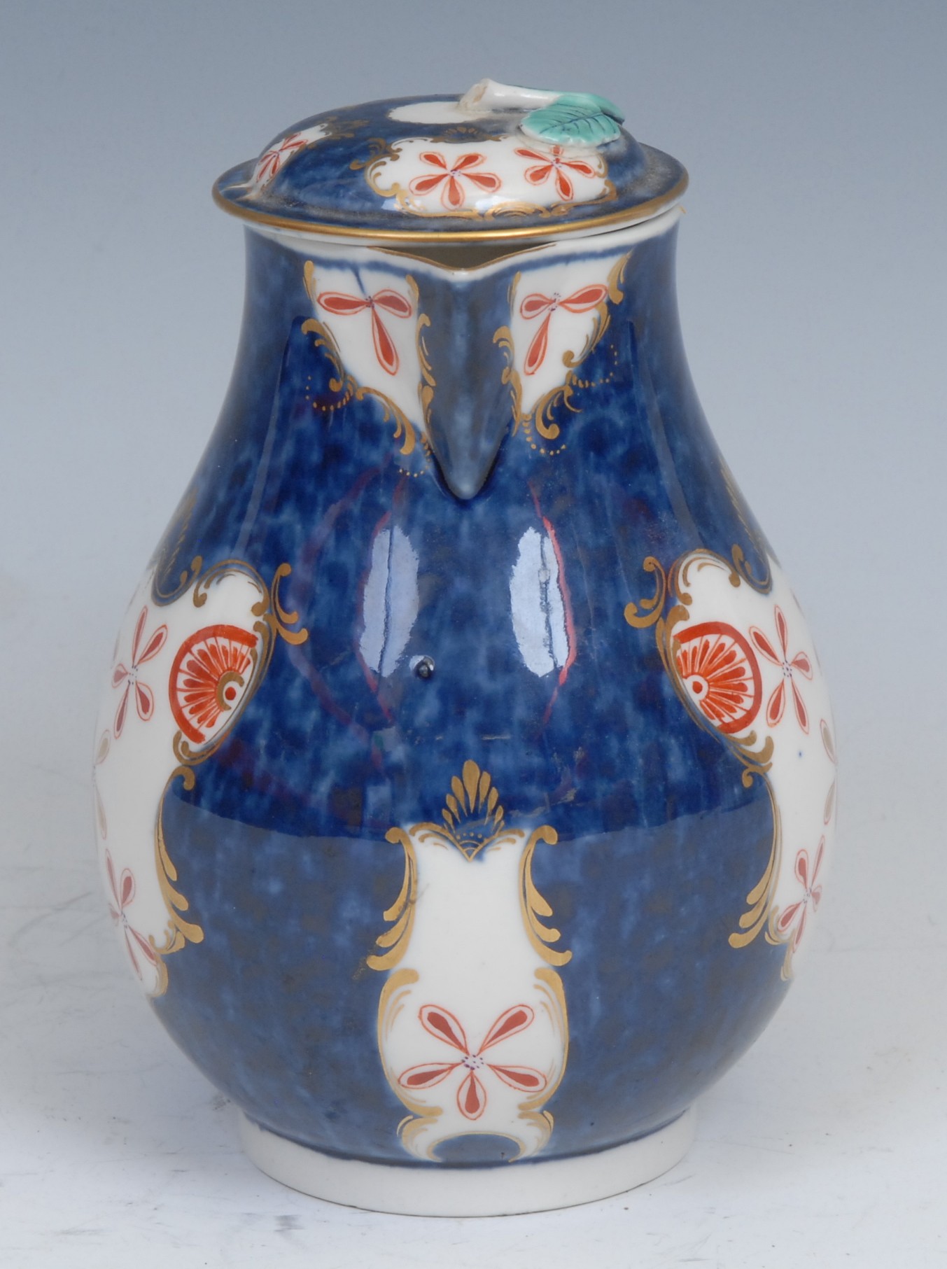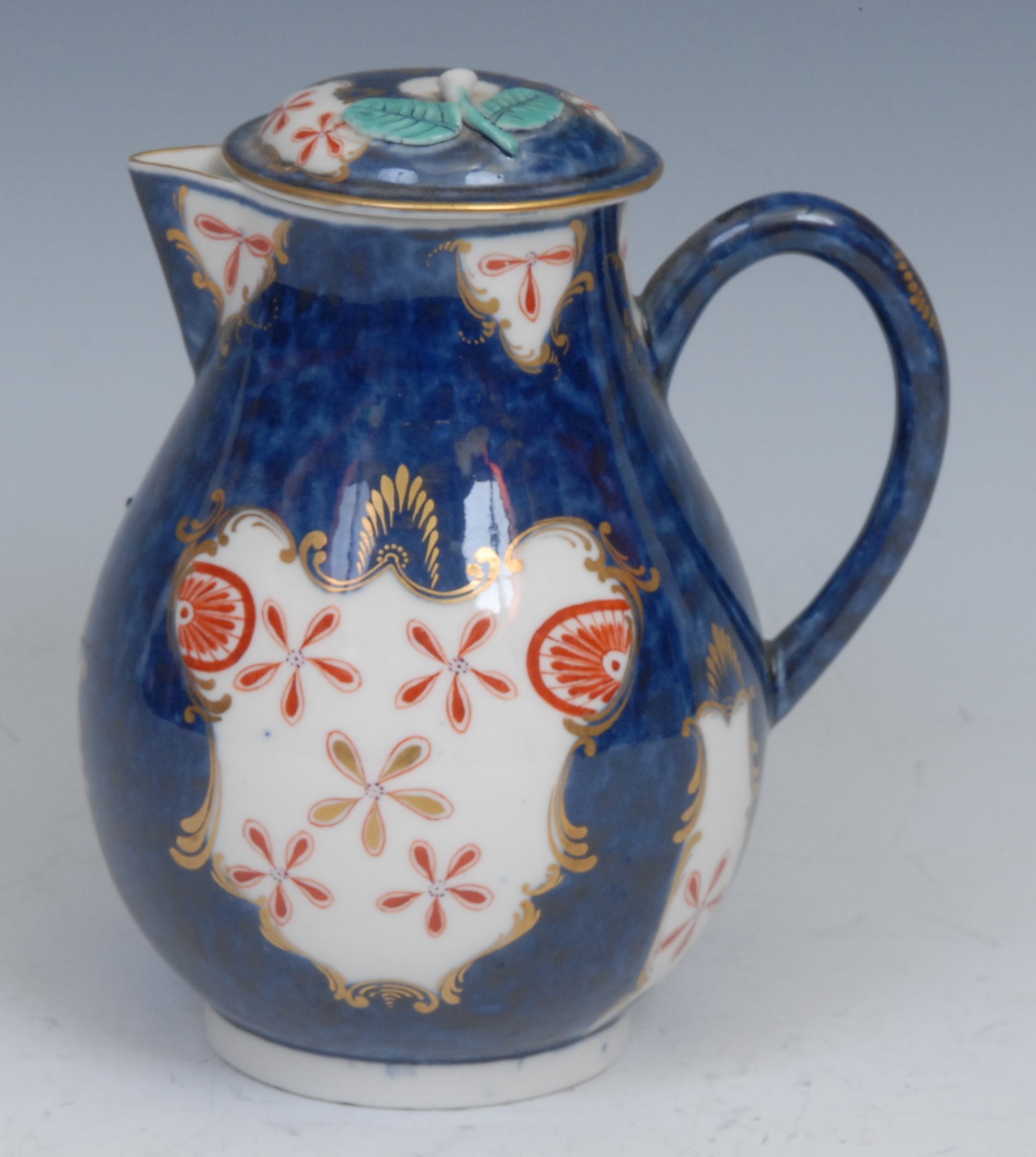 A Worcester Old Japan/Star pattern pear shaped sparrow beak milk jug and cover, decorated in the Imari palette with fan and vase shaped gilt cartouches with iron red and gilt stars and shell mons, scale blue ground, cover conforming, loop handle, 13cm high, square mark, c.1768