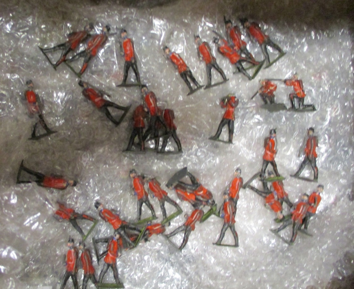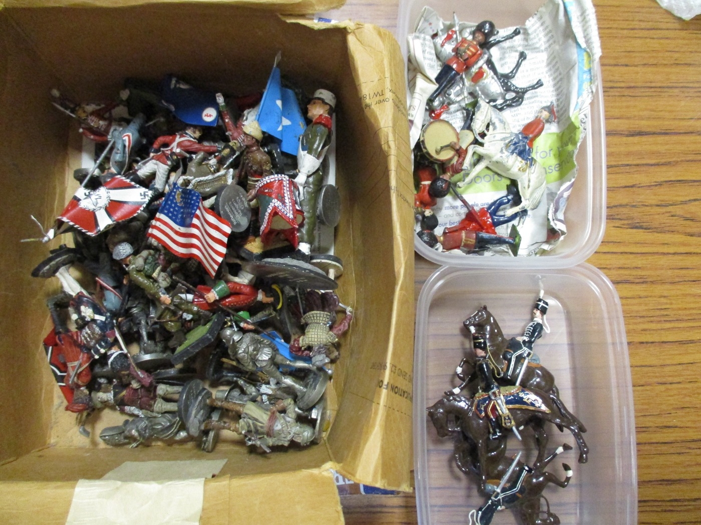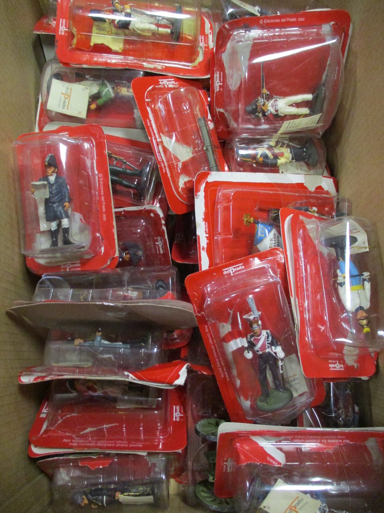 Collection including Del Prado and Britains, boxed and unboxed with mounted horses, foot soldiers, band, kneeling riflemen, farm yard animals, scenery etc play worn but generally good to better, viewing needed. (5B)