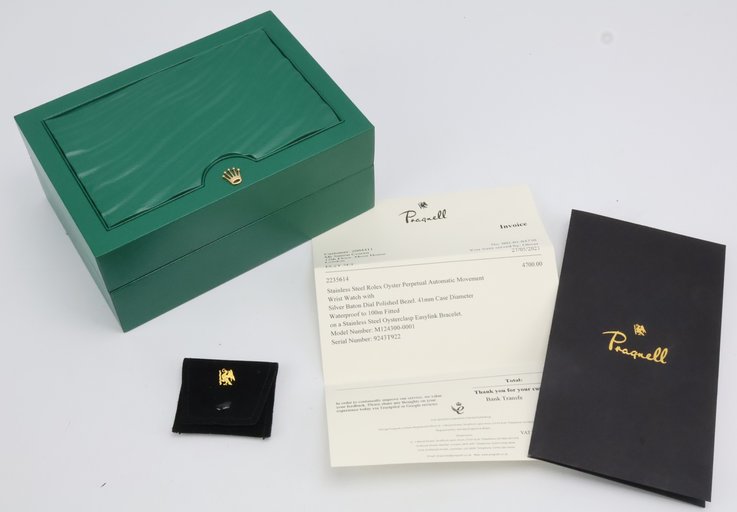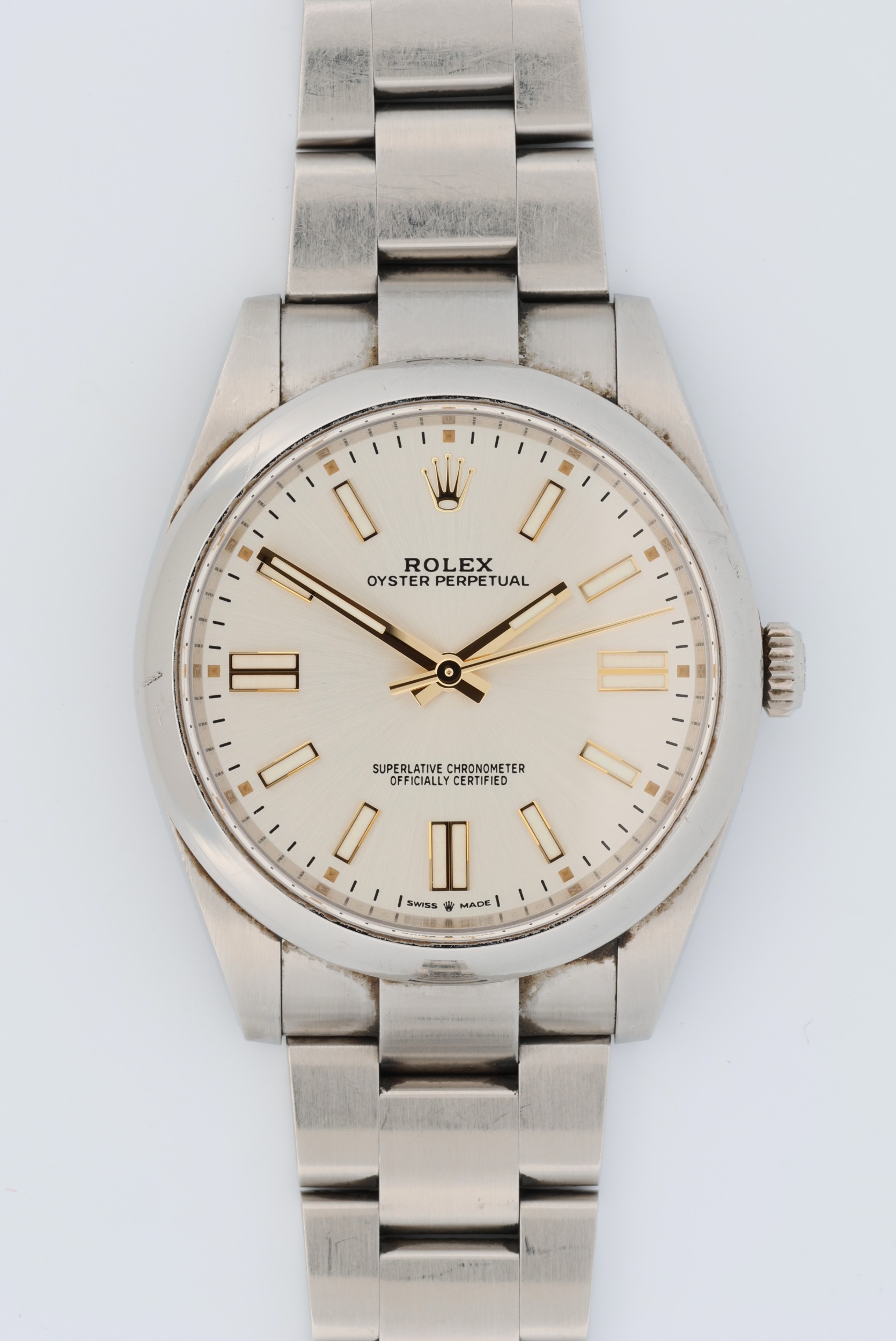 Rolex Oyster Perpetual 41, stainless steel, ref. 124300, 2021 card. The silver dial with luminous baton indices, gilt hands. Rolex automatic cal.3230 movement, Oyster bracelet, complete with box and paperwork. Working when catalogued