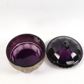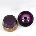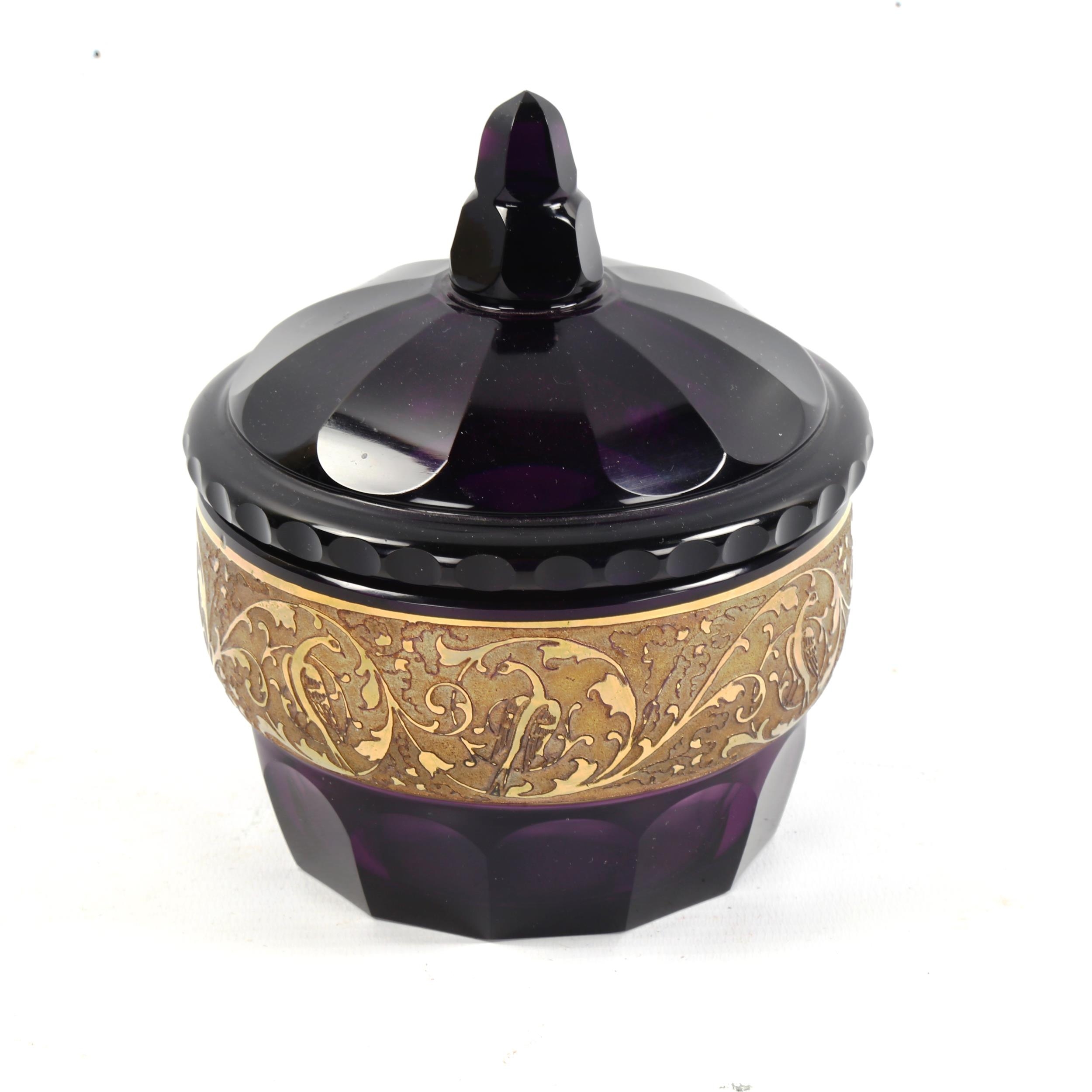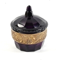 **DESCRIPTION CHANGE** *Johann Oertel* dark purple glass *Bird of Paradise* jar and cover, with oroplastic frieze depicting birds and scrolls, diameter 12cm