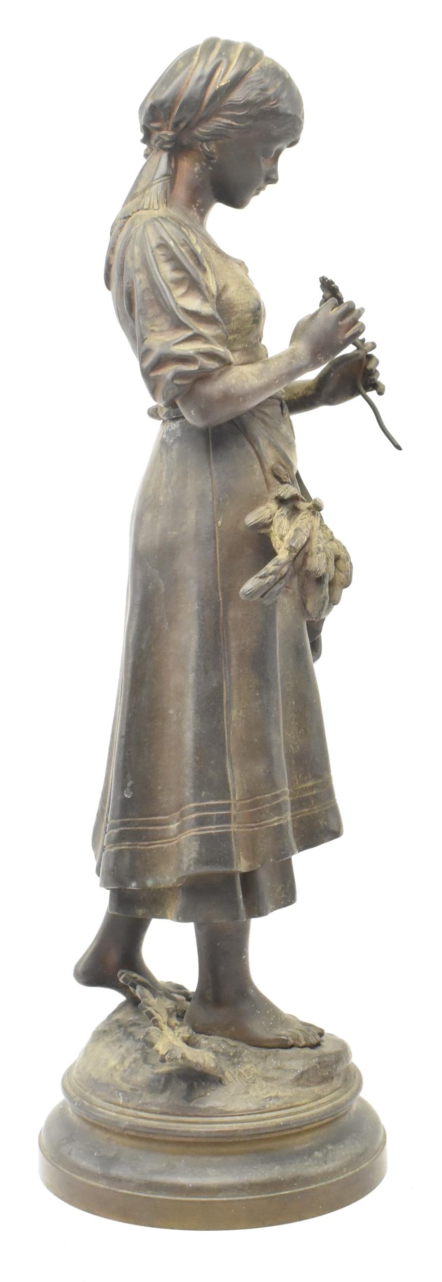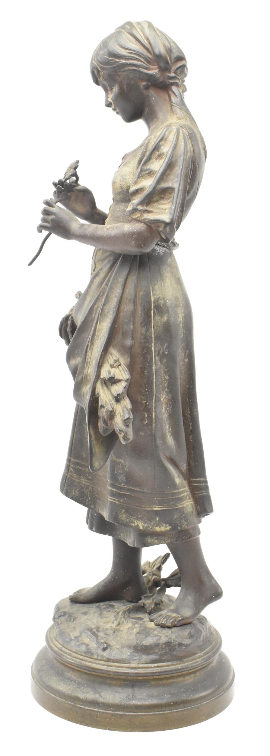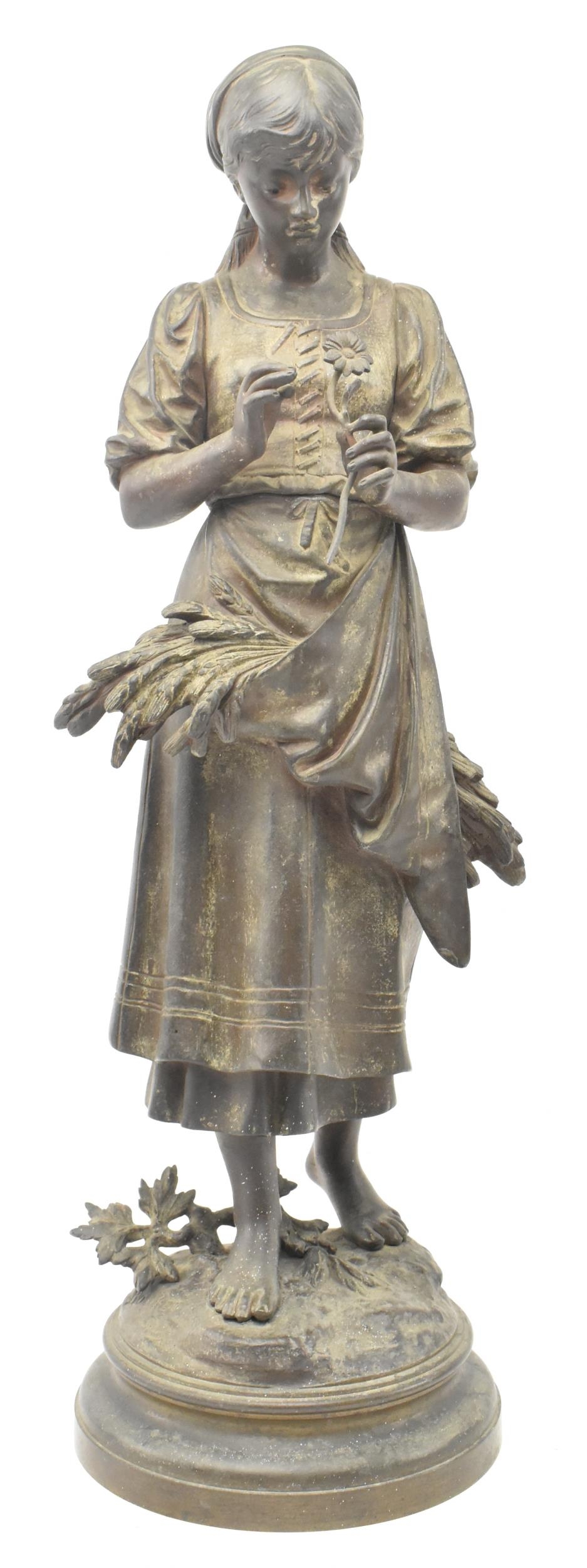 A French 19th century bronze figurine of a lady attributed to Eutrope Bouret. The figurine modelled a lady holding a flower in her hand with wheat in her wrap up apron. Signed Bouret to base. Measures approx. 44cm tall.