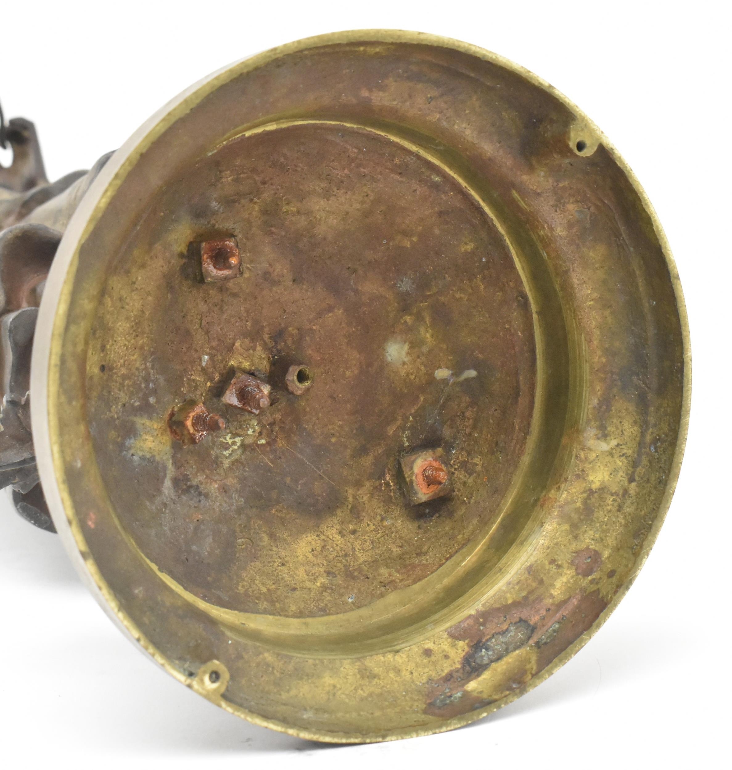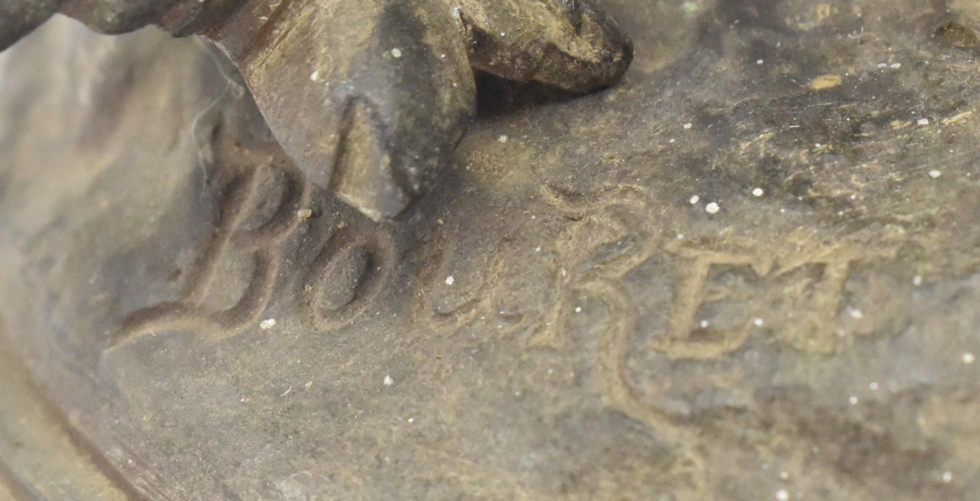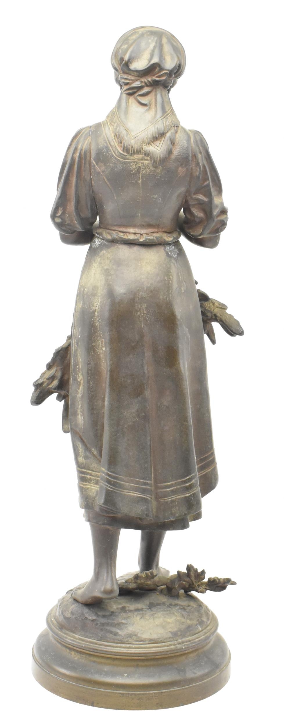 A French 19th century bronze figurine of a lady attributed to Eutrope Bouret. The figurine modelled a lady holding a flower in her hand with wheat in her wrap up apron. Signed Bouret to base. Measures approx. 44cm tall.