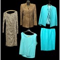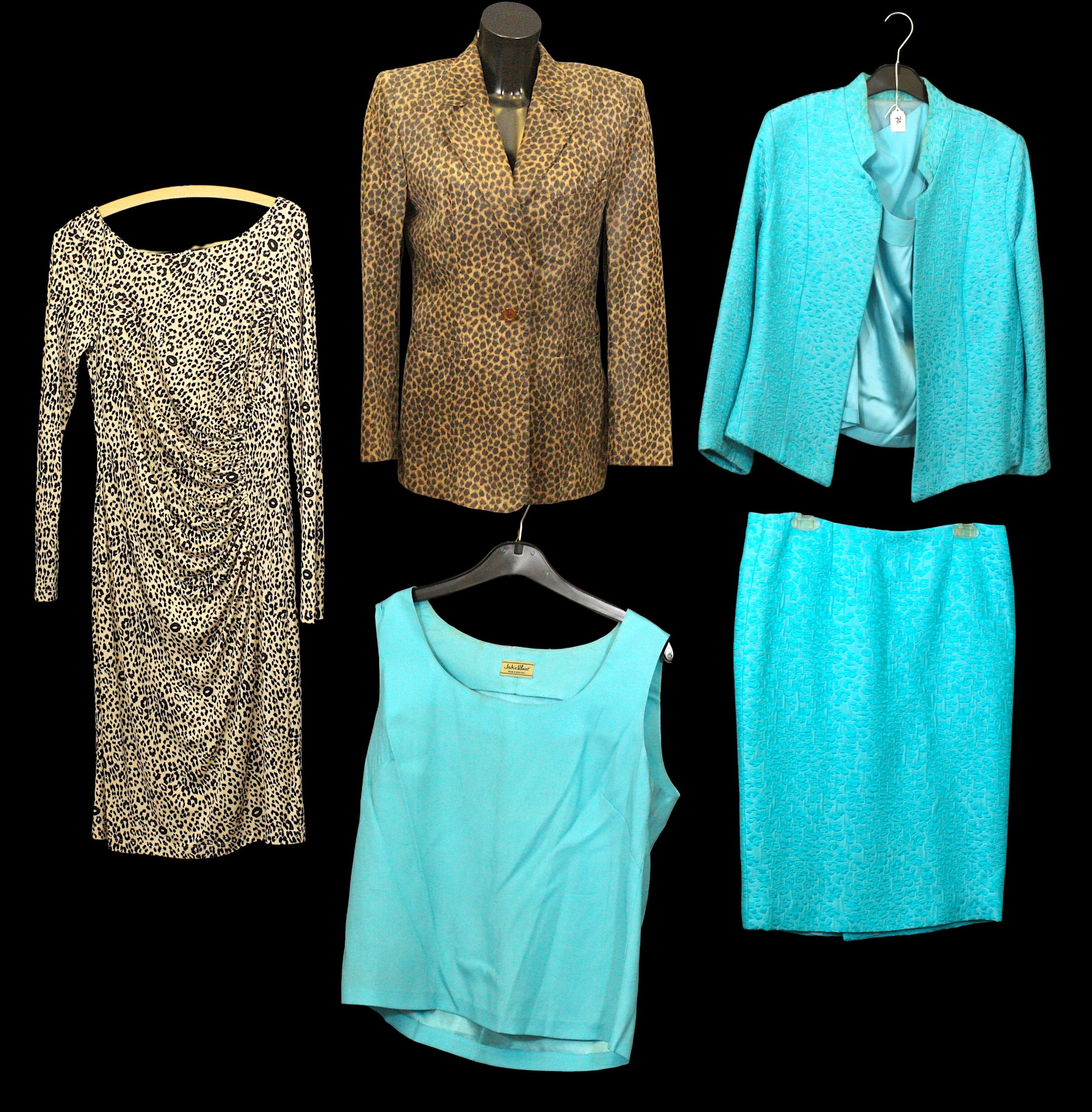 Designer and High Street Fashion: A collection of four animal print pattern garments, together with two further, including: a Jackie Palmer two piece skirt suit, with collarless jacket and pencil skirt, together with a turquoise sleeveless top; an LK Bennett leopard print dress, UK 12; and an Escada Margaretha Ley suede leather blazer, brown animal print, size 36, together with an Escada cream coloured silk sleeveless top, size 38 (6)
