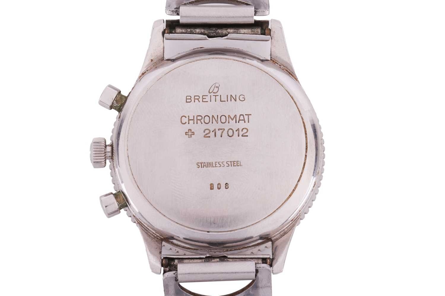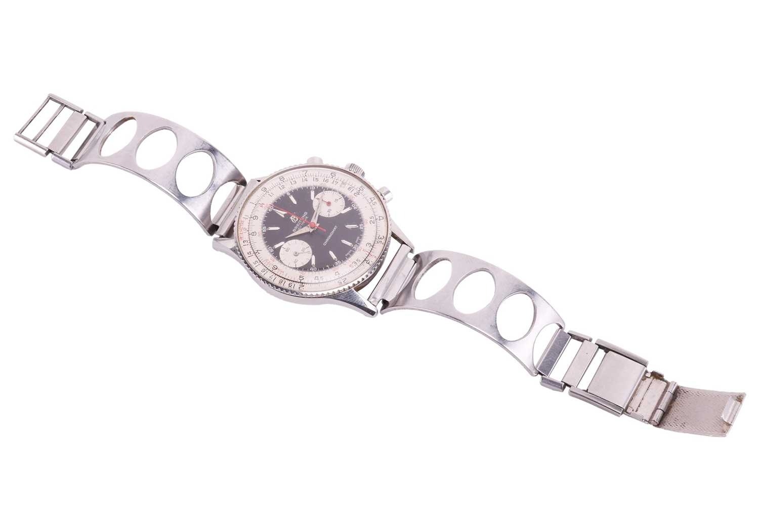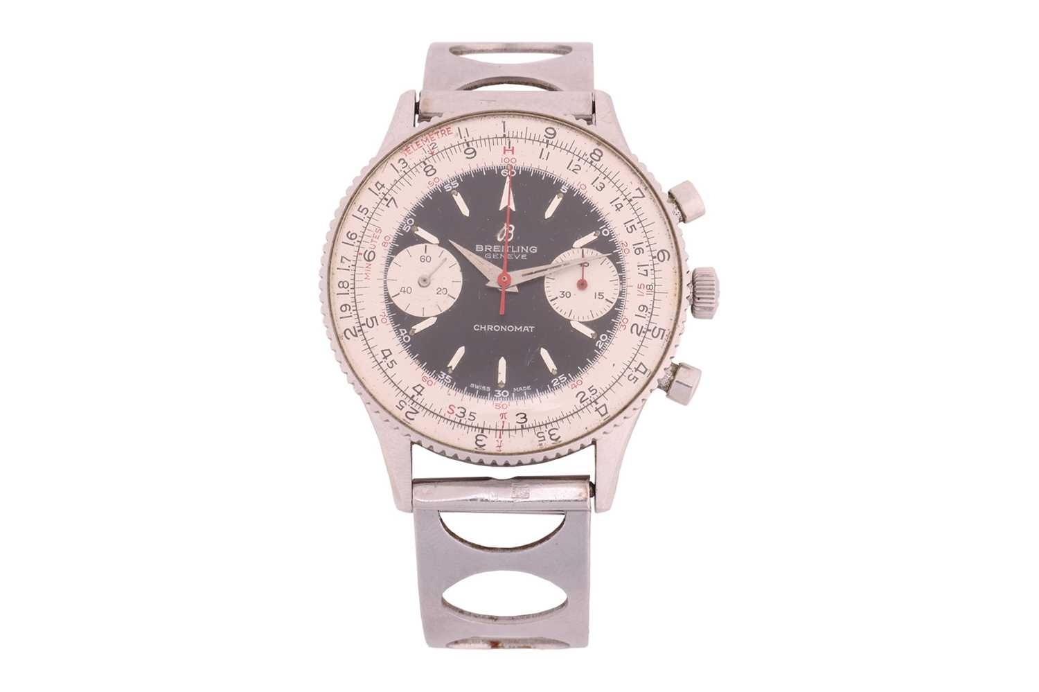 A Breitling Chronomat 808 Venus 175 black dial 1960’s Model: 808 - 217012 Serial: 1074937 Year: 1960's Case Material: Steel Case diameter: 37.5mm Dial: Black Numerals: Arabic Movement: Manual Functions: Chronograph, Telemetre Strap: Vintage rally steel strap Buckle: Folding No box, no papers. The watch appears to be in good working order, no long-term tests have been performed and accuracy cannot be guaranteed, a full service is advised on all watches and pocket watches once purchased. The watch functions appear to be working correctly although the pushers are a little stiff, it needs a service. Glass is worn with plenty of scratches, no major cracks No major damage to the case Surface scratches & wear consistent with age The online condition report may not mention mechanical replacements or imperfections to the movement, case, dial, pendulum, separate base(s) or dome. Watches with water-resistant cases may have been opened to examine movements, but no warranties are given regarding their water resistance. It is also important to note that we cannot guarantee the authenticity or originality of individual components, such as wheels, hands, crowns, crystals, screws, bracelets, and wristbands, since subsequent repairs and restoration may have changed the original components. Also, we cannot guarantee the authenticity or originality of any engraving or re-engraving on watch cases, case backs, bracelets, straps or internal movements.