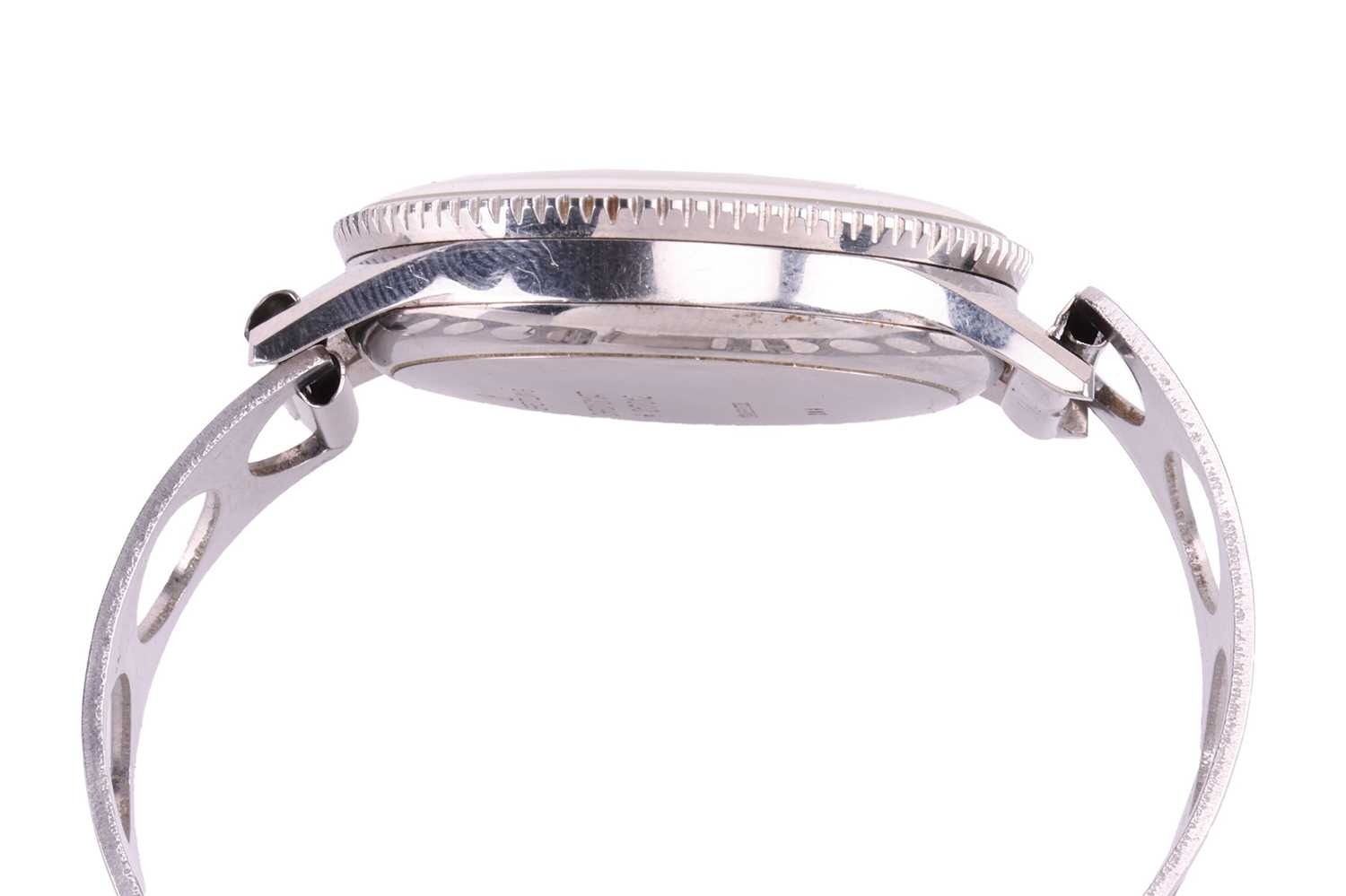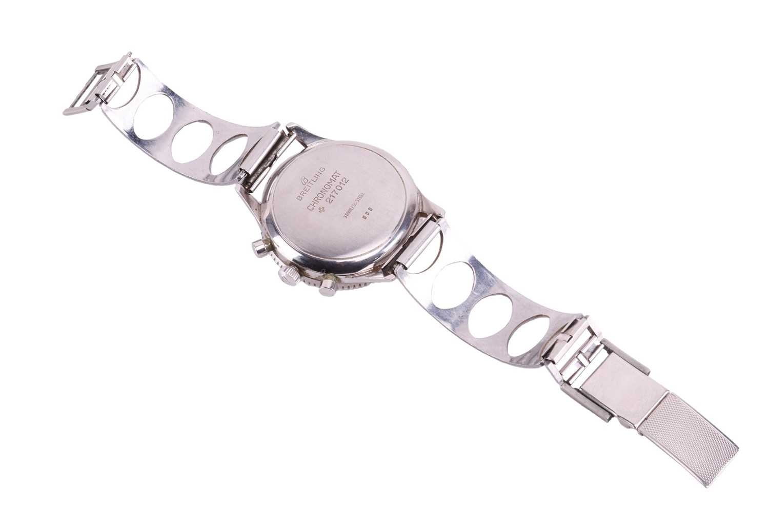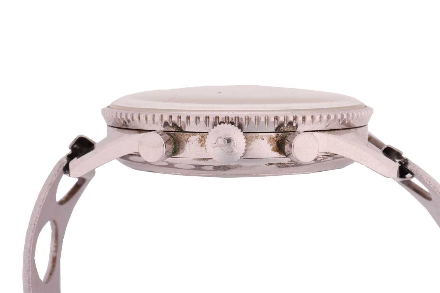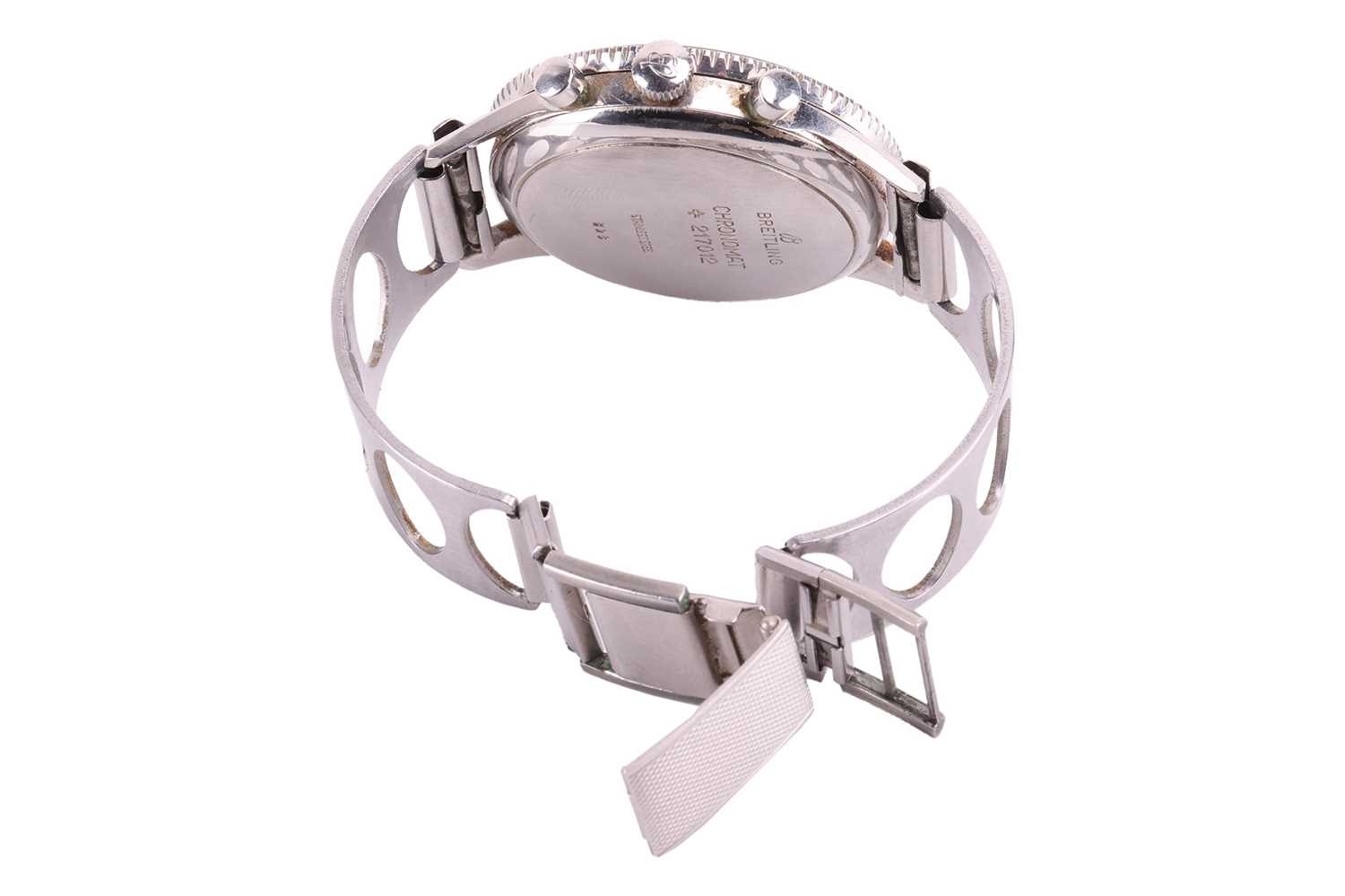 A Breitling Chronomat 808 Venus 175 black dial 1960’s Model: 808 - 217012 Serial: 1074937 Year: 1960's Case Material: Steel Case diameter: 37.5mm Dial: Black Numerals: Arabic Movement: Manual Functions: Chronograph, Telemetre Strap: Vintage rally steel strap Buckle: Folding No box, no papers. The watch appears to be in good working order, no long-term tests have been performed and accuracy cannot be guaranteed, a full service is advised on all watches and pocket watches once purchased. The watch functions appear to be working correctly although the pushers are a little stiff, it needs a service. Glass is worn with plenty of scratches, no major cracks No major damage to the case Surface scratches & wear consistent with age The online condition report may not mention mechanical replacements or imperfections to the movement, case, dial, pendulum, separate base(s) or dome. Watches with water-resistant cases may have been opened to examine movements, but no warranties are given regarding their water resistance. It is also important to note that we cannot guarantee the authenticity or originality of individual components, such as wheels, hands, crowns, crystals, screws, bracelets, and wristbands, since subsequent repairs and restoration may have changed the original components. Also, we cannot guarantee the authenticity or originality of any engraving or re-engraving on watch cases, case backs, bracelets, straps or internal movements.