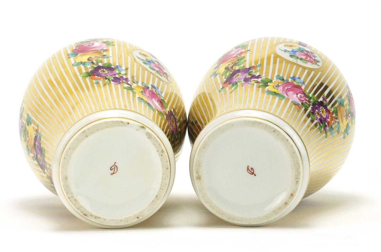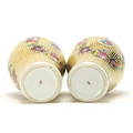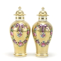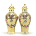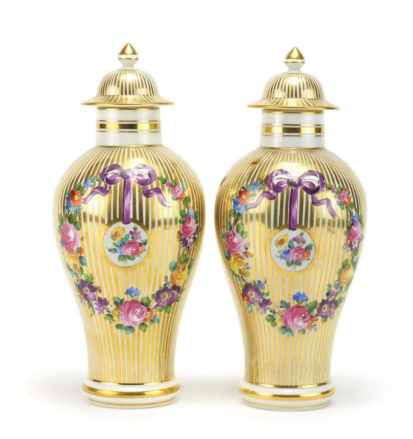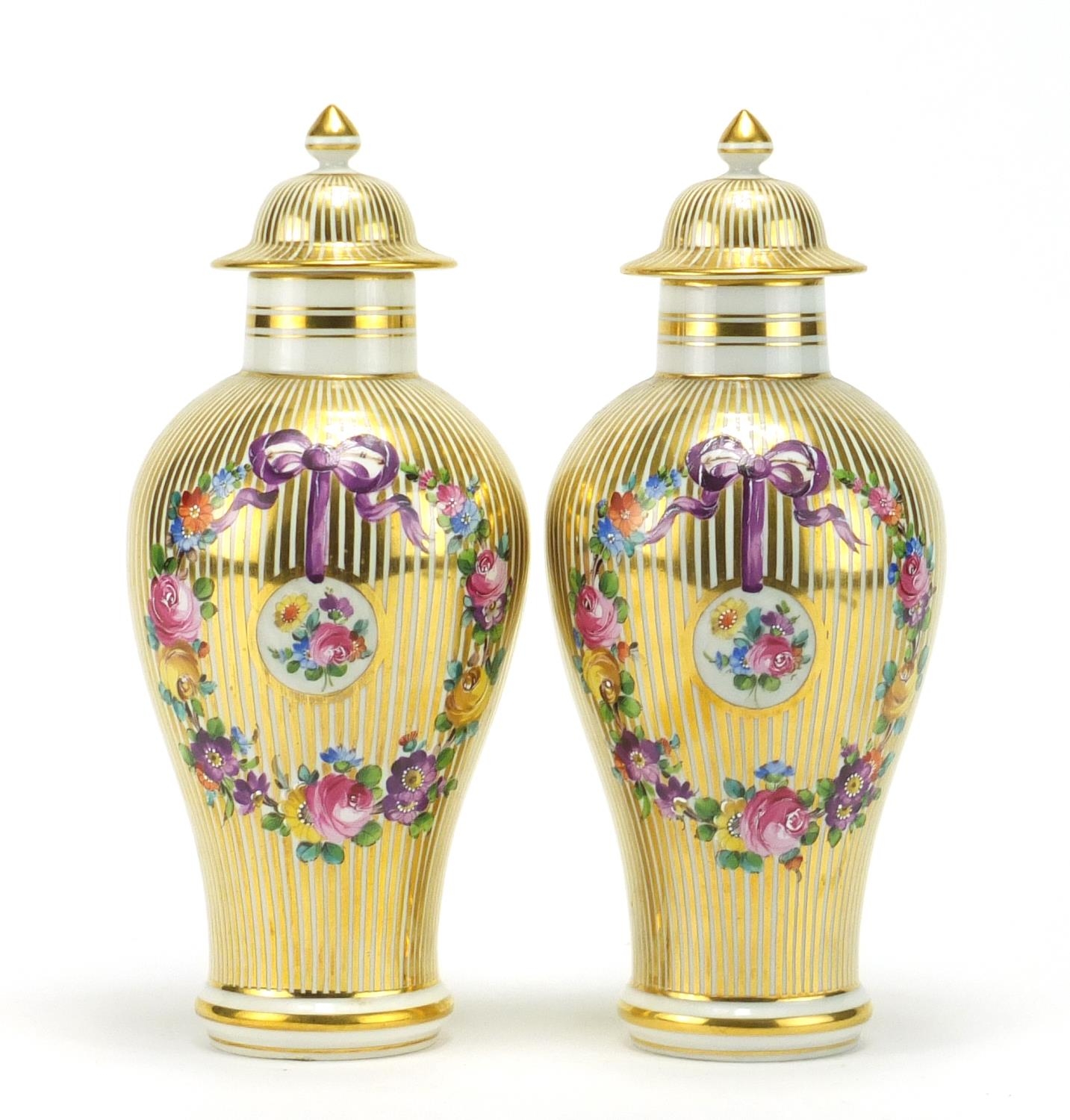 Pair of 19th century style baluster vases and covers, each hand painted and gilded with ribbons and flowers, each 23.5cm high