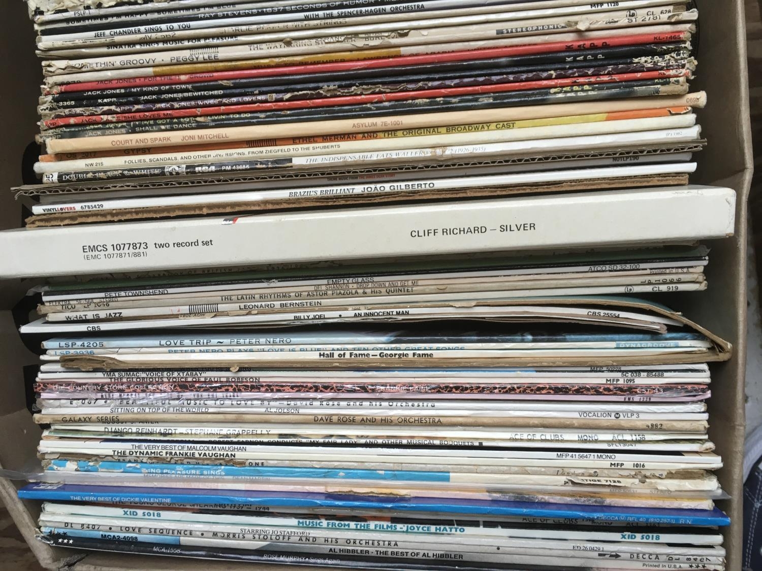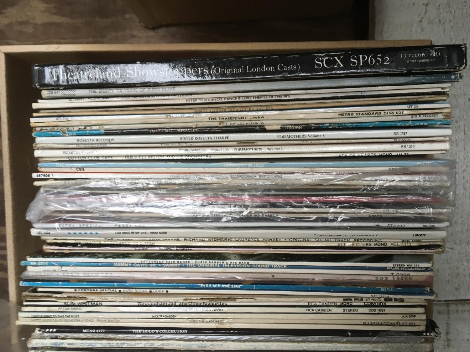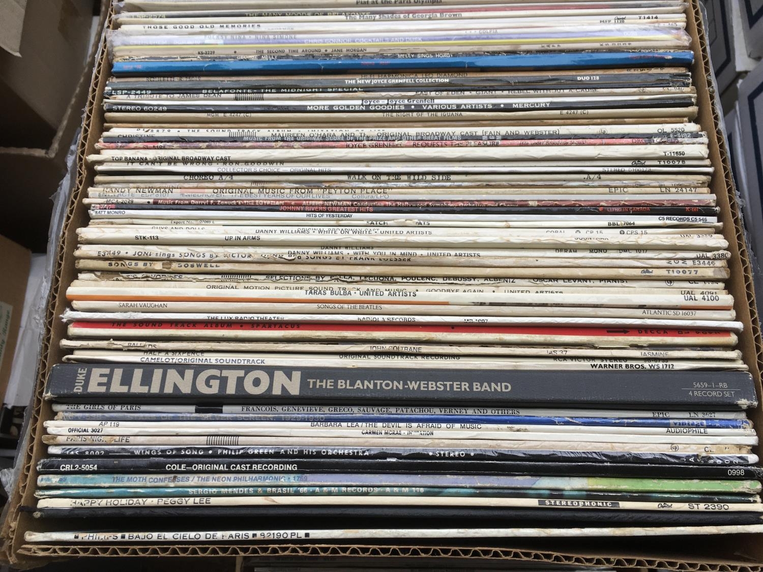 Four boxes of LPs by various artists including many jazz titles and show soundtracks.