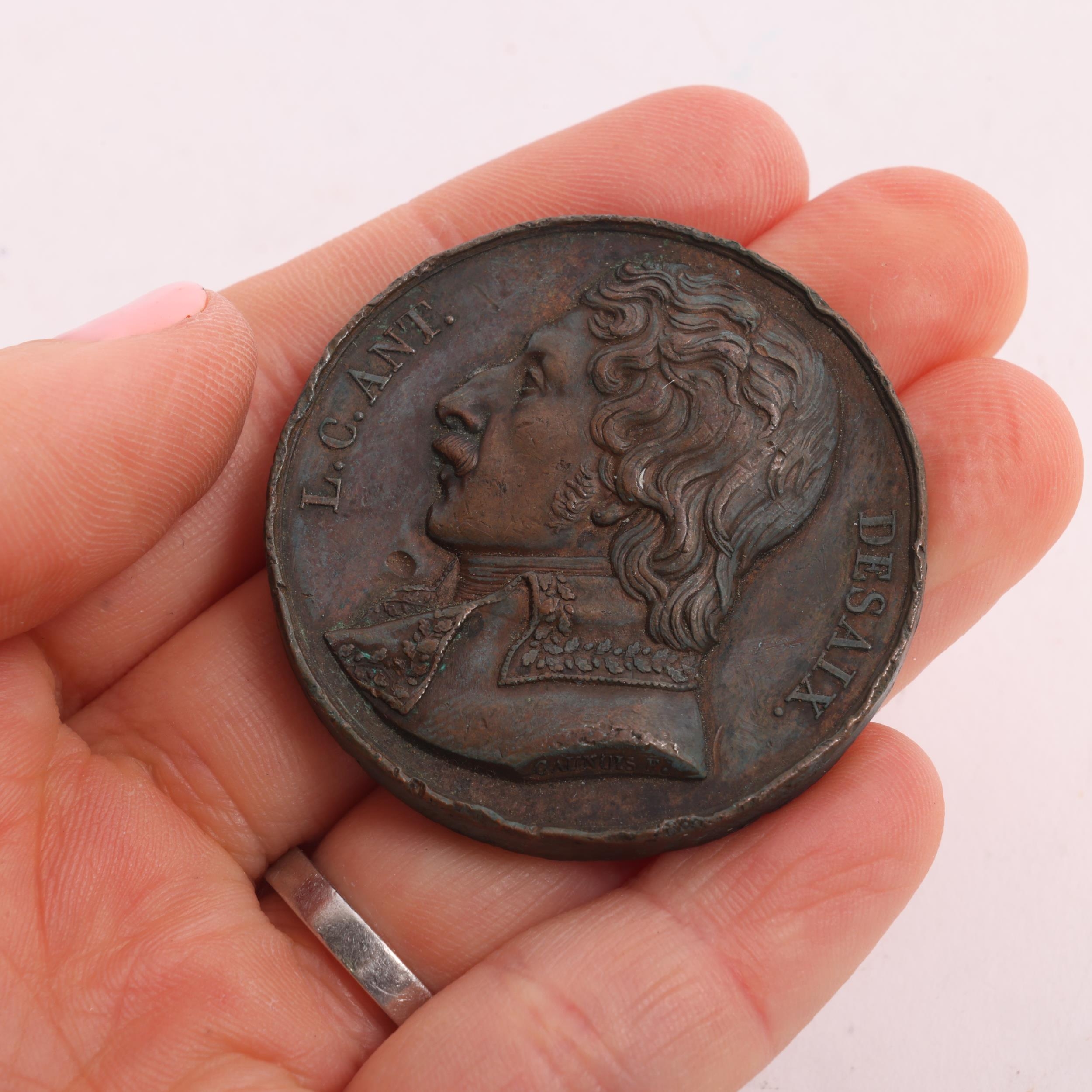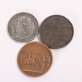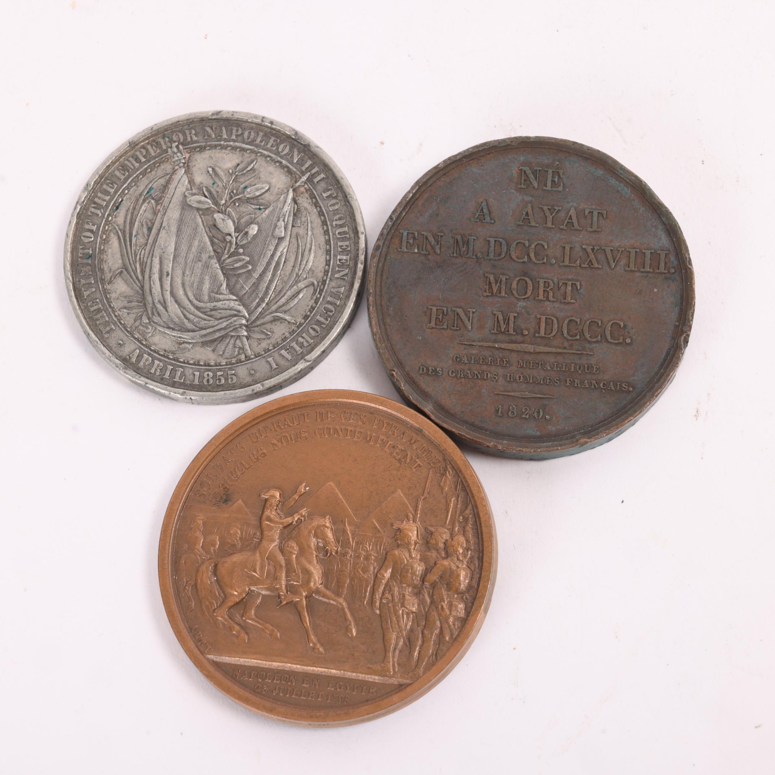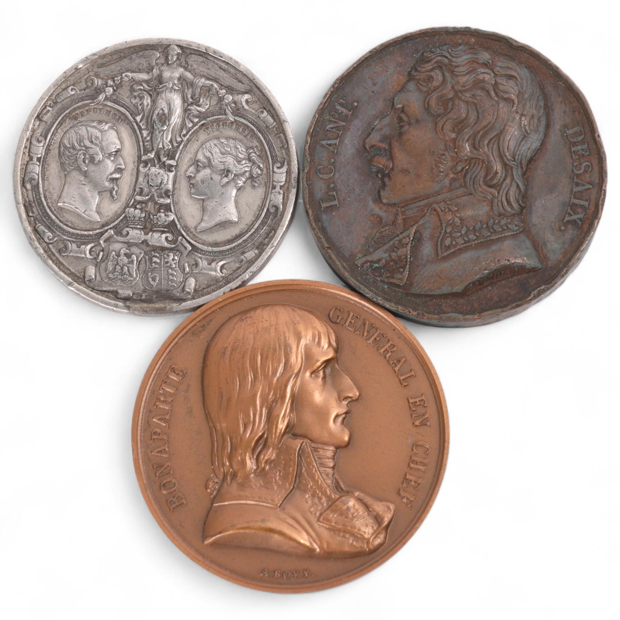 3 Napoleonic medals, Napoleon in Egypt 1798, a bronze medal by A. Bovy [struck 1841-2], dia 42mm and General Desaix bronze medal 1820, dia 41mm and silver 1855 Napoleon III visit to Great Britain, dia 38.5mm