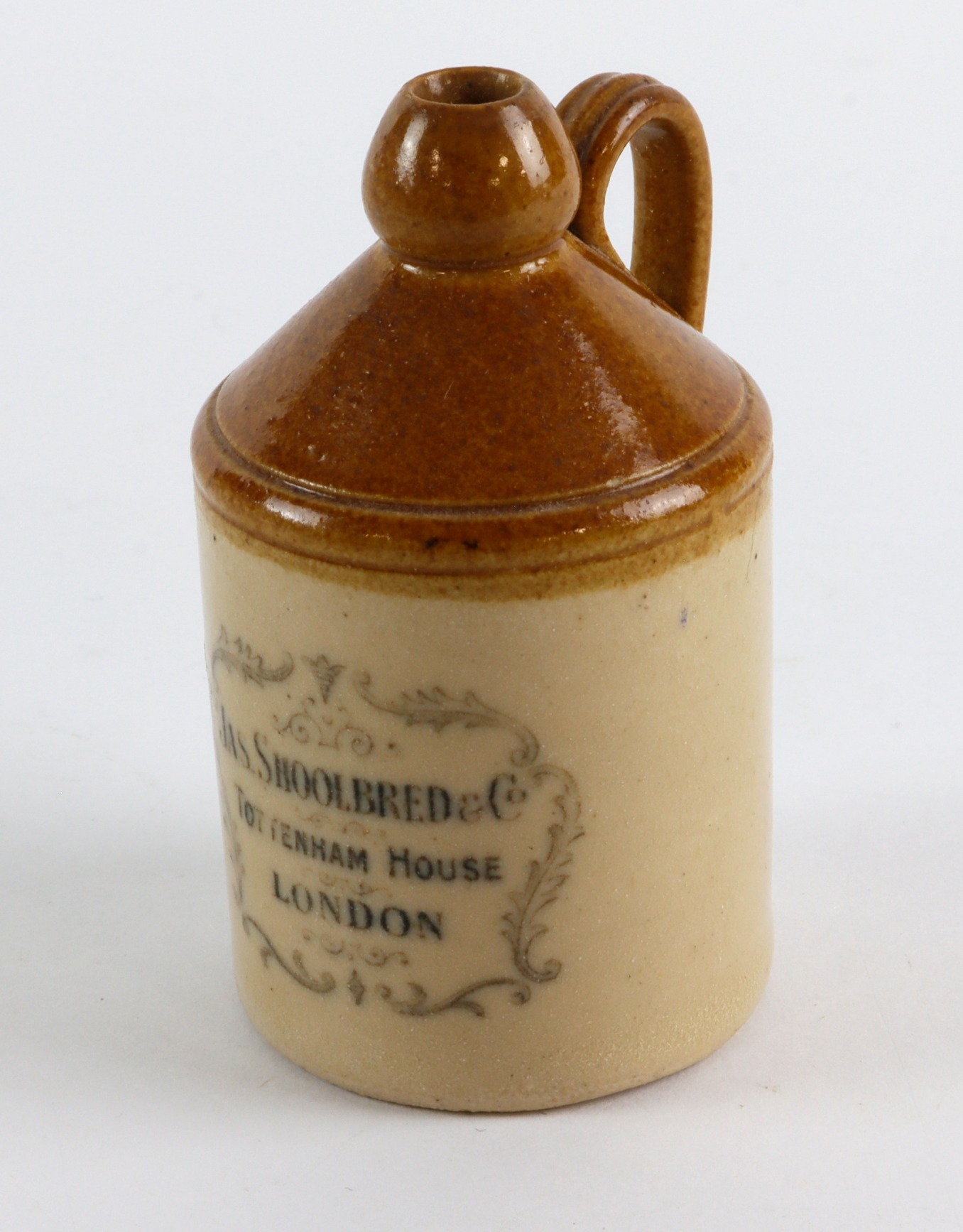 Miniature Promotional Stoneware Flagon, "Jas Shoolbred & Co Tottenham House, London", has a minute chip to the rim, an unusual item