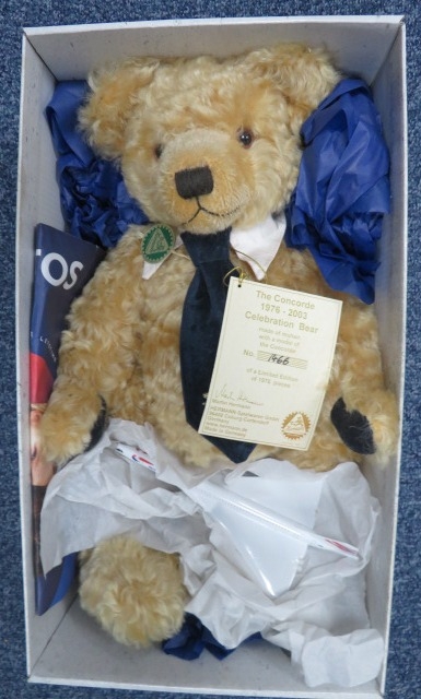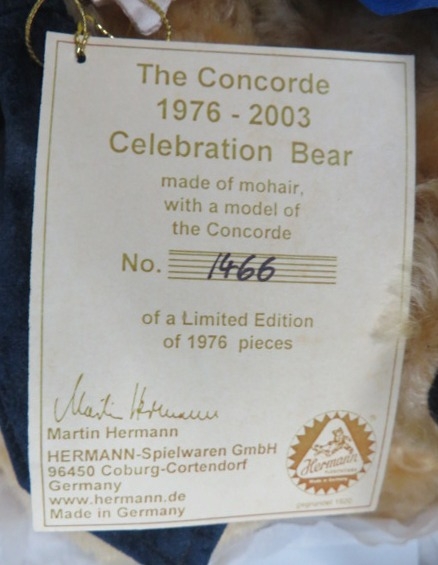 2003 Hermann-Spielwaren GmbH The Concorde Celebration Teddy Bear, mohair with felt tie, limited edition 1466 of 1976, plus Corgi diecast British Airways Concorde and photos, generally excellent to good plus. Contents appear complete but unchecked. Viewing recommended.