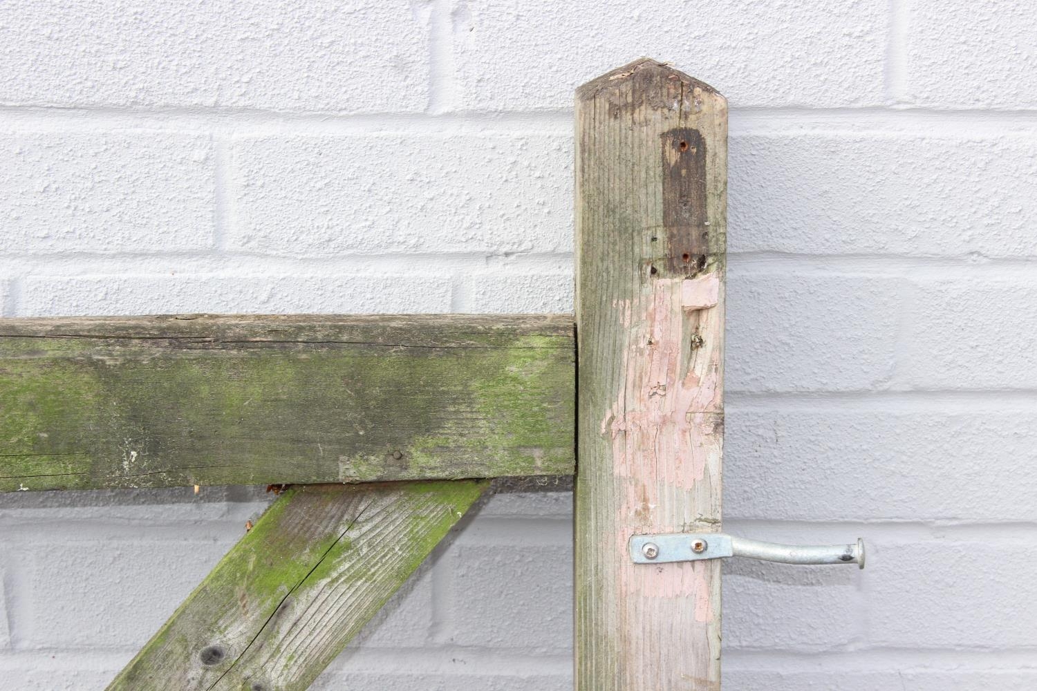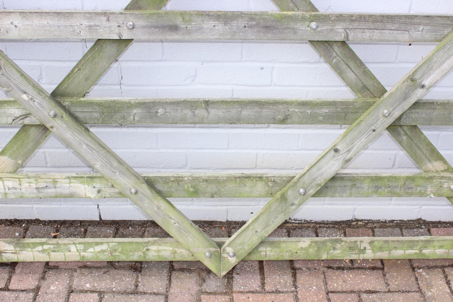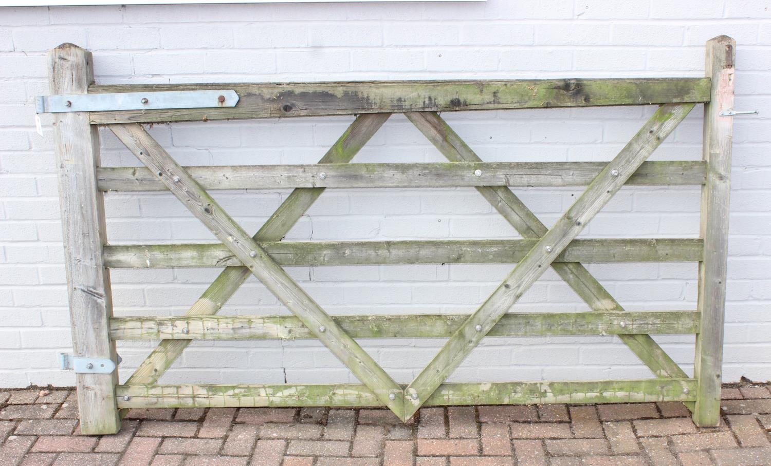 Weathered five bar wooden garden gate, 203cm wide x 122cm tall
