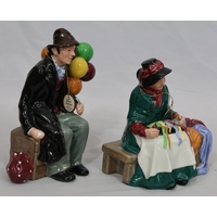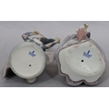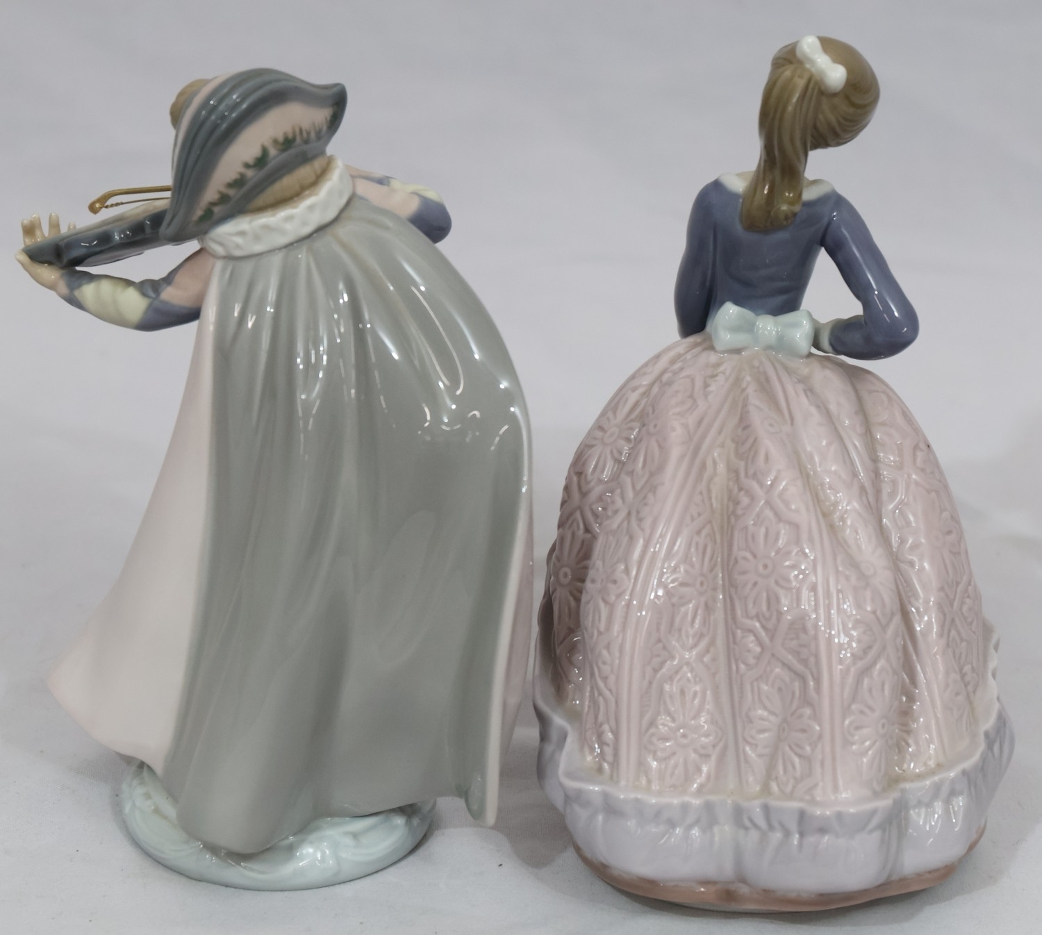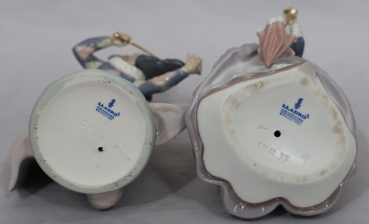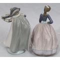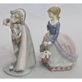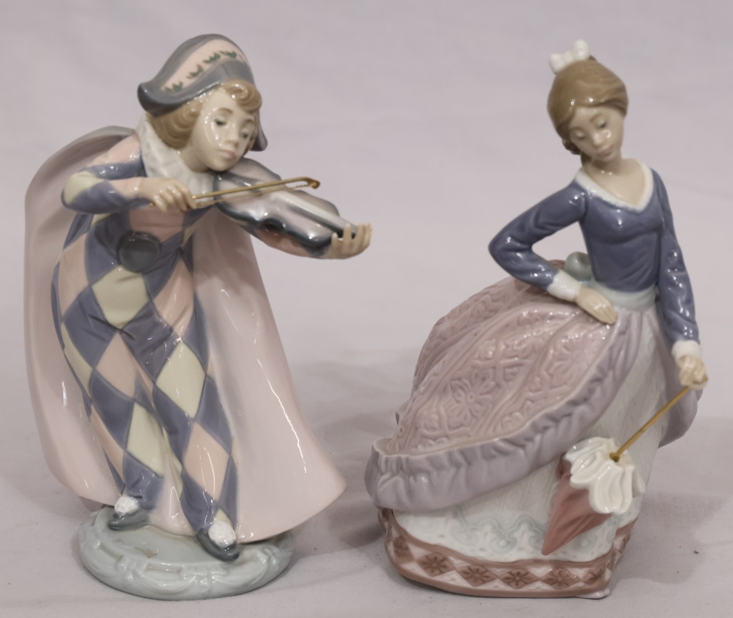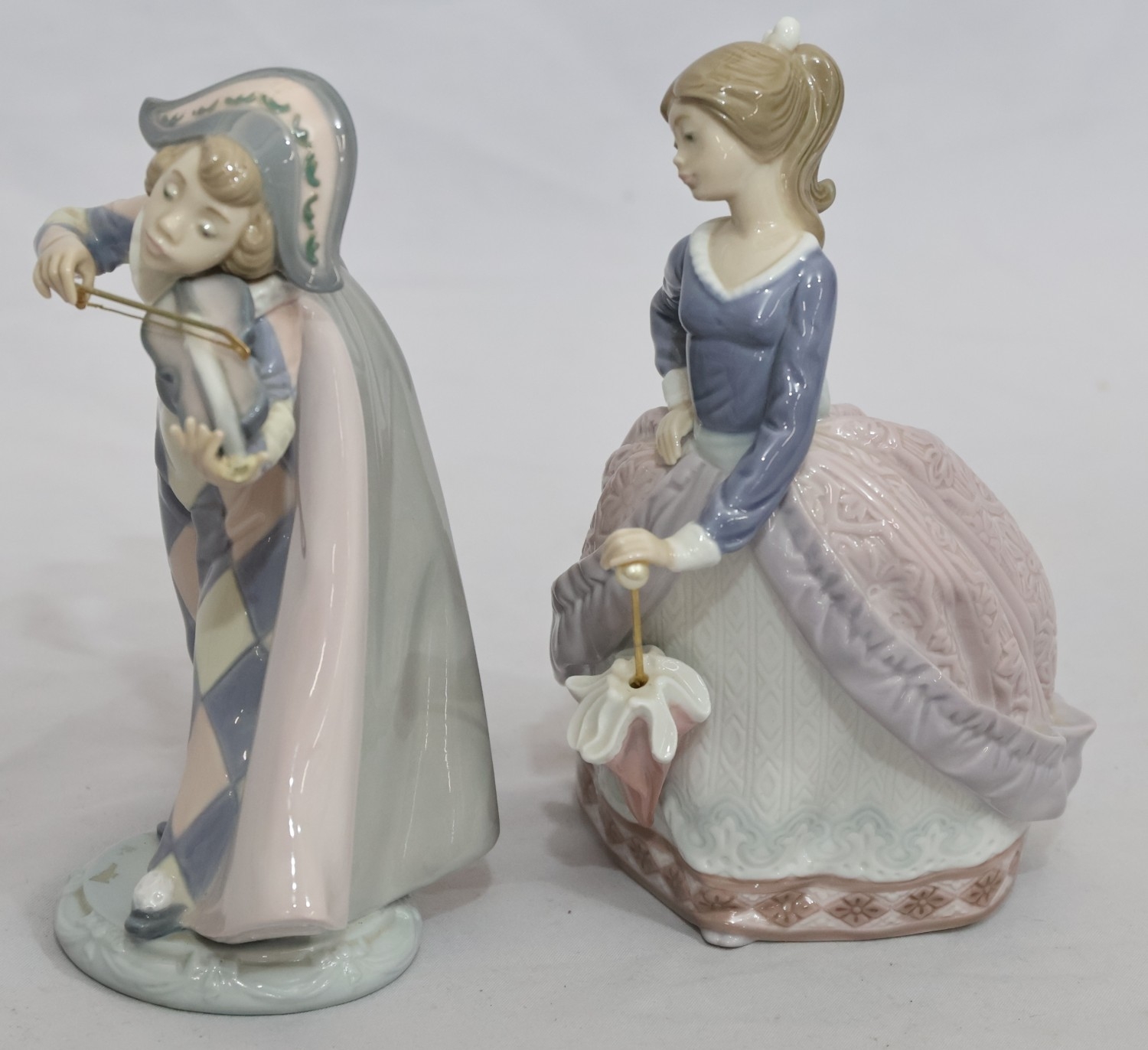 A Lladro figure of a young standing lady holding a parasol, 18cm high and another Lladro figure of a young Pierrot boy playing violin (end to violin a/f) (2)