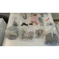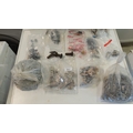 An assortment of hardware fittings and fasteners comprising bagged nuts, bolts, screws and assorted fittings, together with a group of concealed cabinet hinges, some in original packaging.