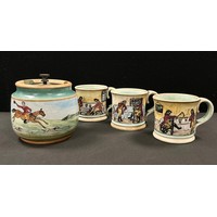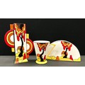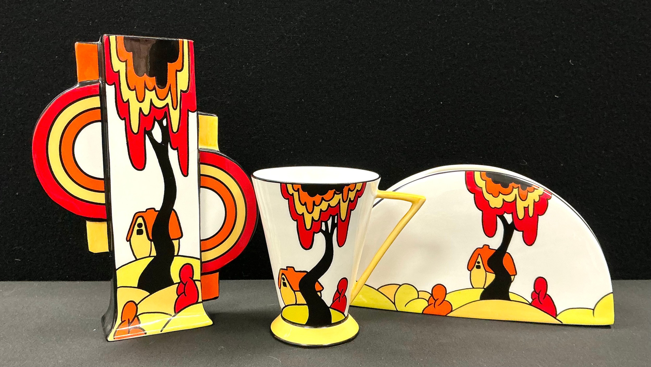 A Brian Woods reproduction Art Deco Clarice Cliff style vase, crescent shaped vase and mug (3)