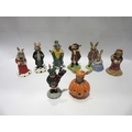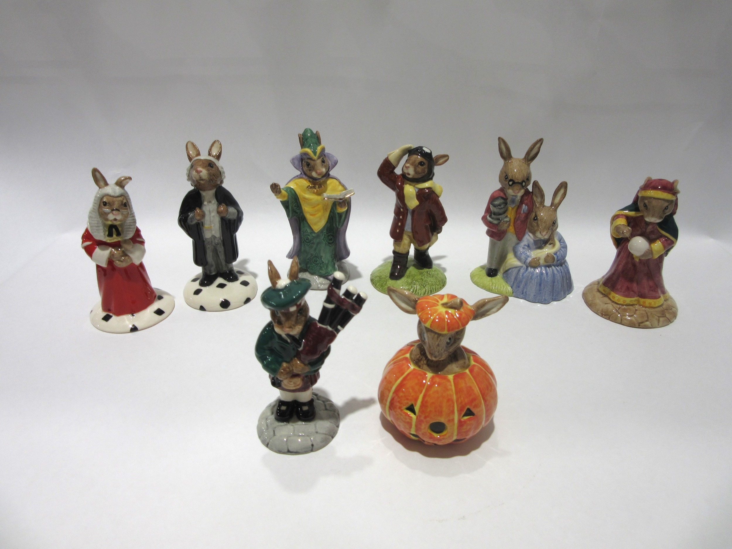 Eight Royal Doulton Bunnykins figures - "Father, Mother & Victoria Bunnykins", "Fortune Teller Bunnykins", "Mystic Bunnykins", "Lawyer Bunnykins", "Judge Bunnykins", "Piper Bunnykins", "Halloween Bunnykins" and "Airman Bunnykins"