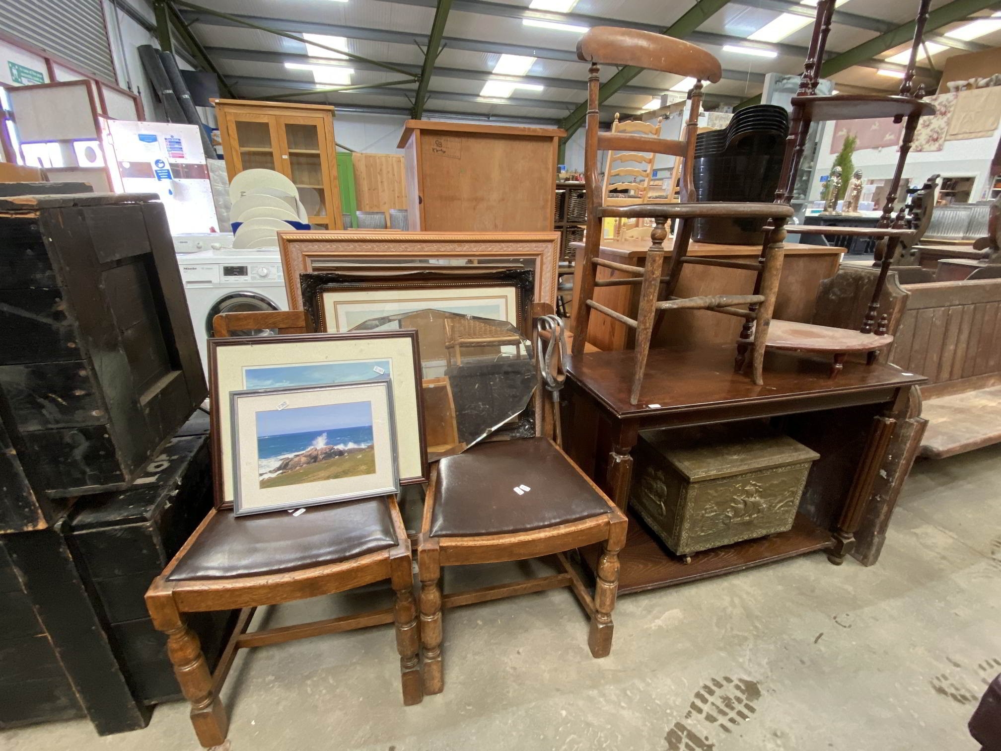 Assorted furniture including an oak console table 76H 96W 42D, brass coal box etc